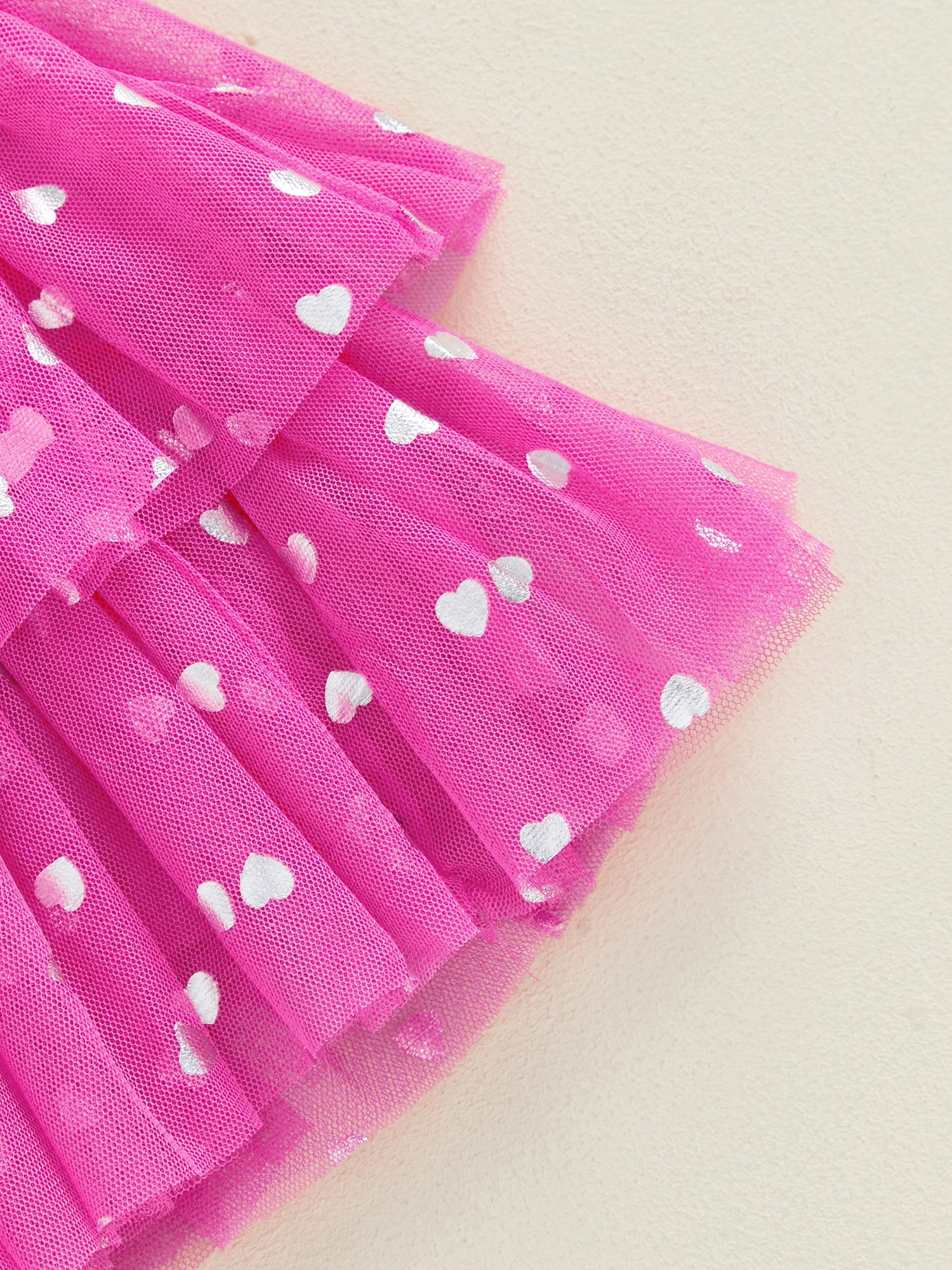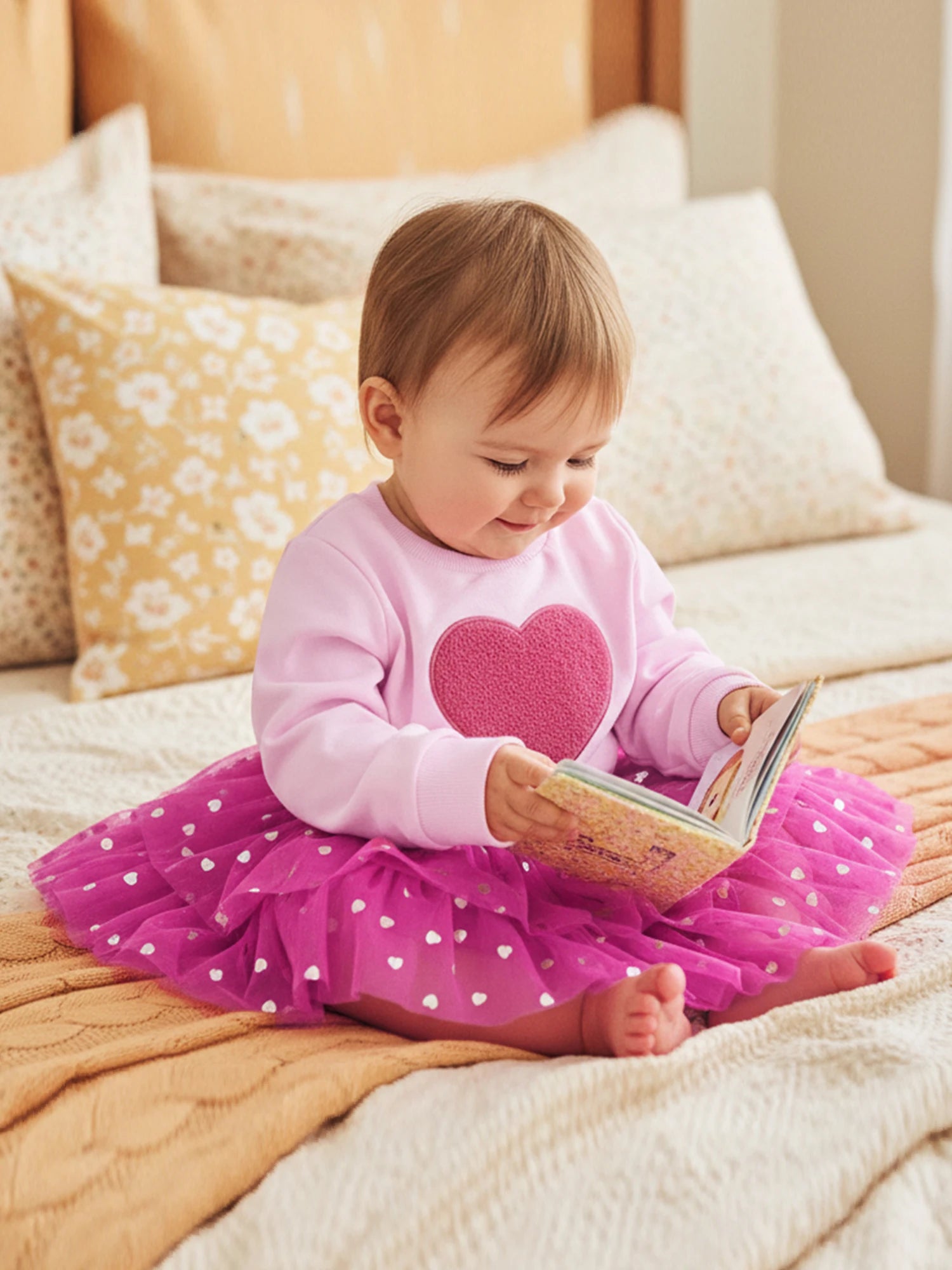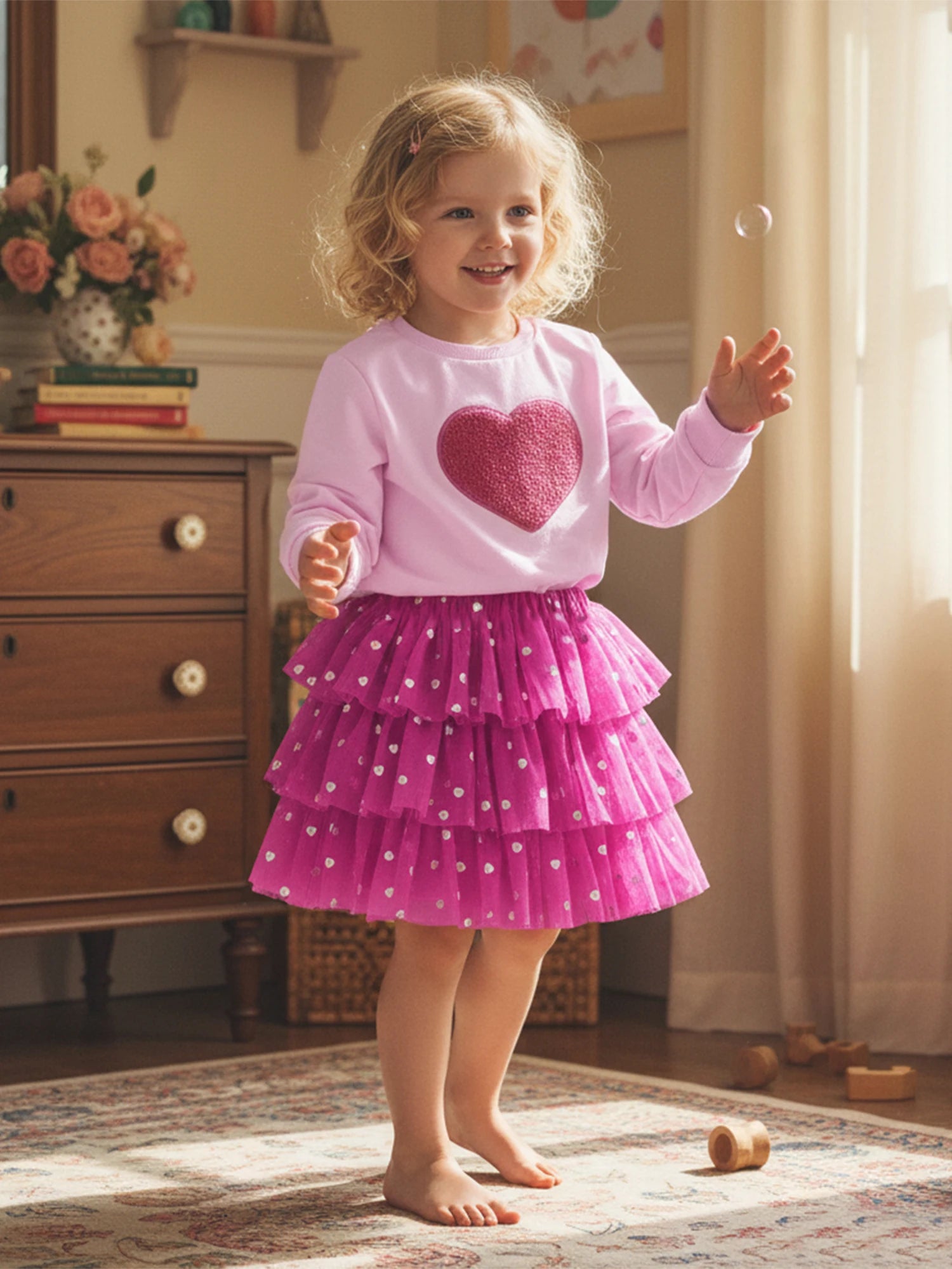 Baby Toddler Girls 2Pcs Outfit Long Sleeve Crew Neck Heart Embroidery Top and Tiered Tulle Skirt Set