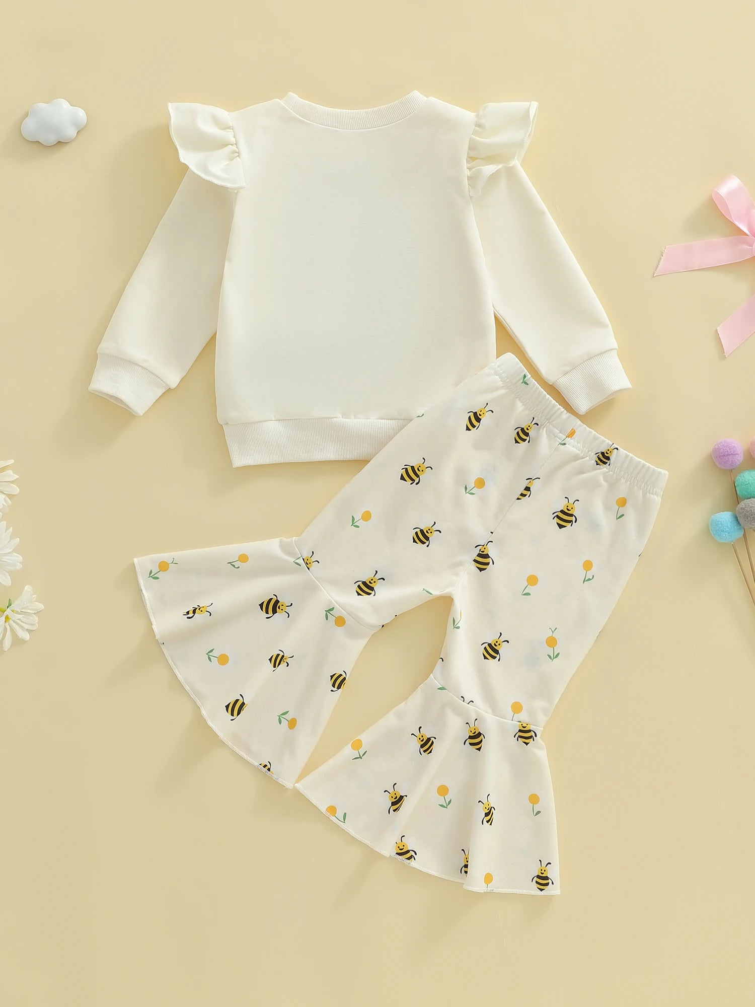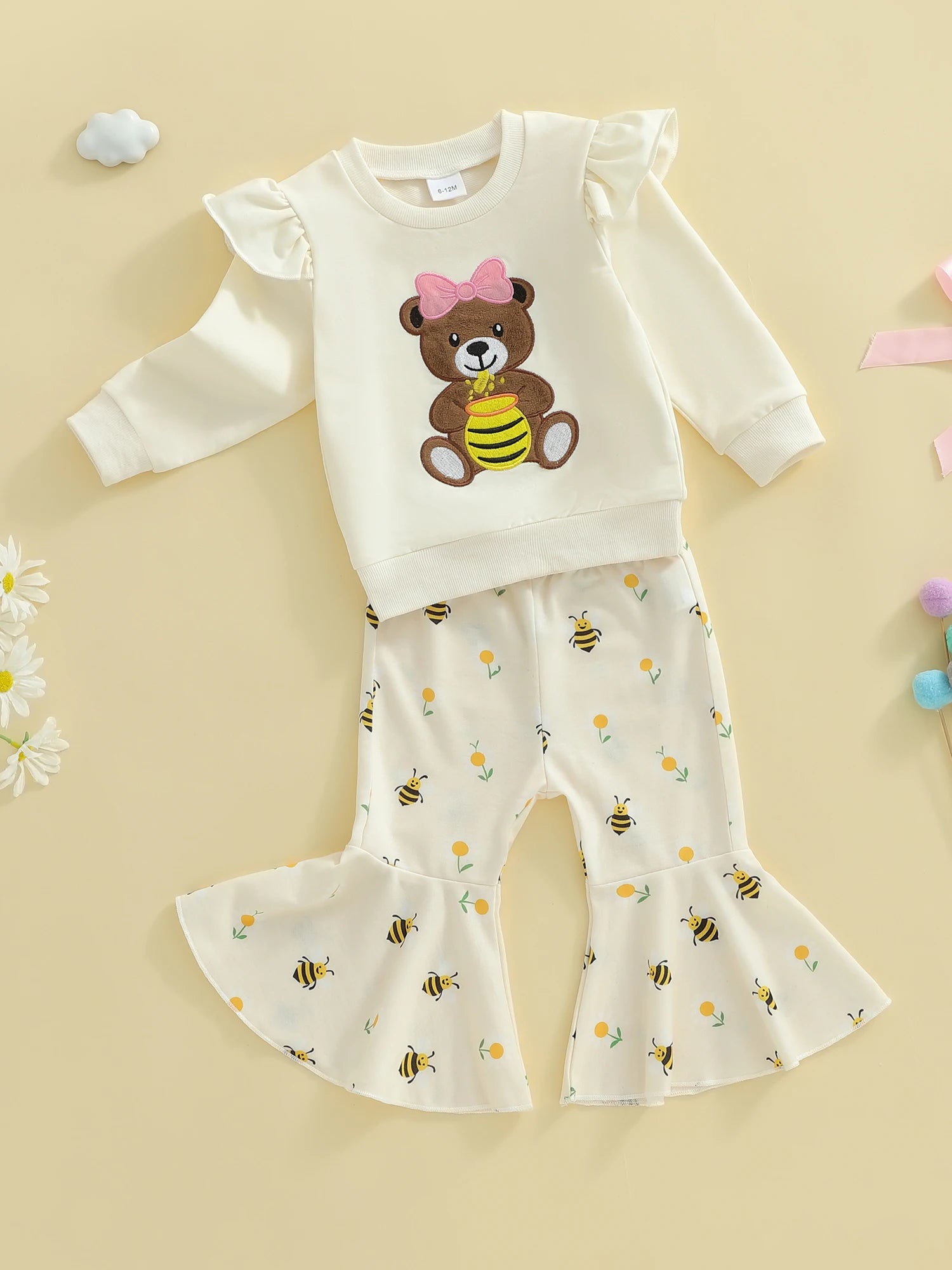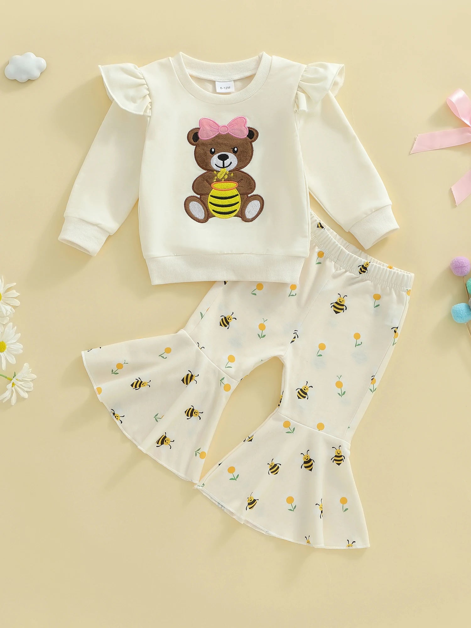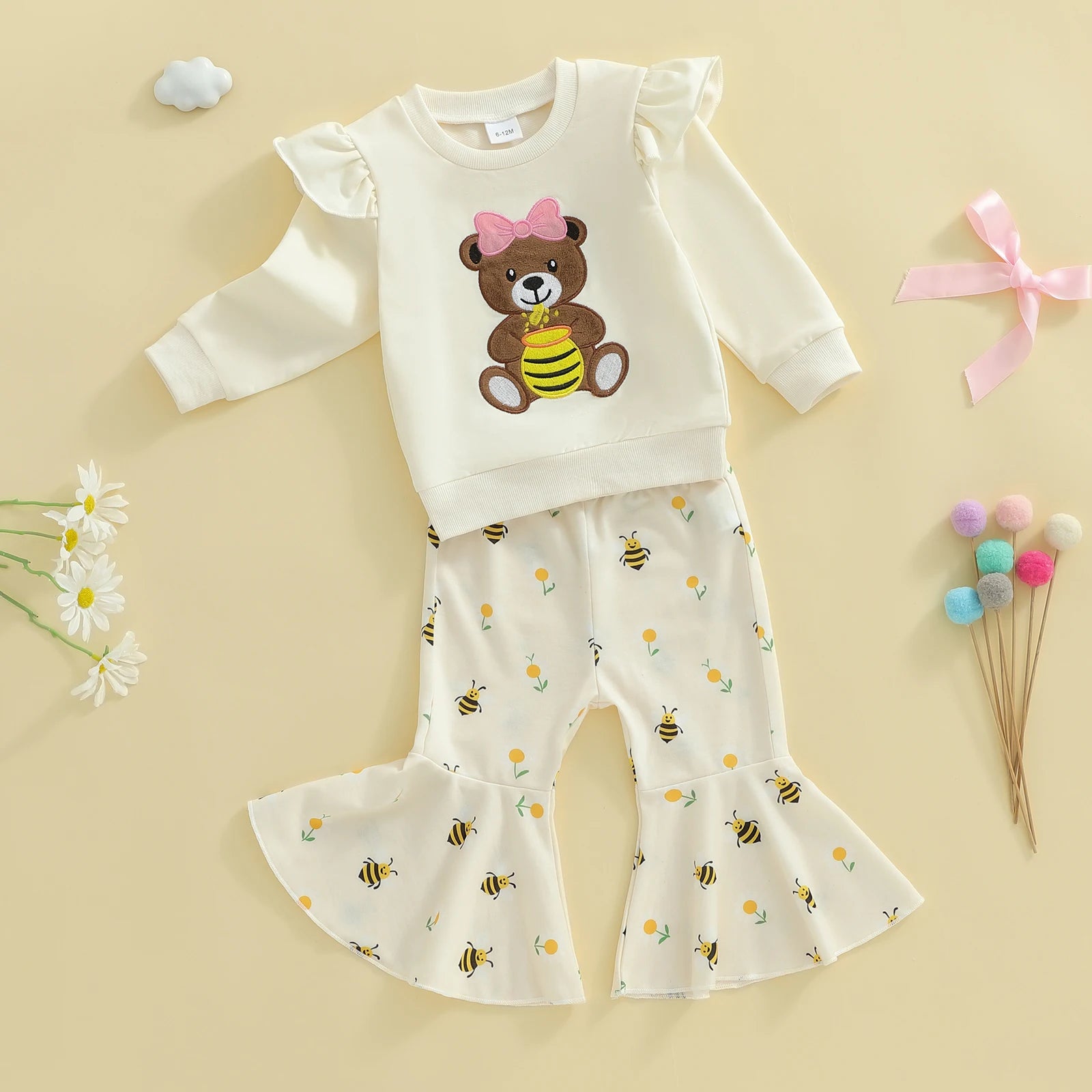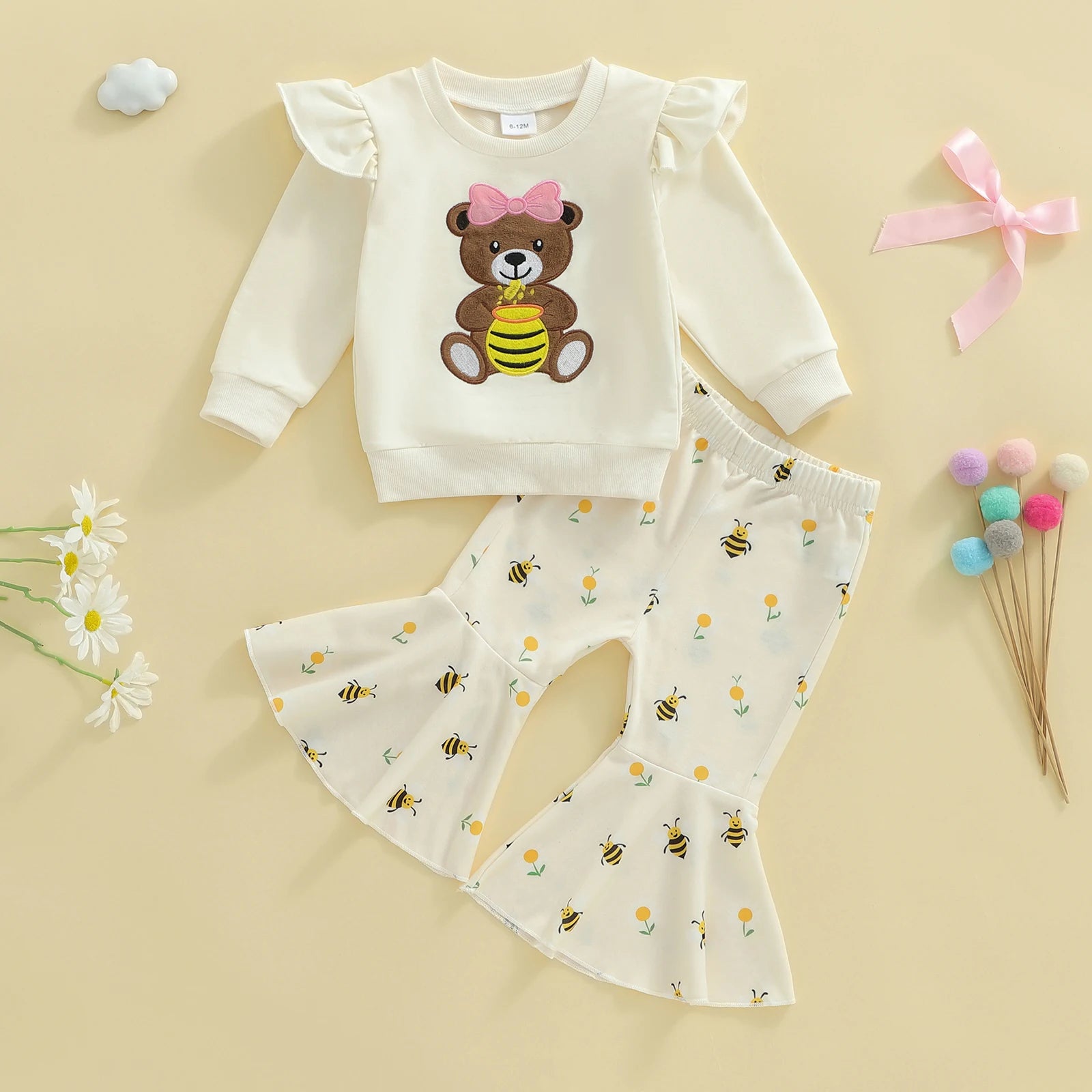 Baby Toddler Girls 2Pcs Pants Sets Long Sleeve O Neck Bear Embroidery Top Bee Print Flared Pants