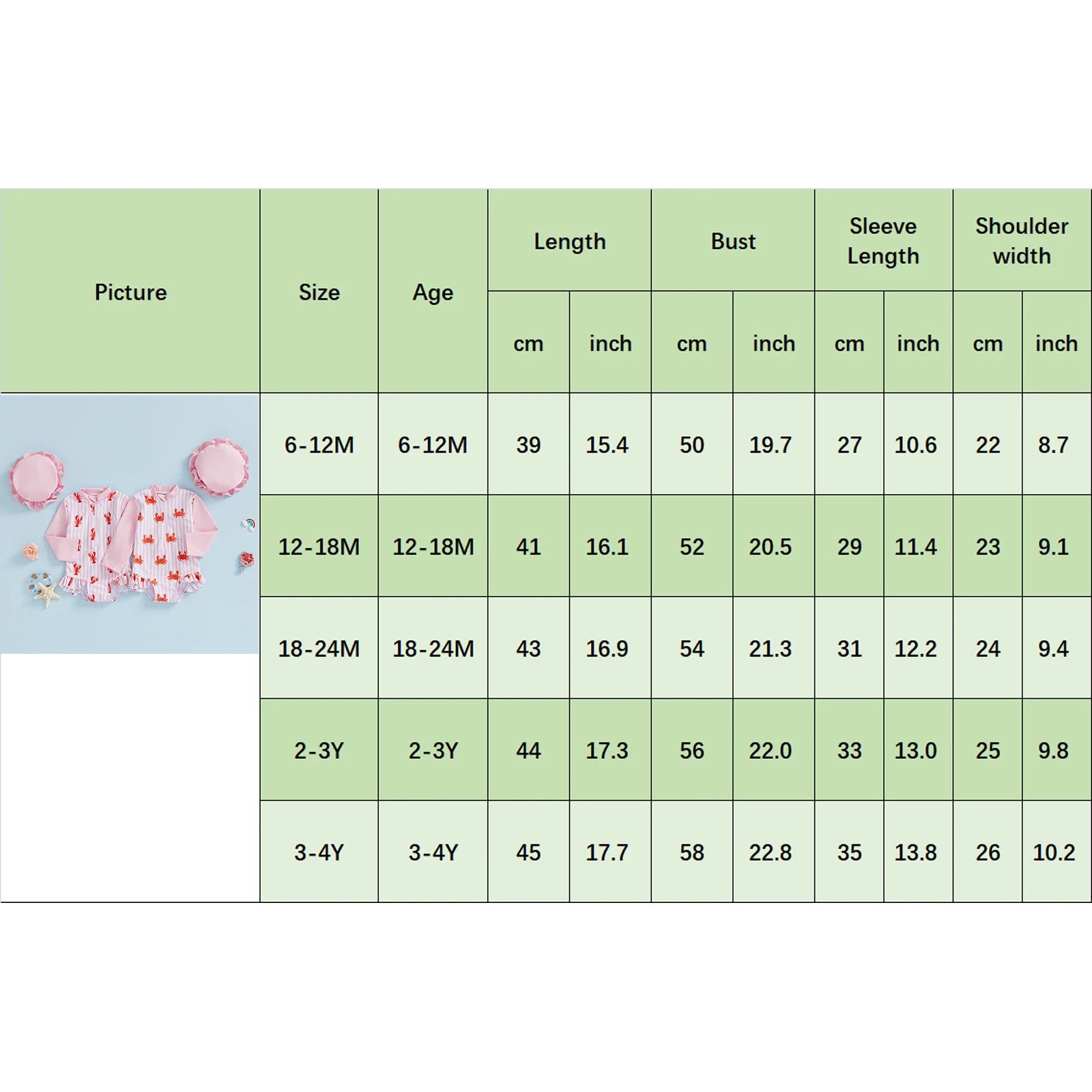 3-4Y Length: 17.72 Bust: 22.83 Sleeve: 13.78 Shoulder: 10.24 Advised Age: 3-4 Years