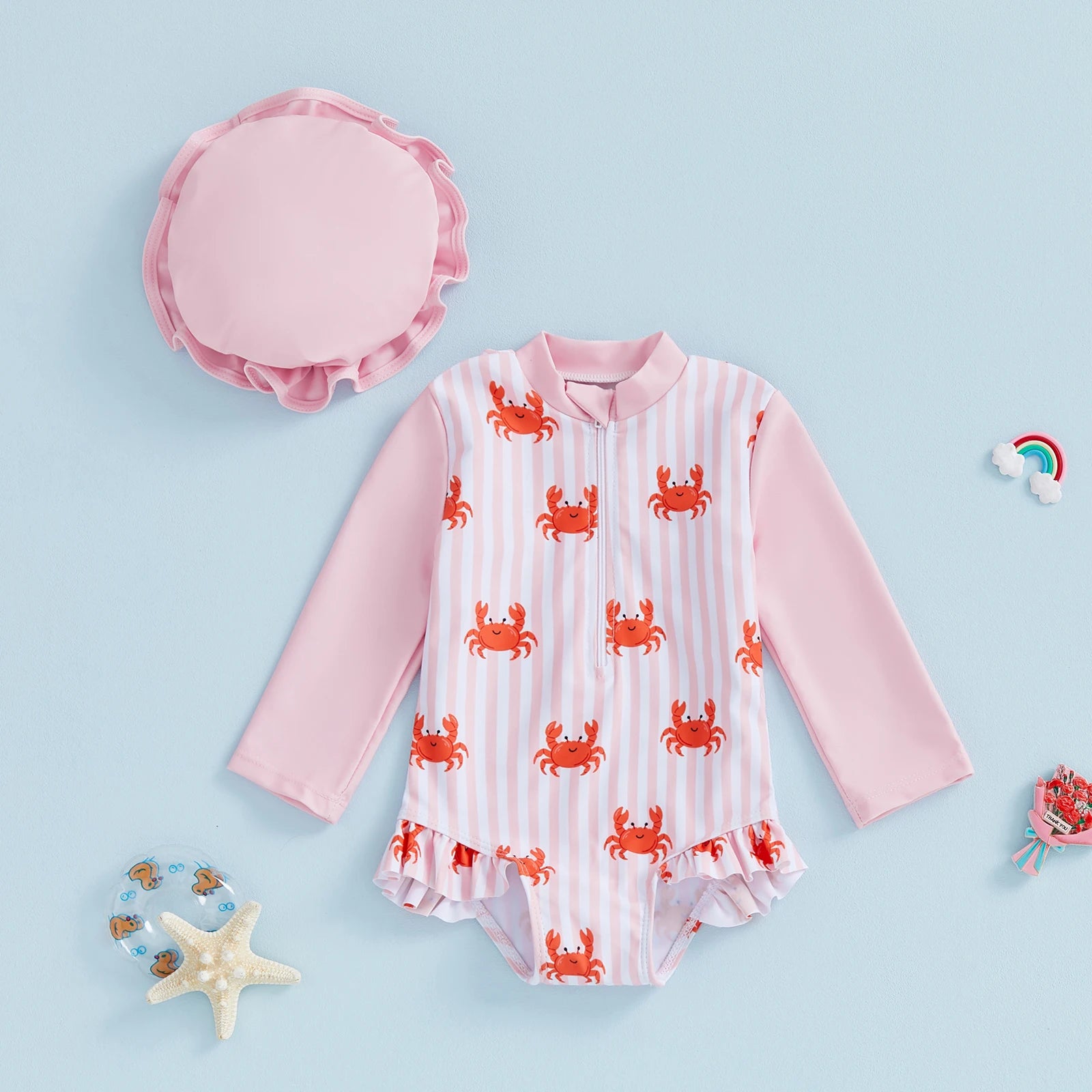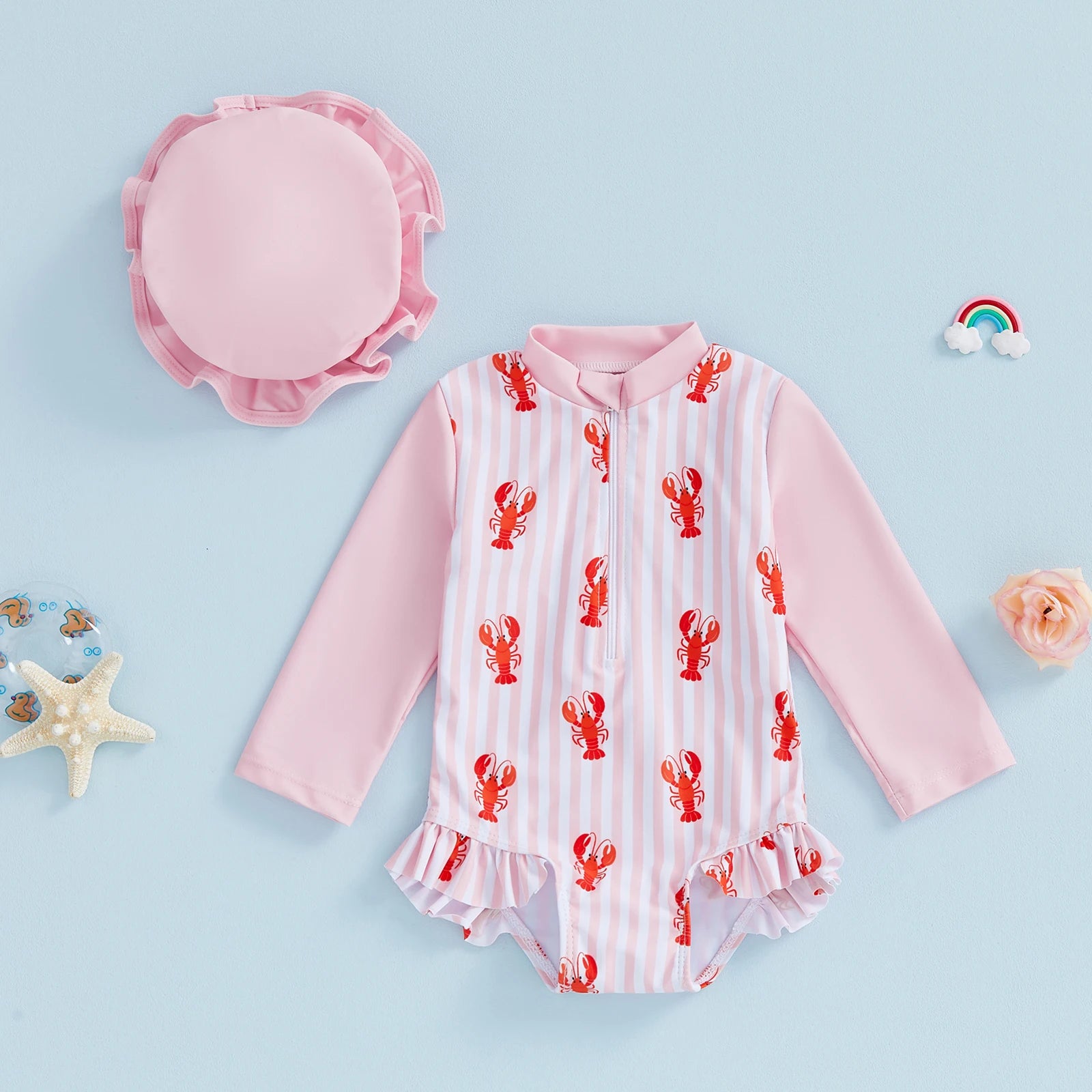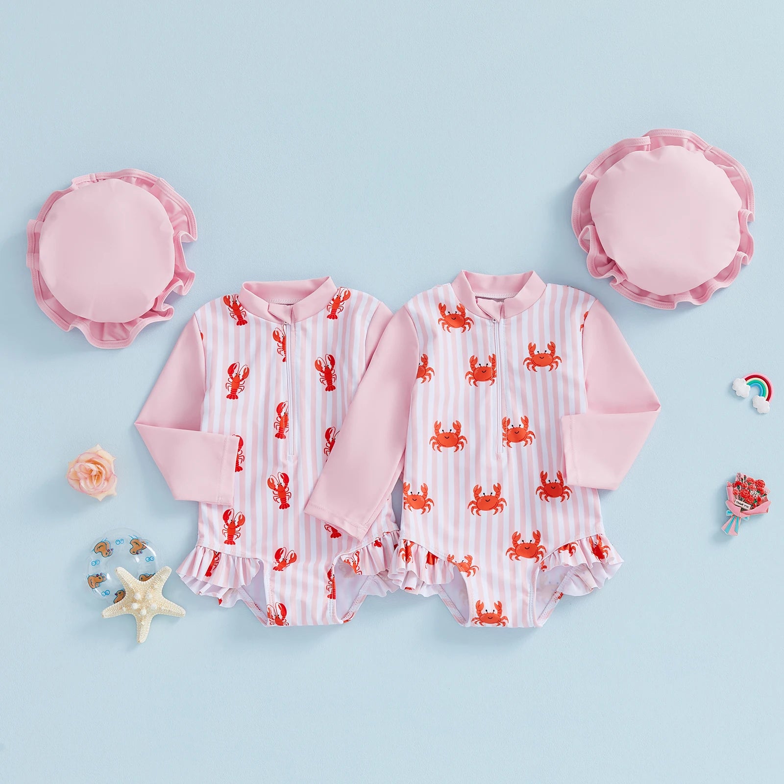 Baby Toddler Girls 2Pcs Rash Guard Swimsuit Long Sleeve Lobster Crab Print Ruffled Swimwear for Beach Set