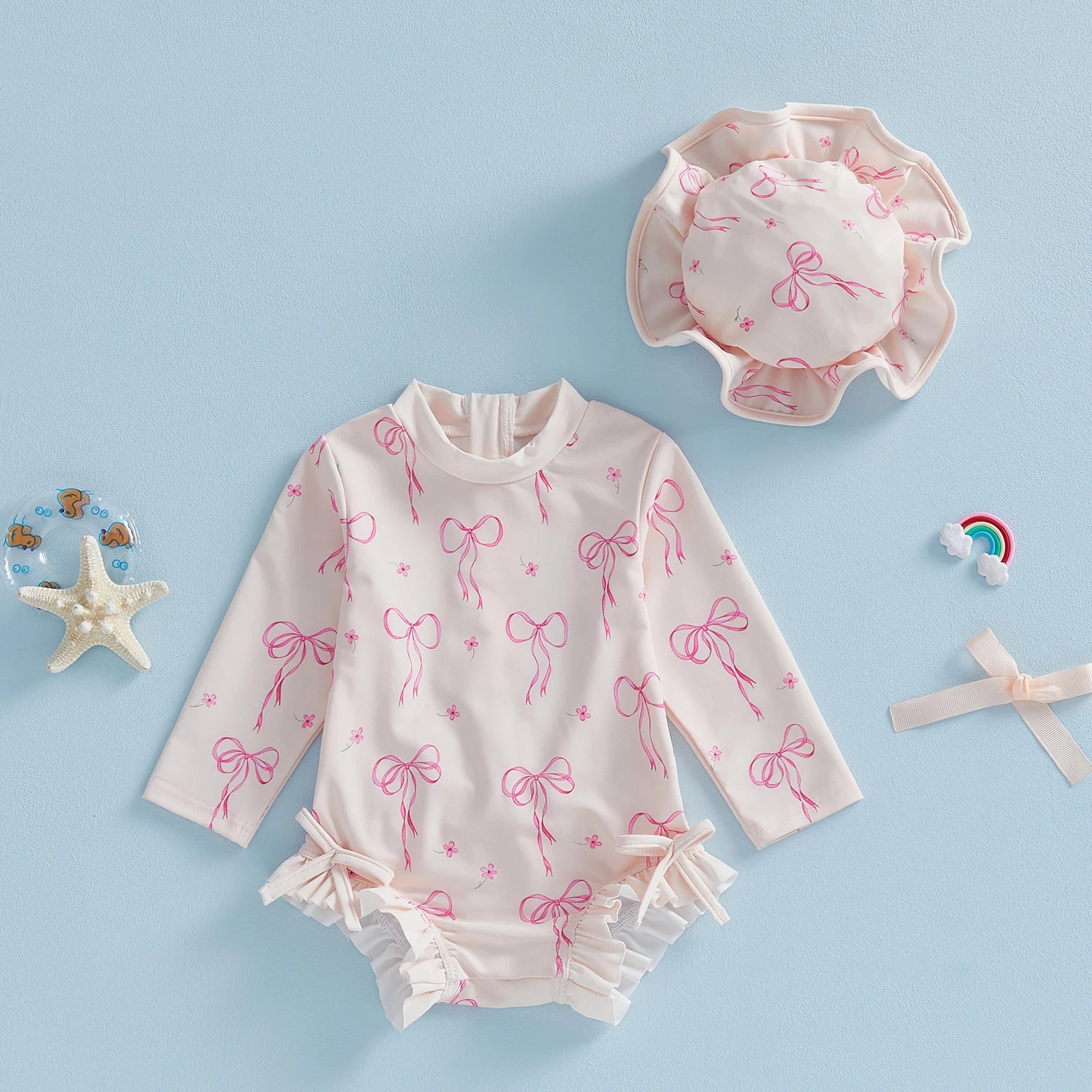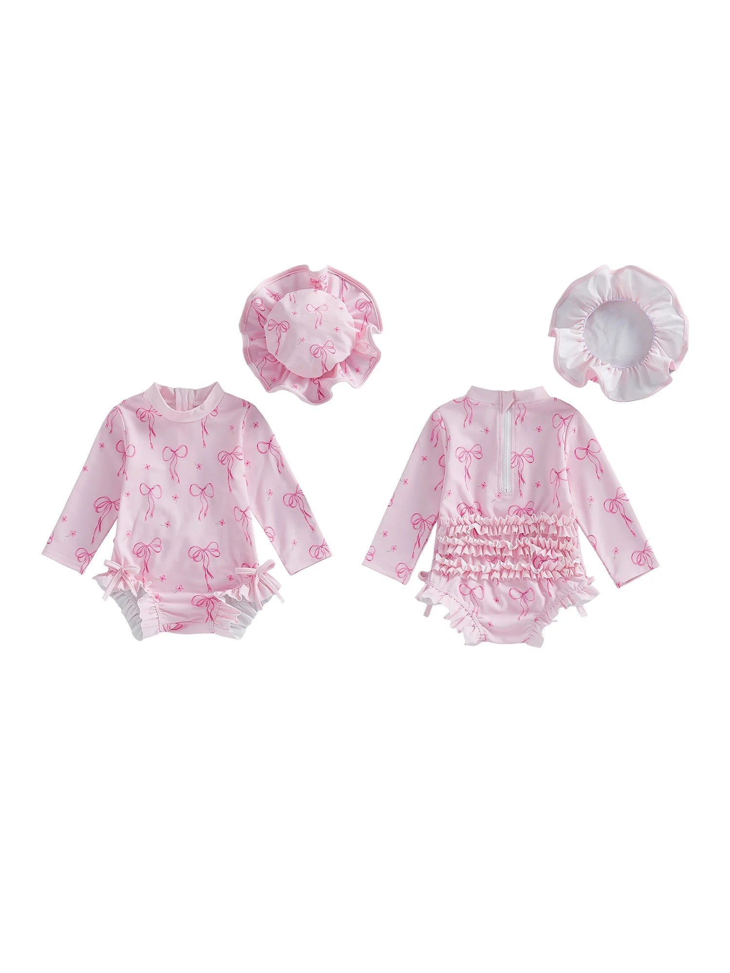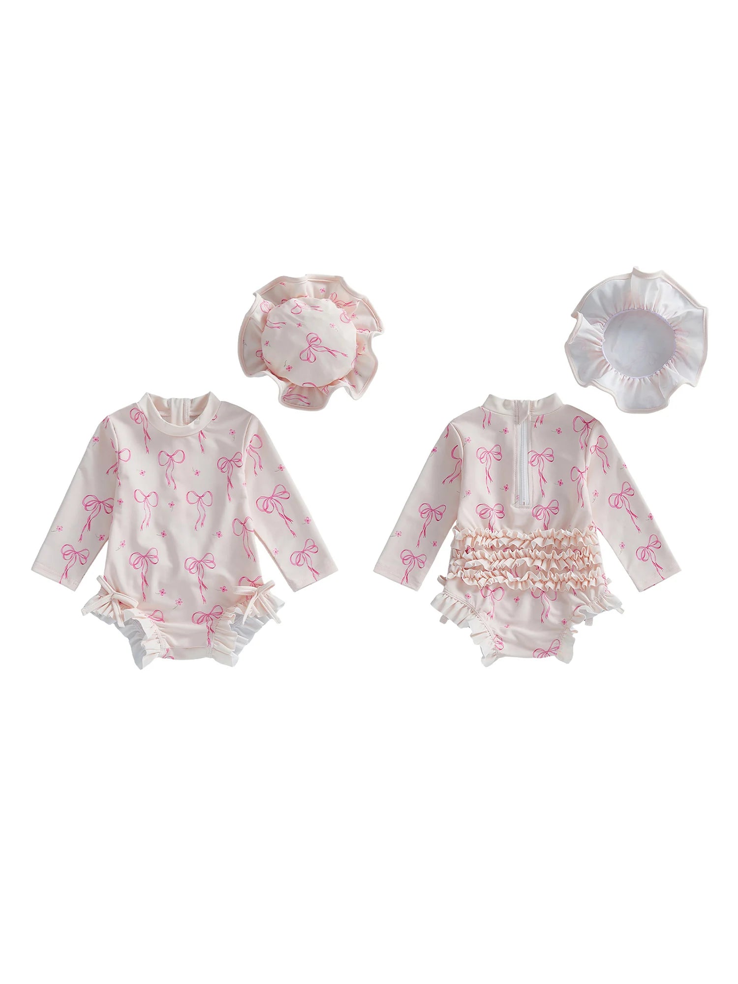 Baby Toddler Girls 2Pcs Rash Guard Swimsuit Set Girls Bow Print Long Sleeve Round Neck Ruffle Jumpsuit and Hat Set for Pool Beach