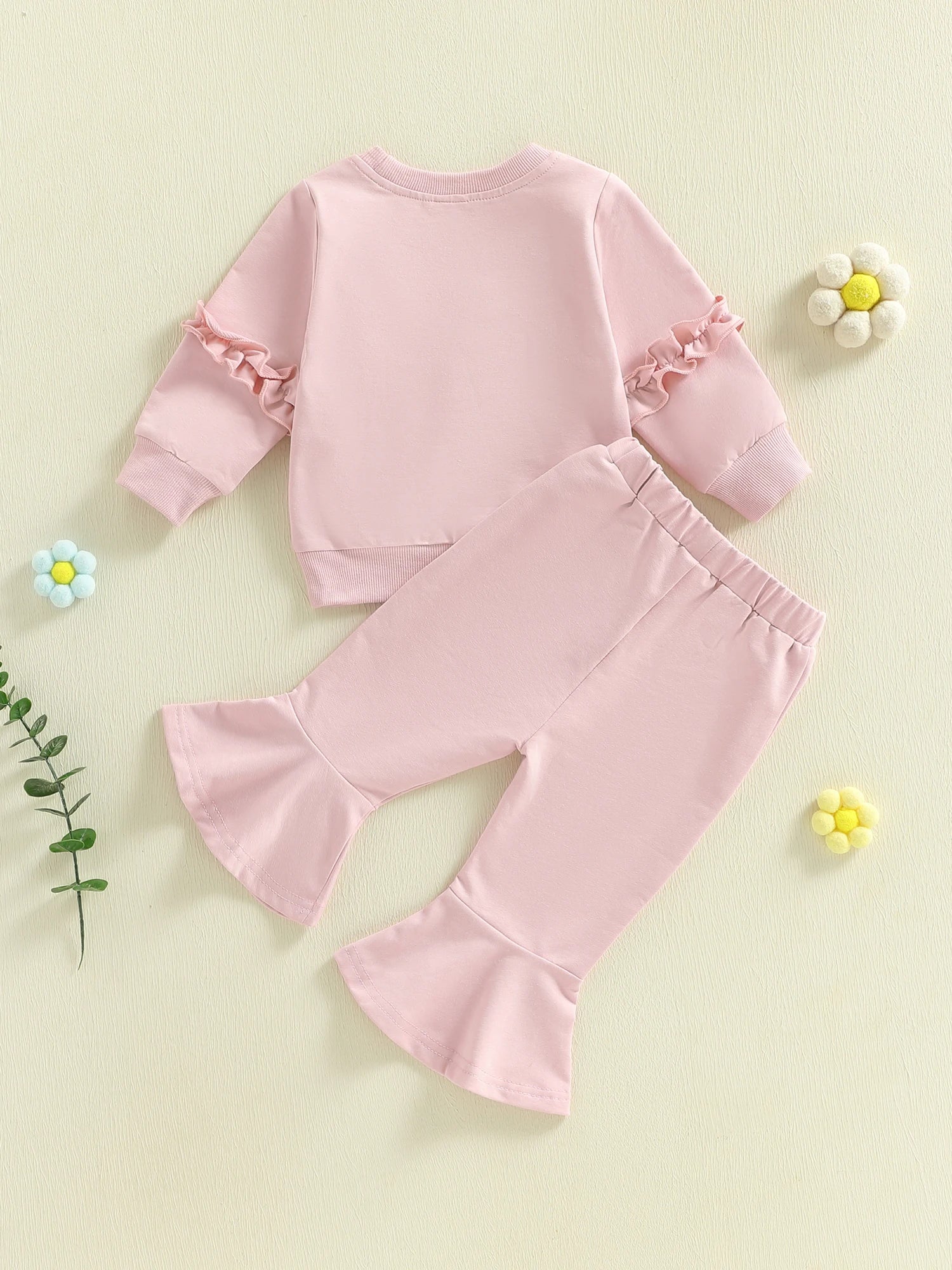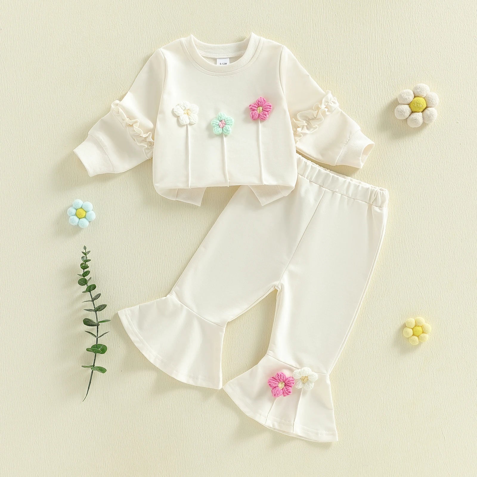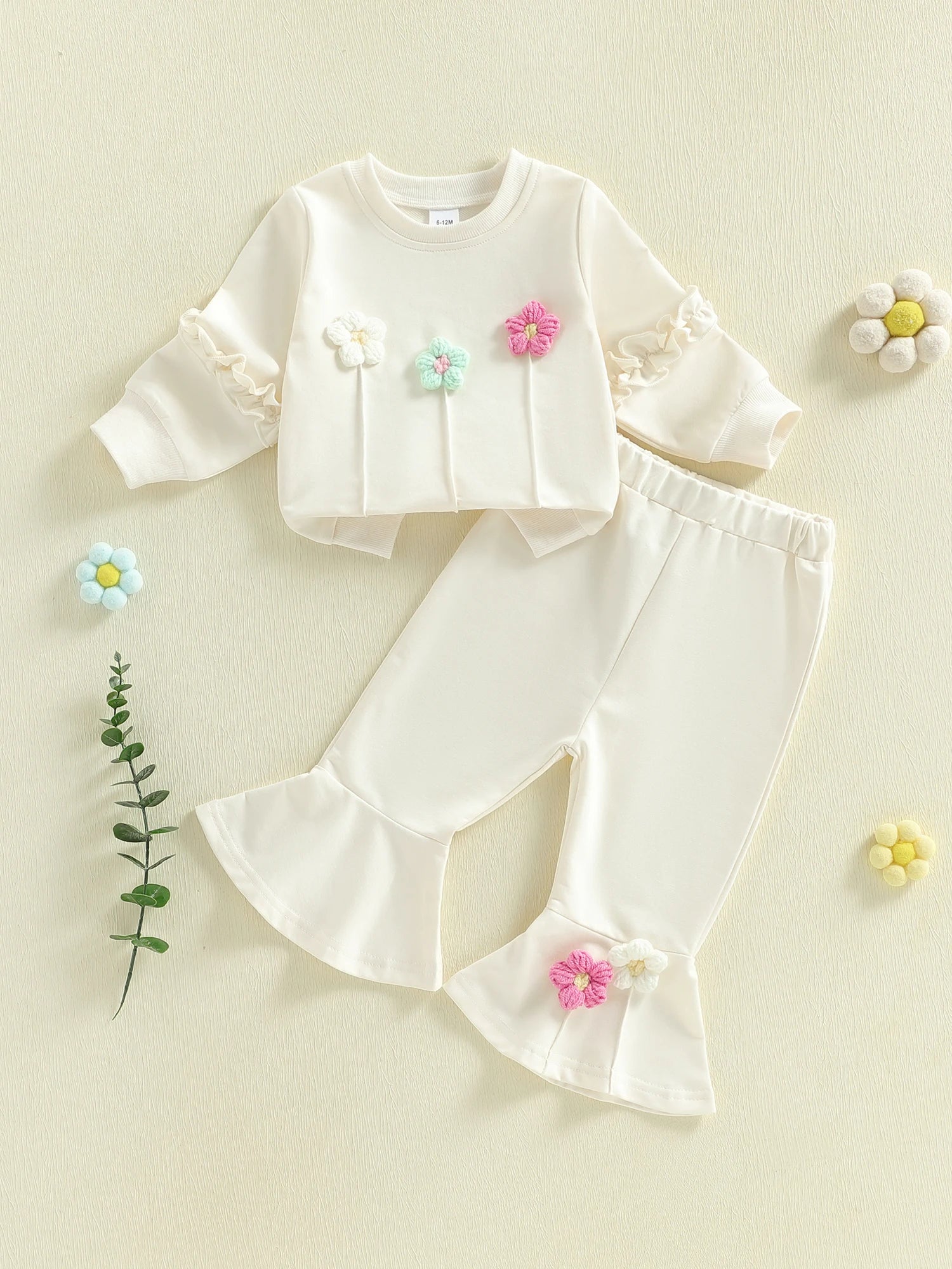 Baby Toddler Girls 2Pcs Spring Outfit Long Sleeve Crew Neck 3D Crochet Flower Decor Top and Bell Bottom Pants Set