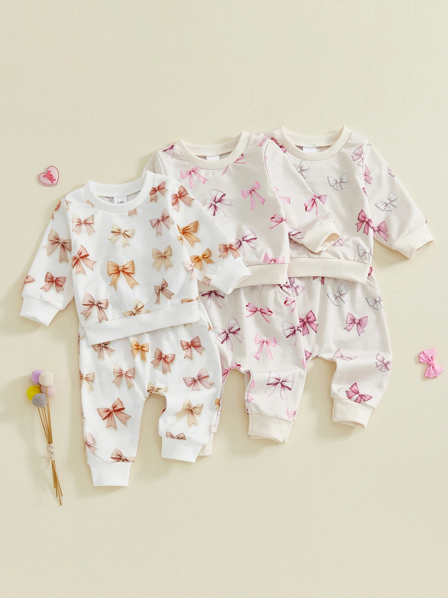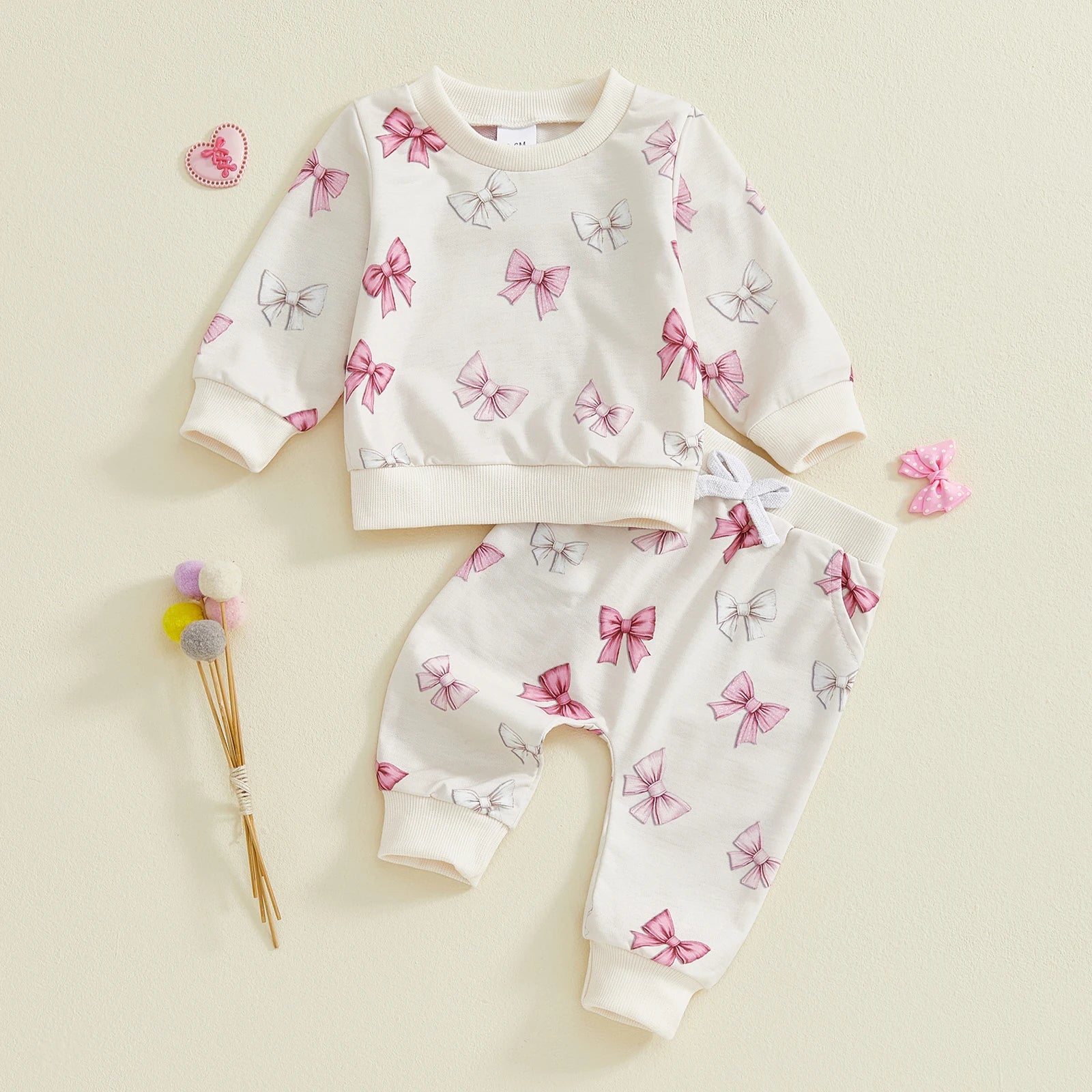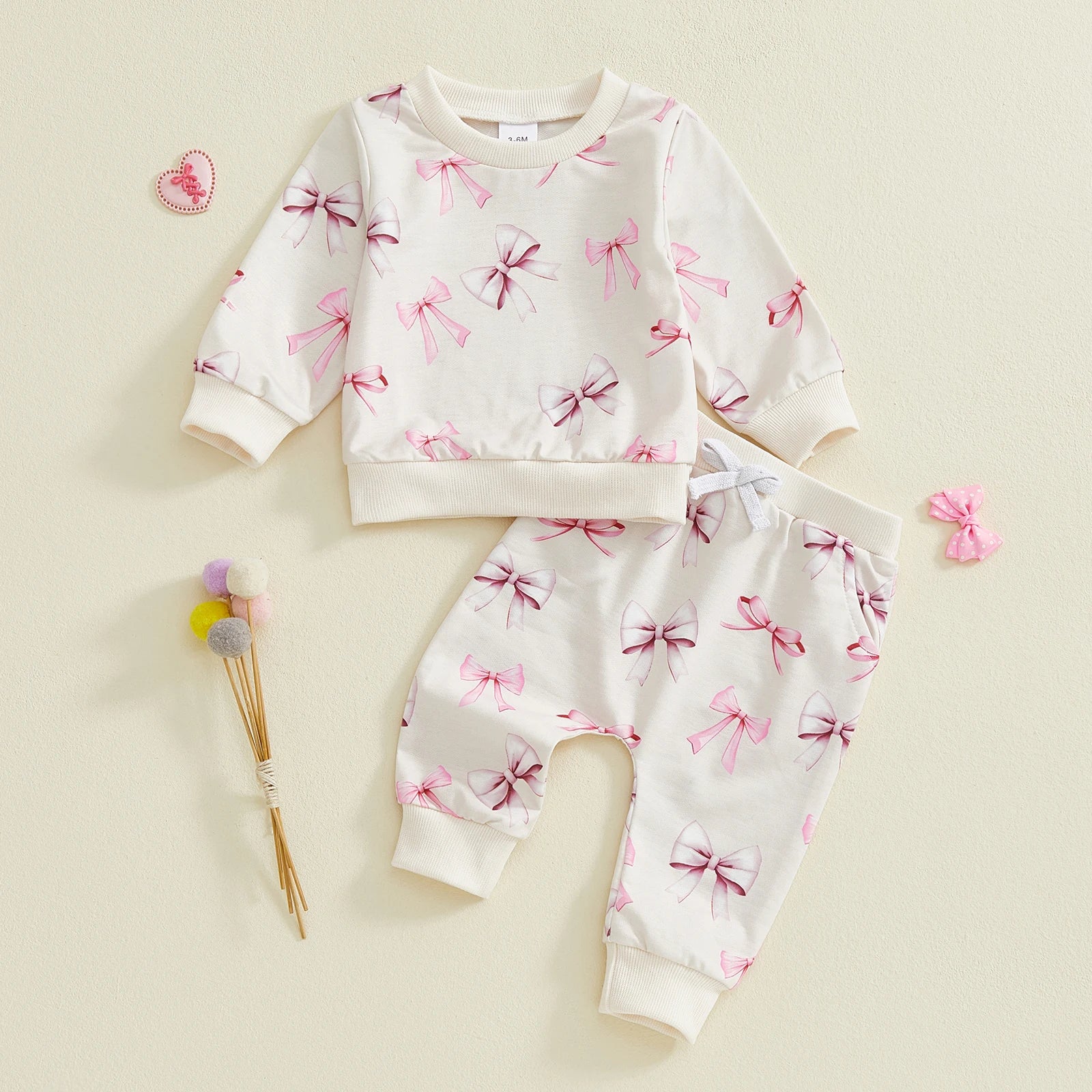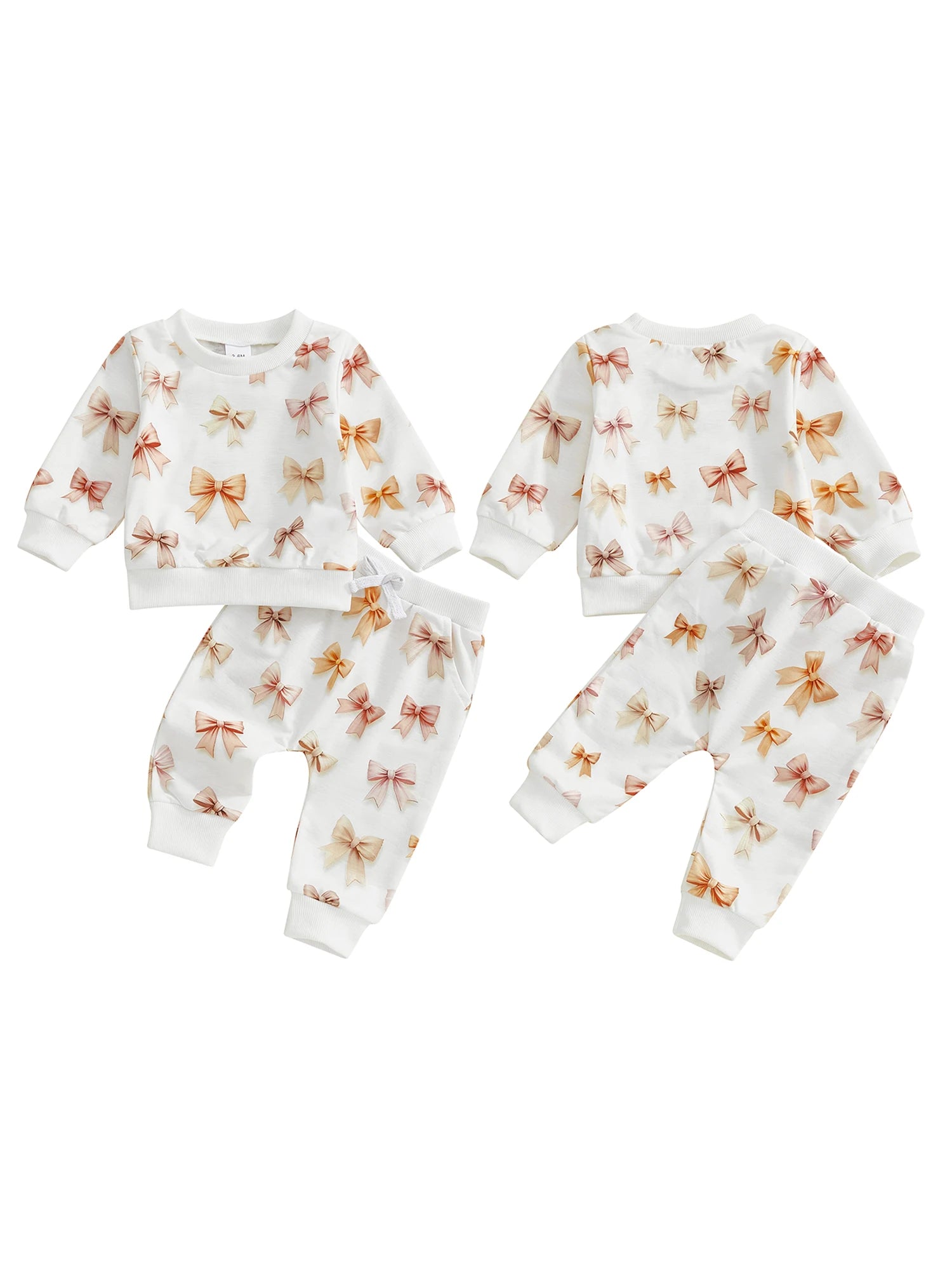 Baby Toddler Girls 2Pcs Spring Outfits Bow Print Long Sleeve Round Neck Pullover Top Elastic Waist Long Pants Jogger Set