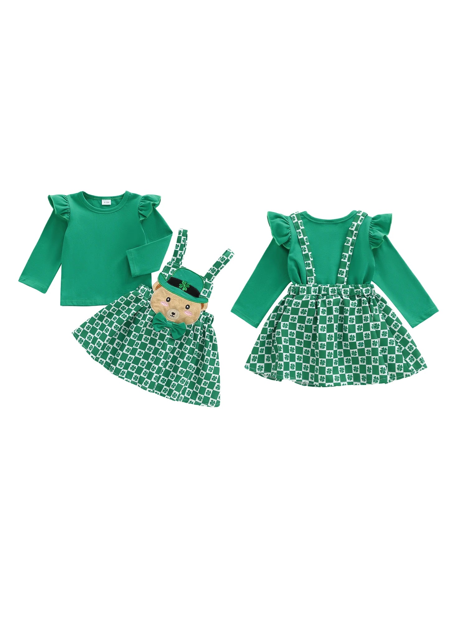 Baby Toddler Girls 2Pcs St. Patrick's Day Outfits Solid Color Long Sleeve Top Shamrock Embroidery Plaid Suspender Overalls Skirt Dress Two Piece Set