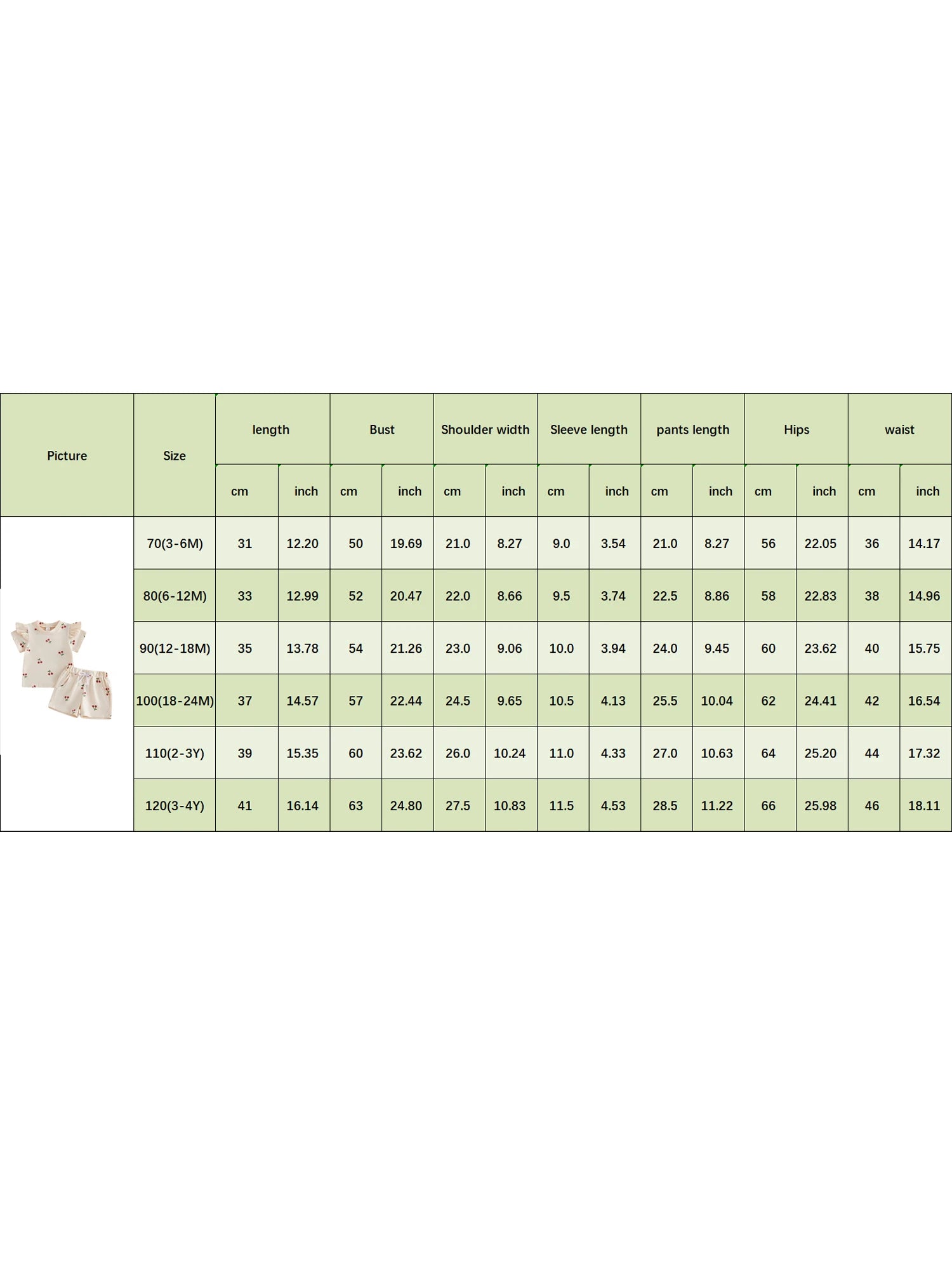 80(6-12M) Tops Length: 12.99 Bust: 20.47 Shoulder: 8.66 Sleeve: 3.74 Pants Length: 8.86 Hip: 22.83 Waist: 14.96 Advised Age: 6-12 Months