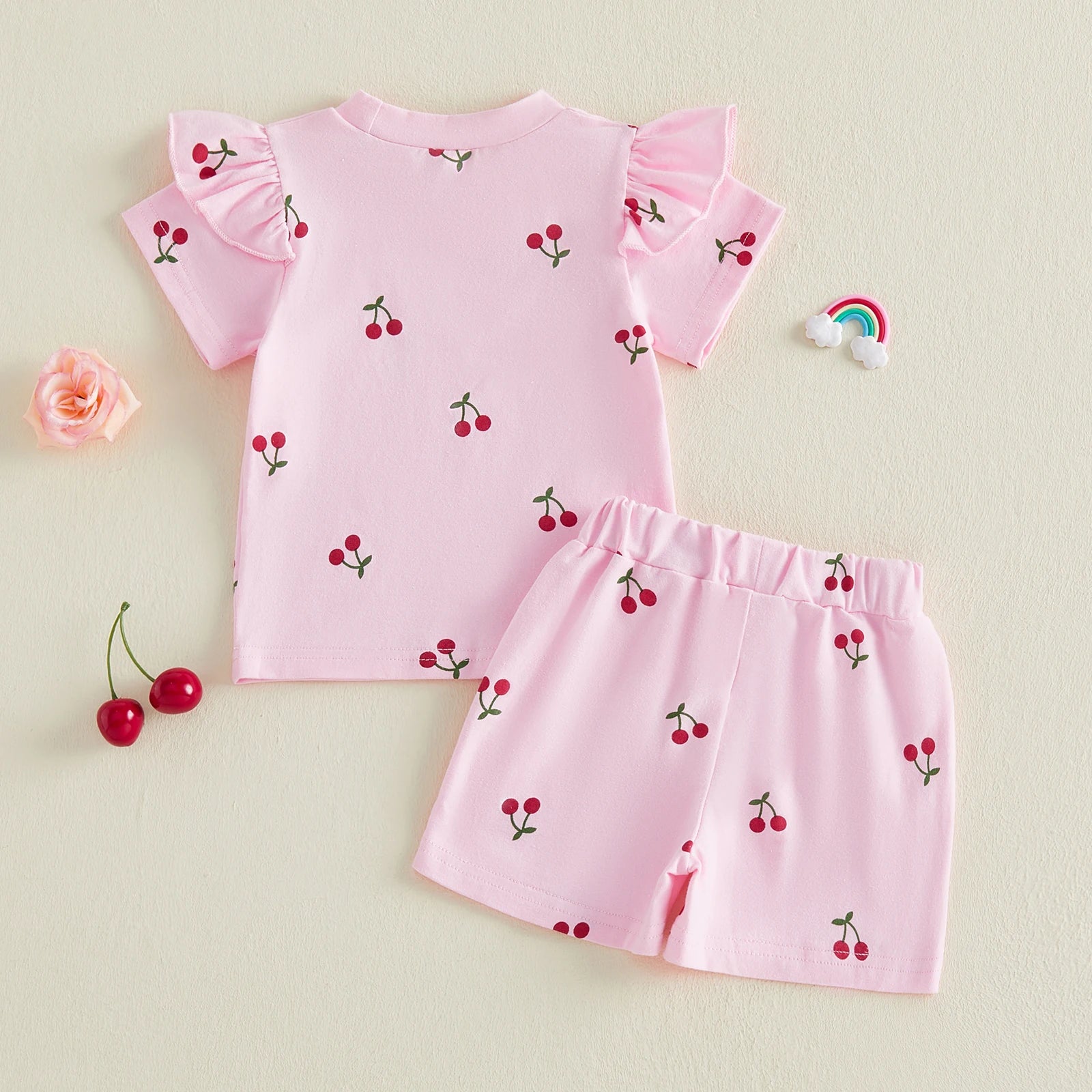 Baby Toddler Girls 2Pcs Summer Outfit Cherry Print Crew Neck Short Sleeve Top Elastic Waist Shorts Clothes Set