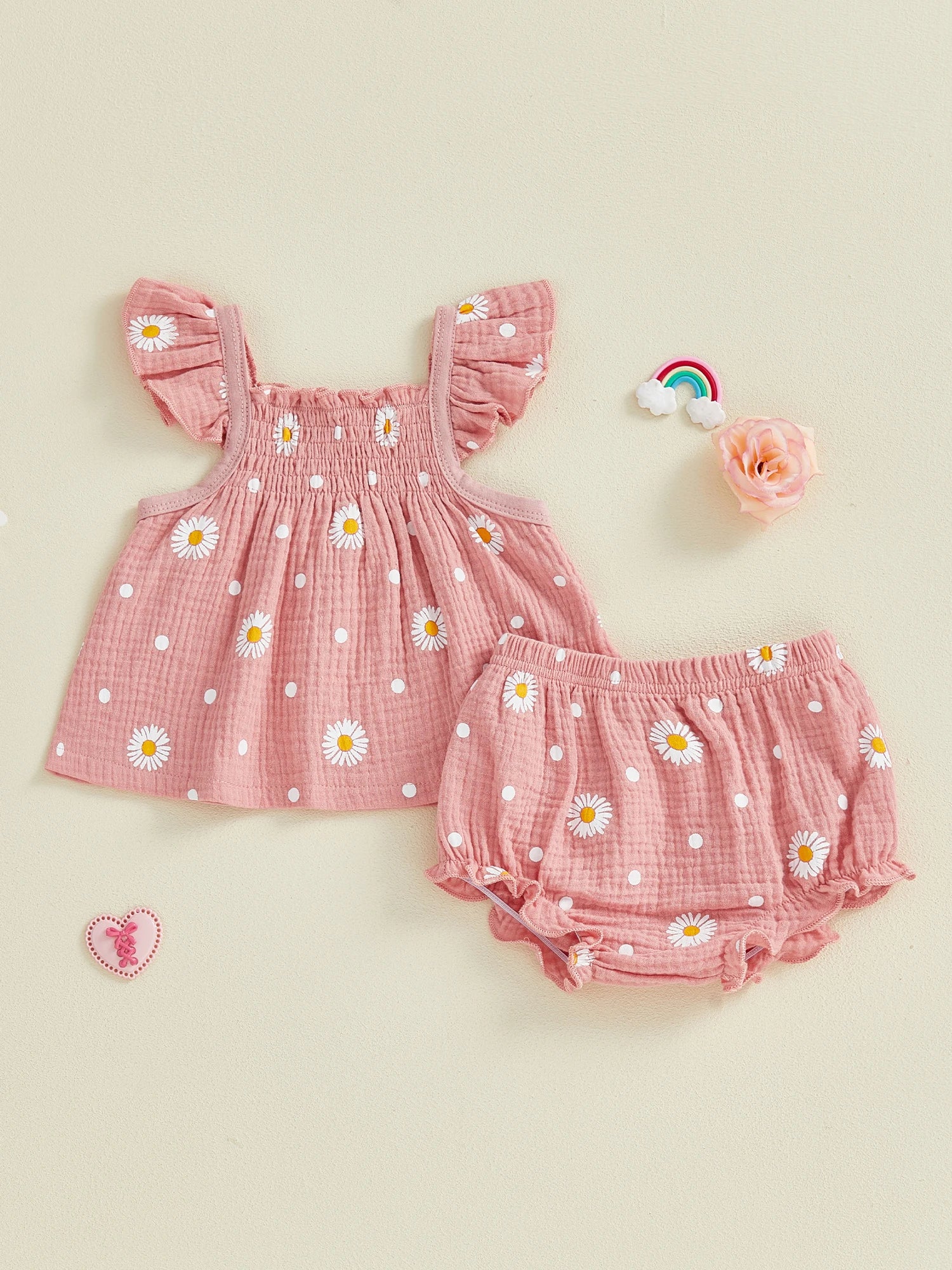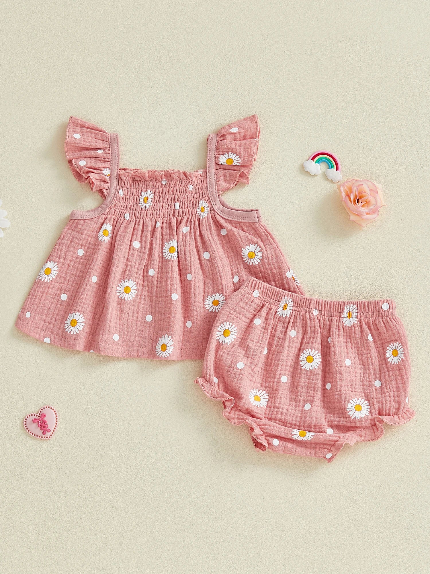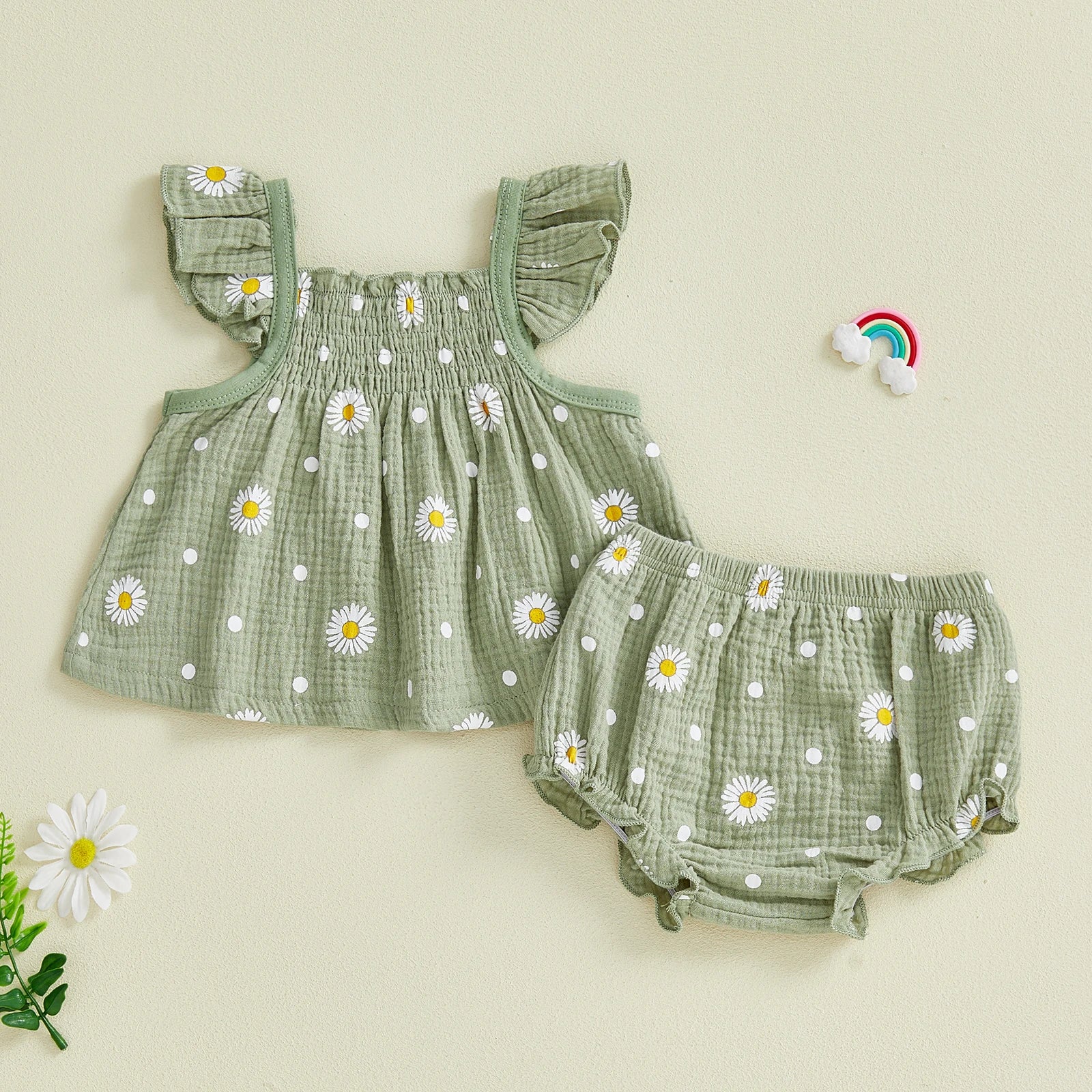 Baby Toddler Girls 2Pcs Summer Outfit Sleeveless Square Collar Daisy Print Ruffled Top and Bloomers Shorts 2 Piece Set