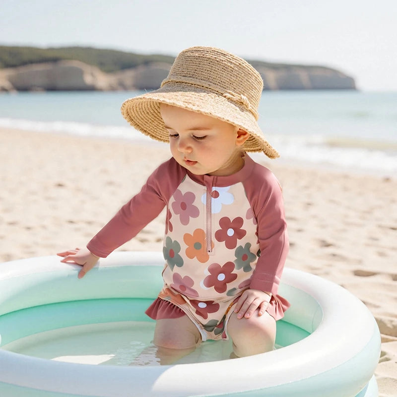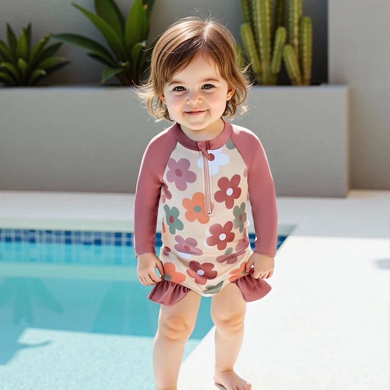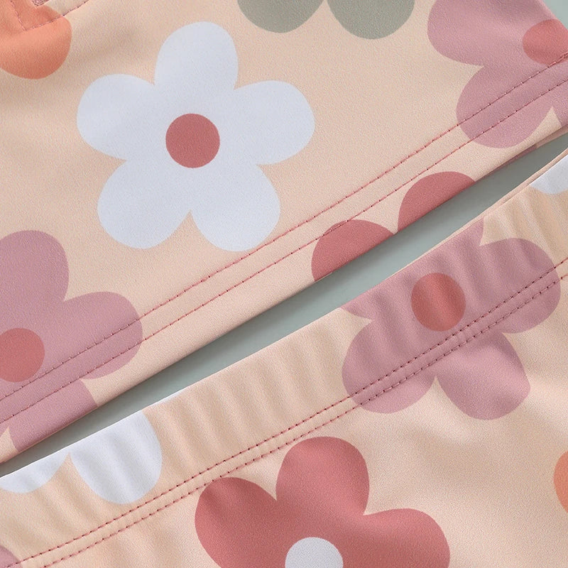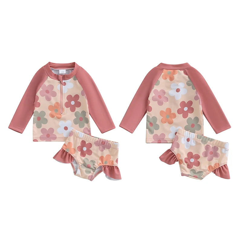 Baby Toddler Girls 2Pcs Summer Swimsuit Set Flower Bow Print Zip-up Rash Guard Long Sleeve Swim Top and Shorts Bathing Suit