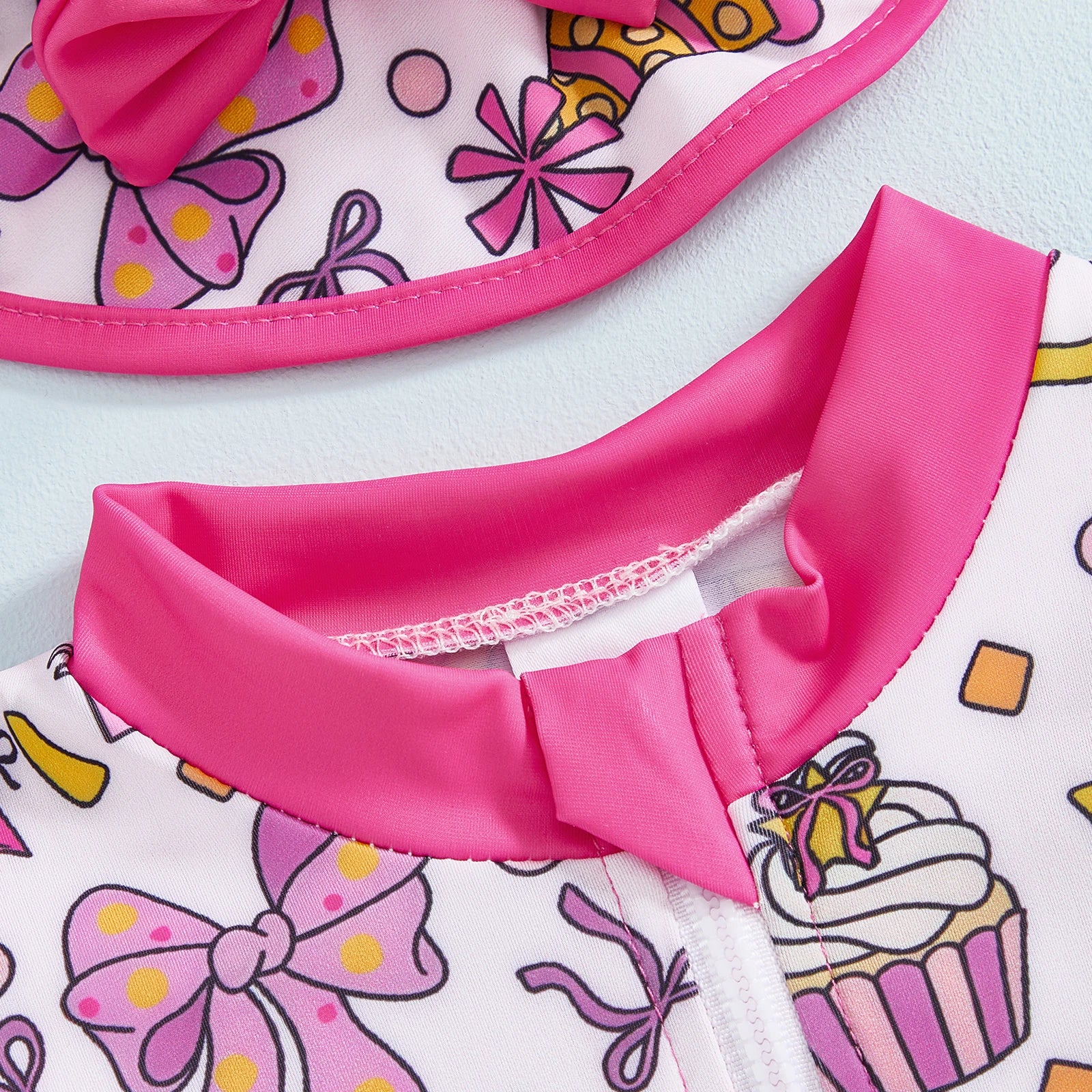 Baby Toddler Girls 2Pcs Swimsuit Set Bow Cake Birthday Print Flying Sleeve Zip-up Bathing Suit with Hat Outfit