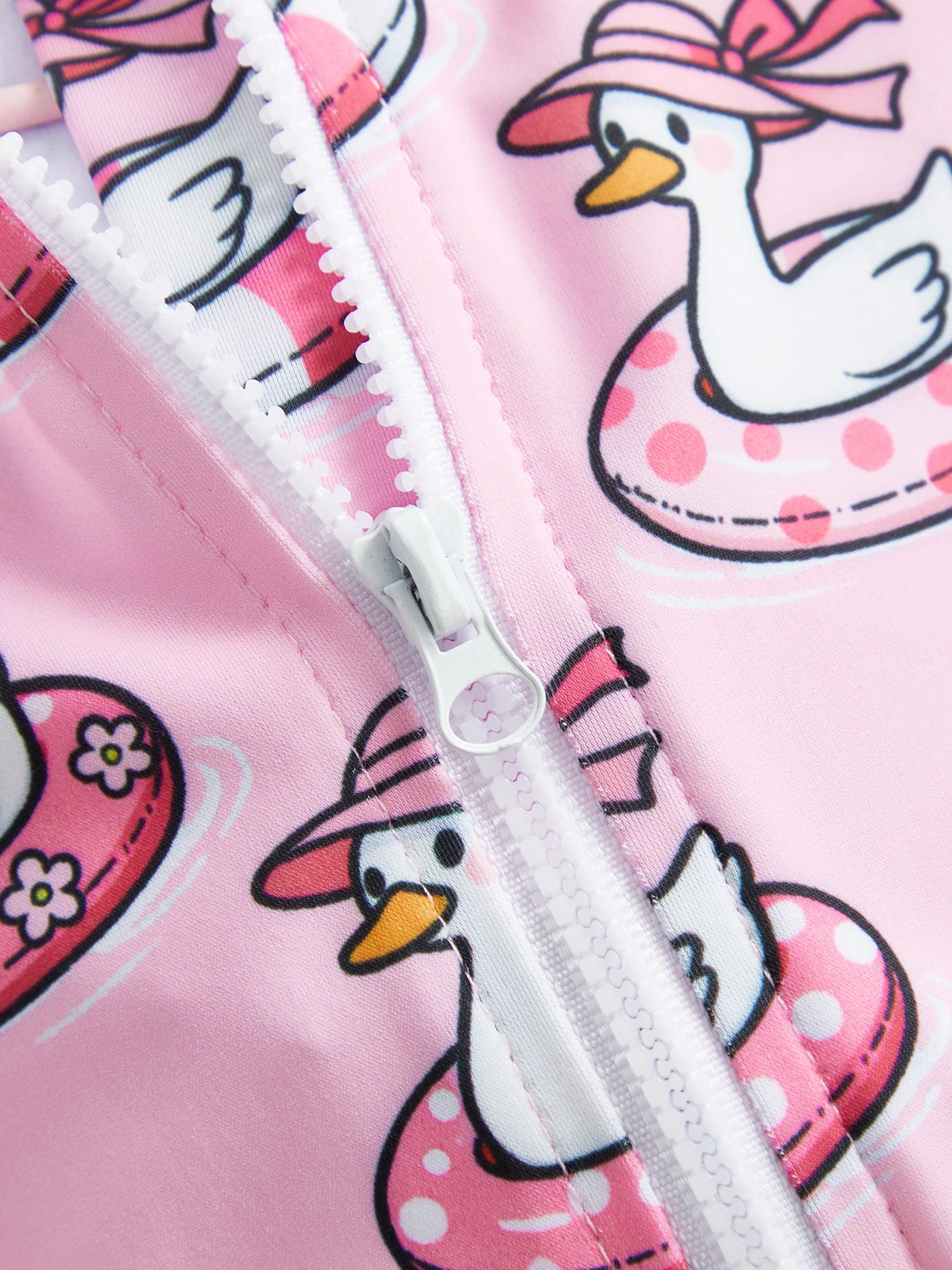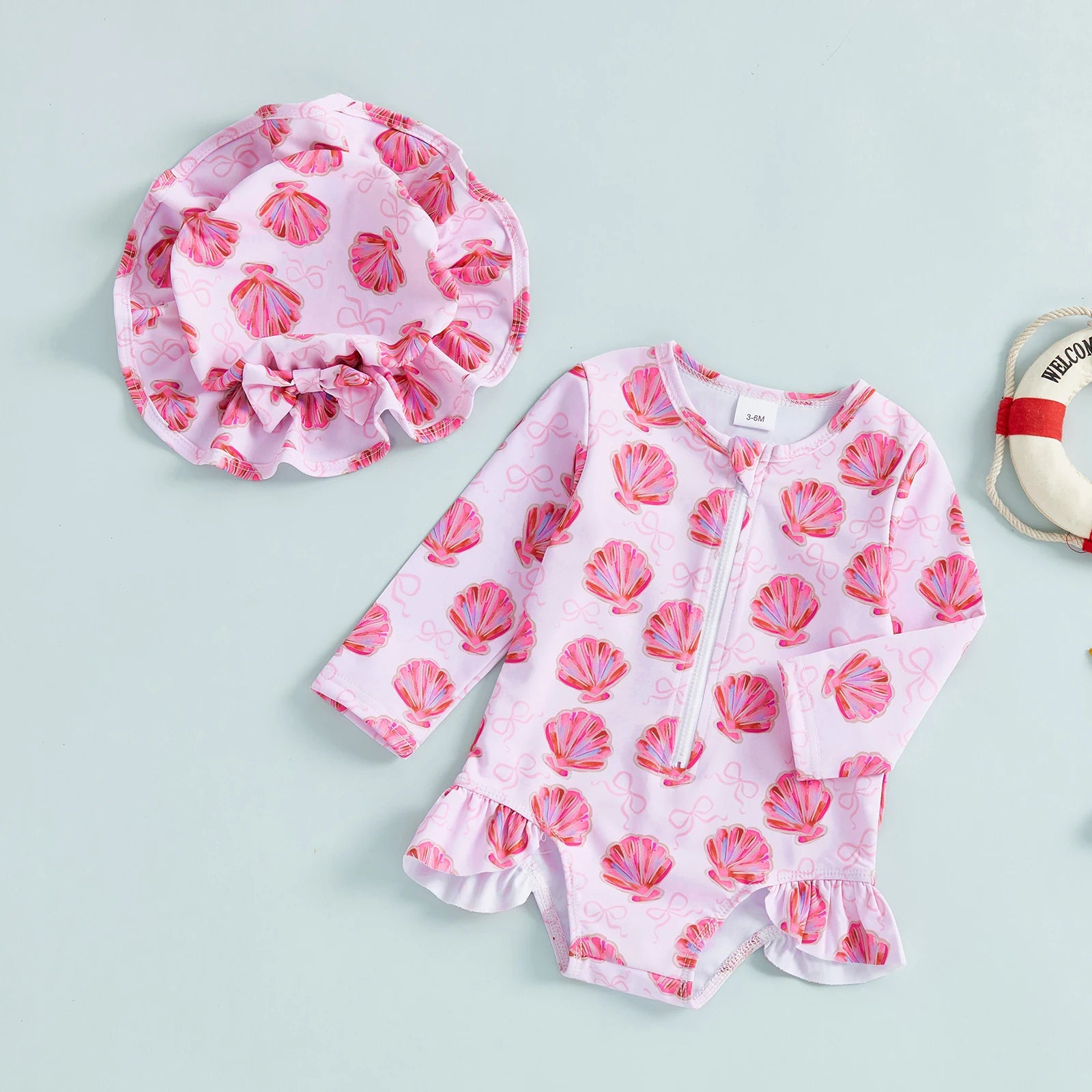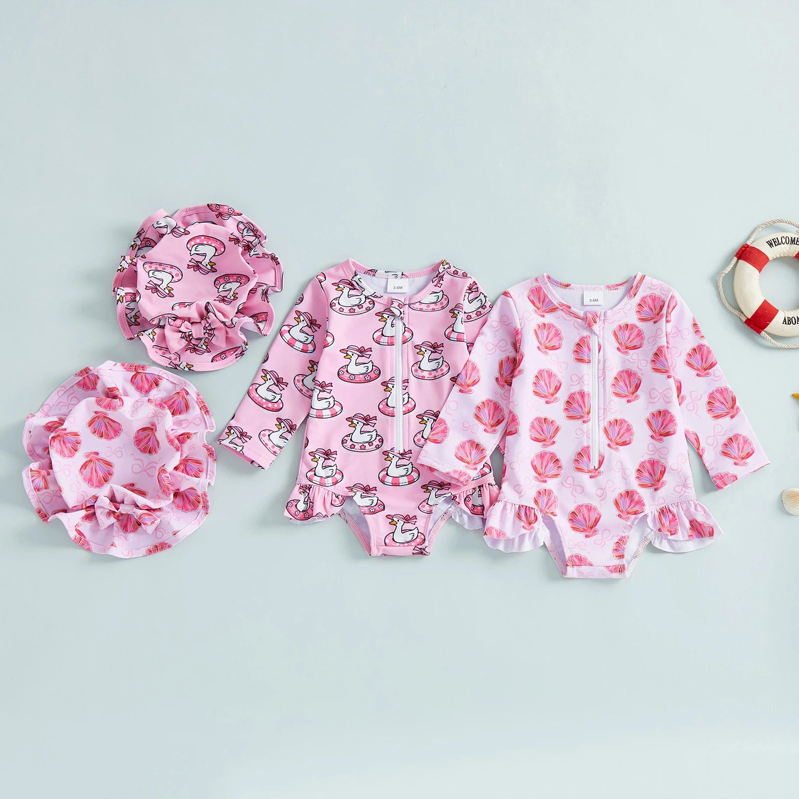 Baby Toddler Girls 2Pcs Swimsuit Set Duck/Shell Print Crew Neck Long Sleeve Zipper Rash Guard Swimwear and Sun Hat