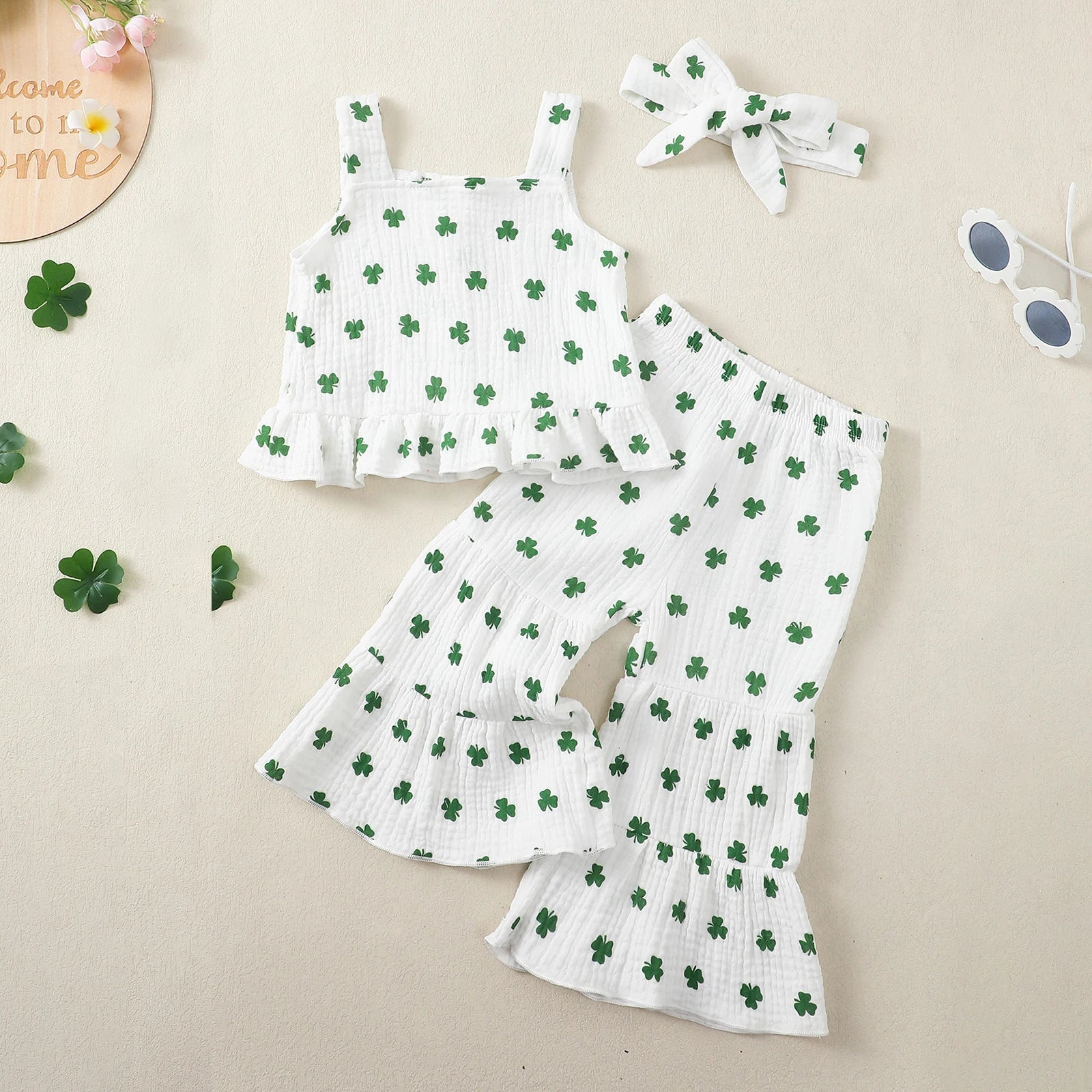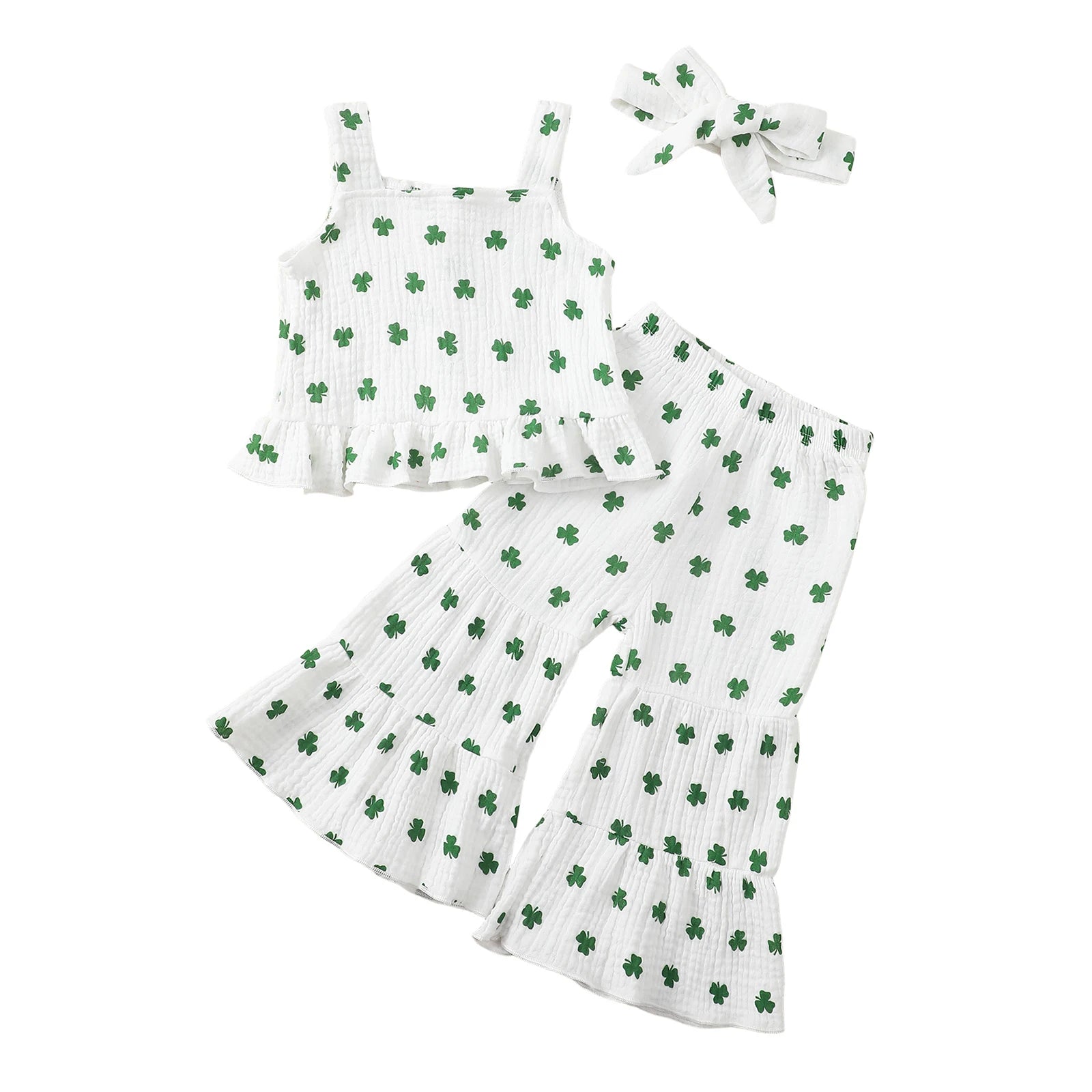 Baby Toddler Girls 3Pcs St. Patrick's Day Outfit Shamrock Print Sleeveless Top and Elastic Waist Flared Pants Set