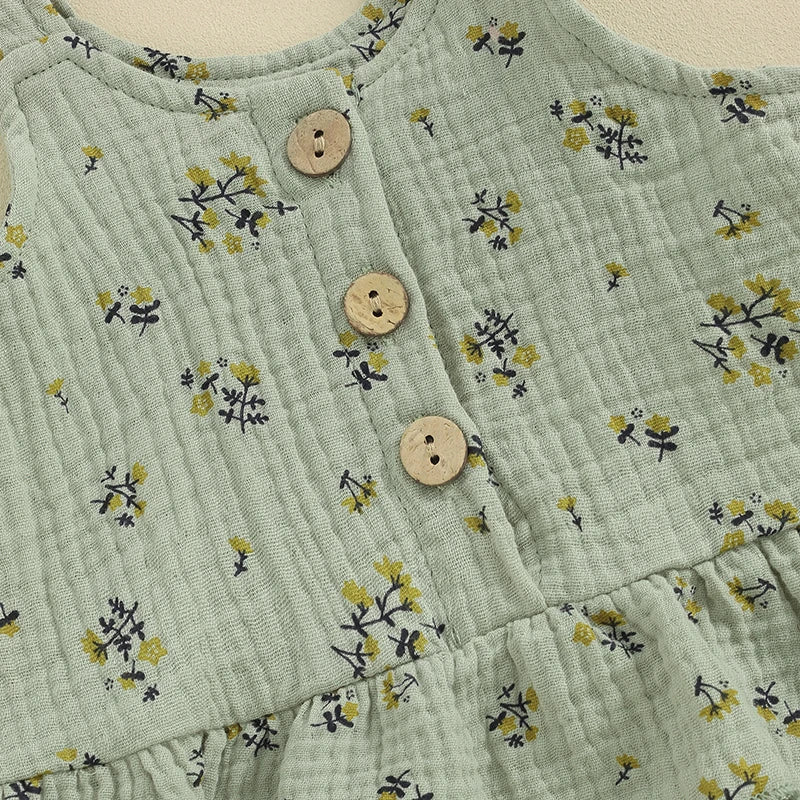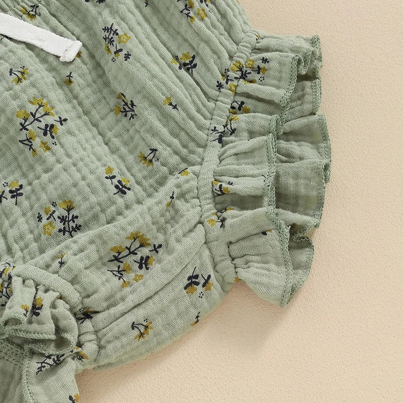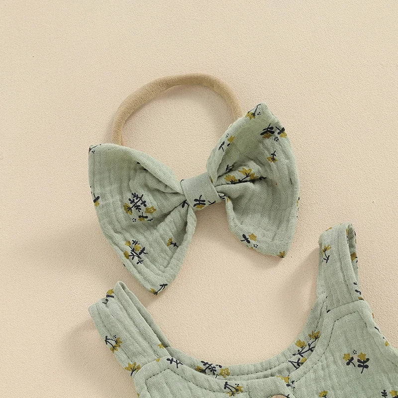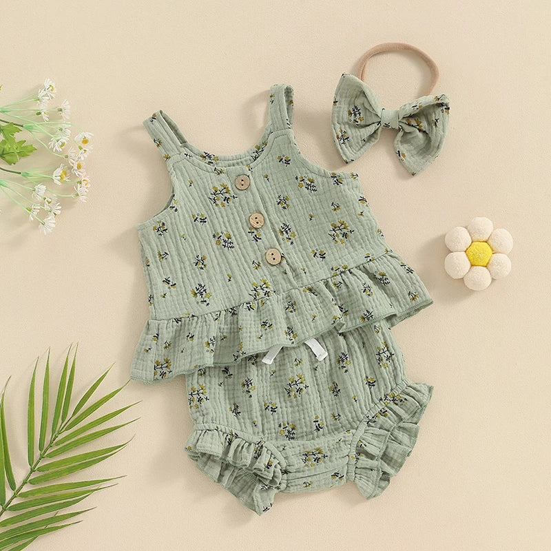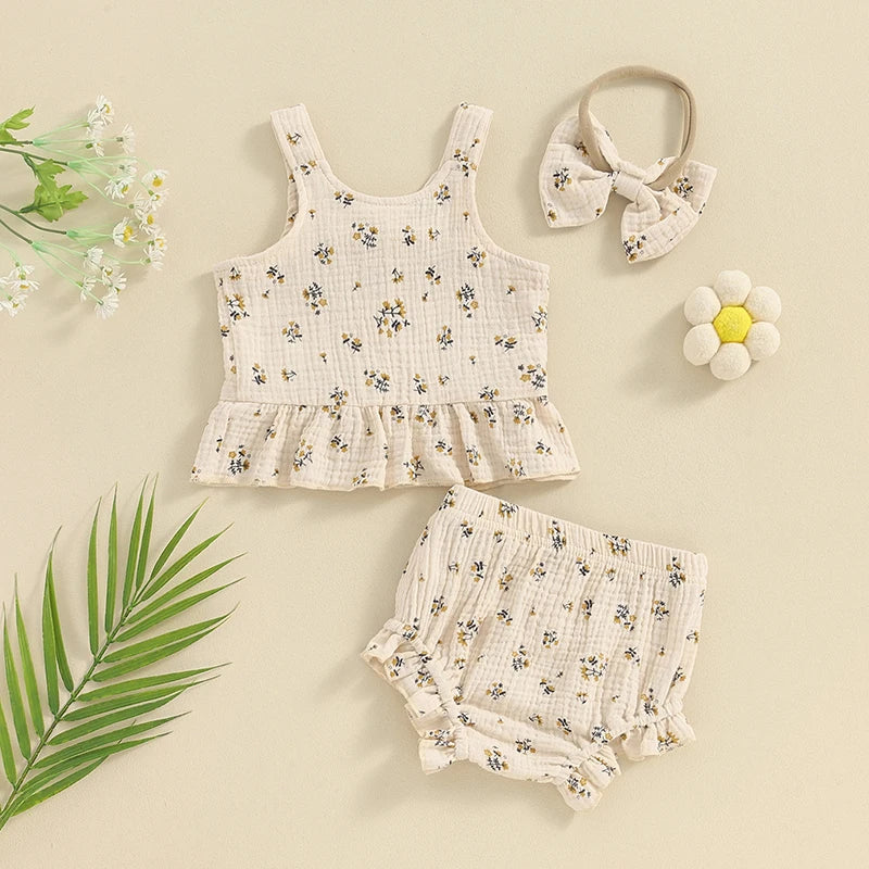 Baby Toddler Girls 3Pcs Summer Set Round Neck Floral Print Tank Top Elastic Waist Frill Trim Shorts Headband 3Piece Outfit