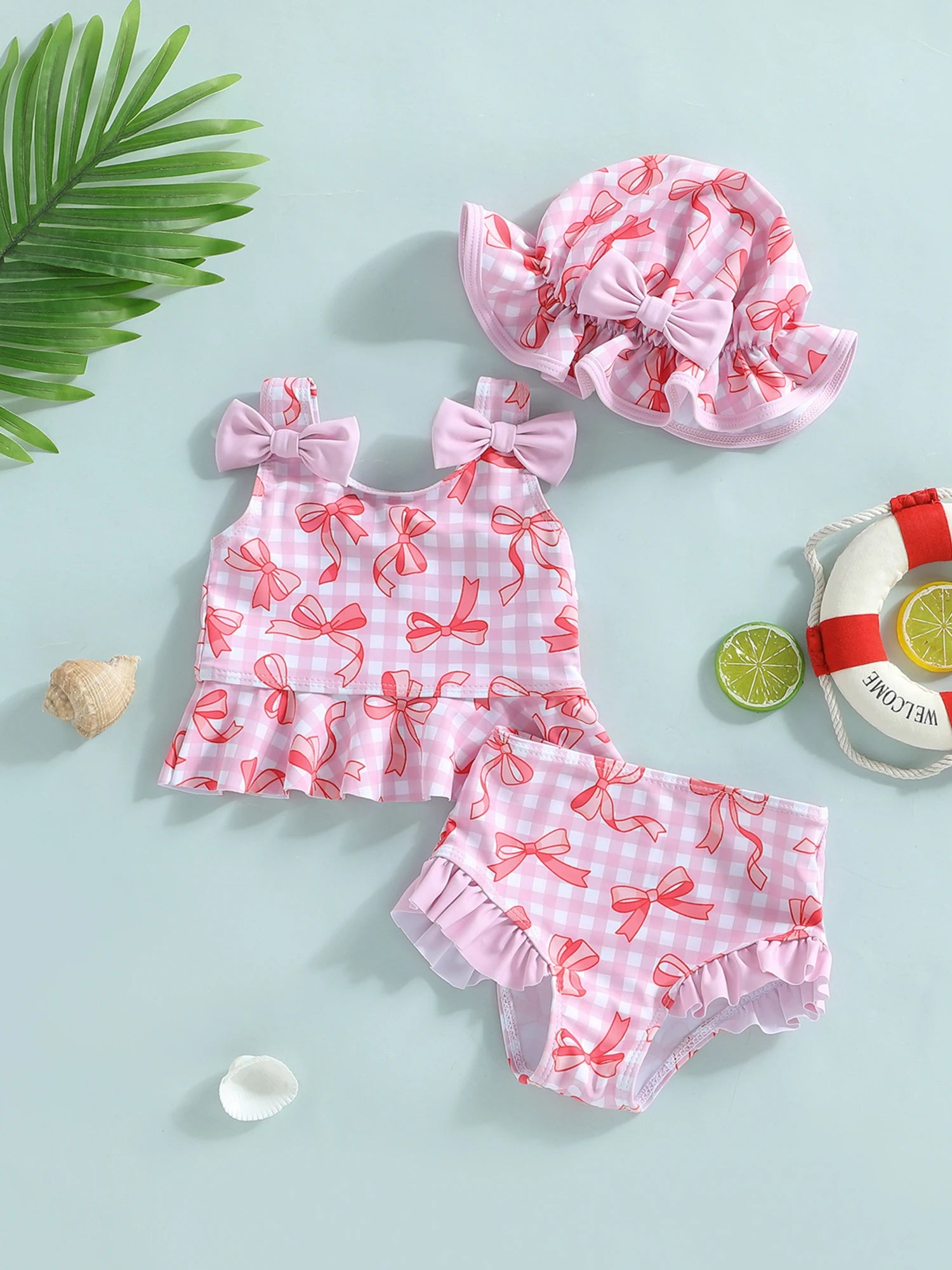 Baby toddler Girls 3Pcs Swimsuit Bow Plaid Print Sleeveless Tank Top with Bloomers and Swimming Hat Set