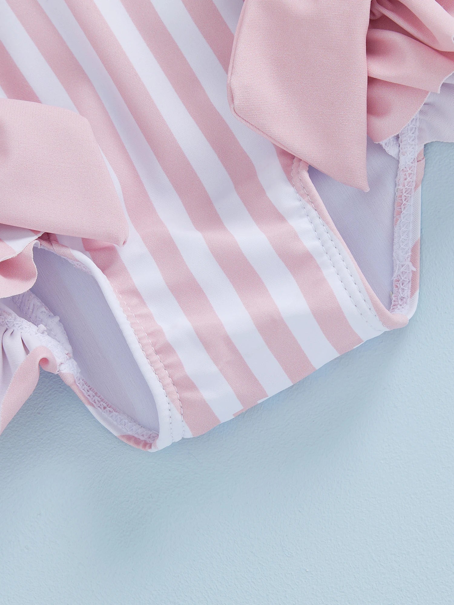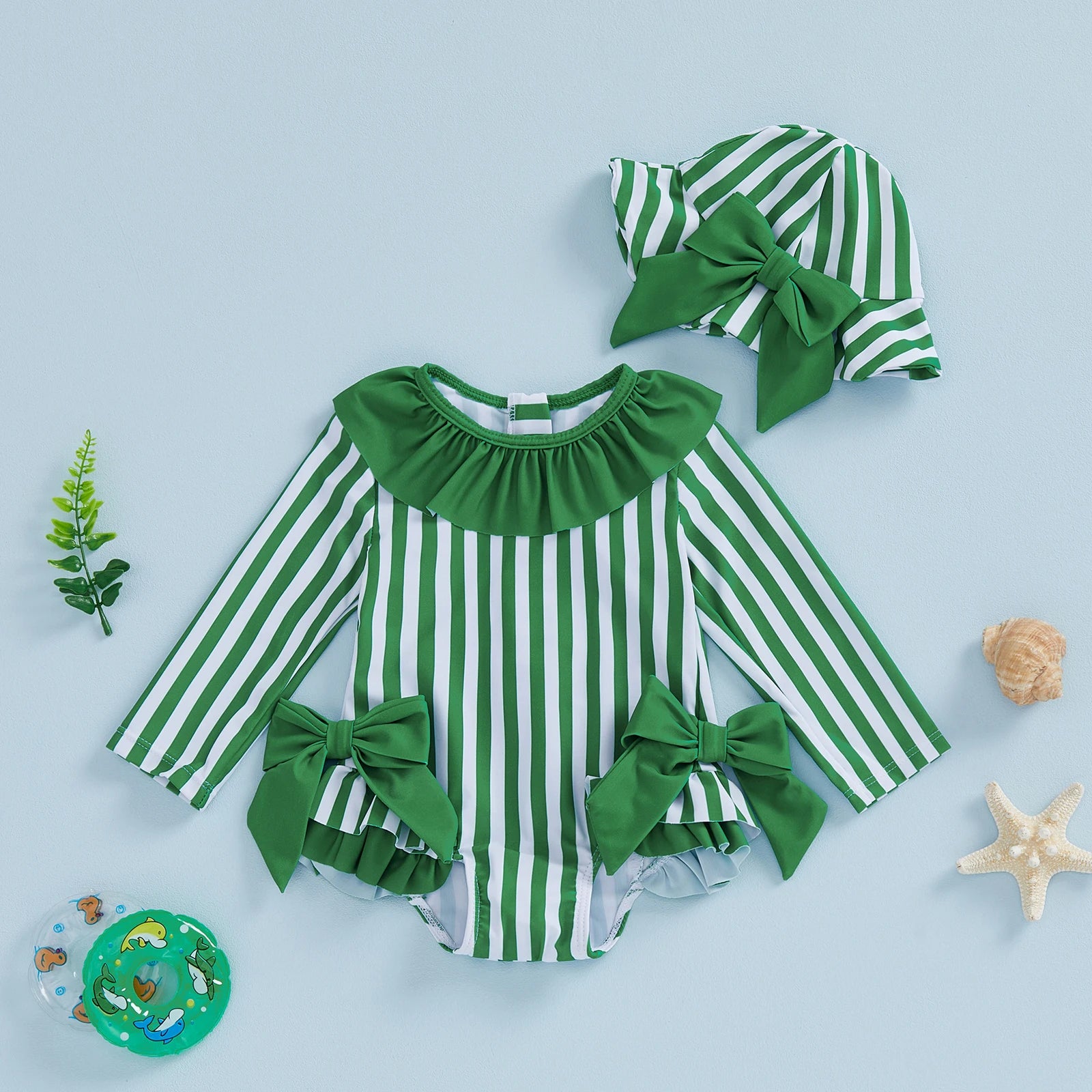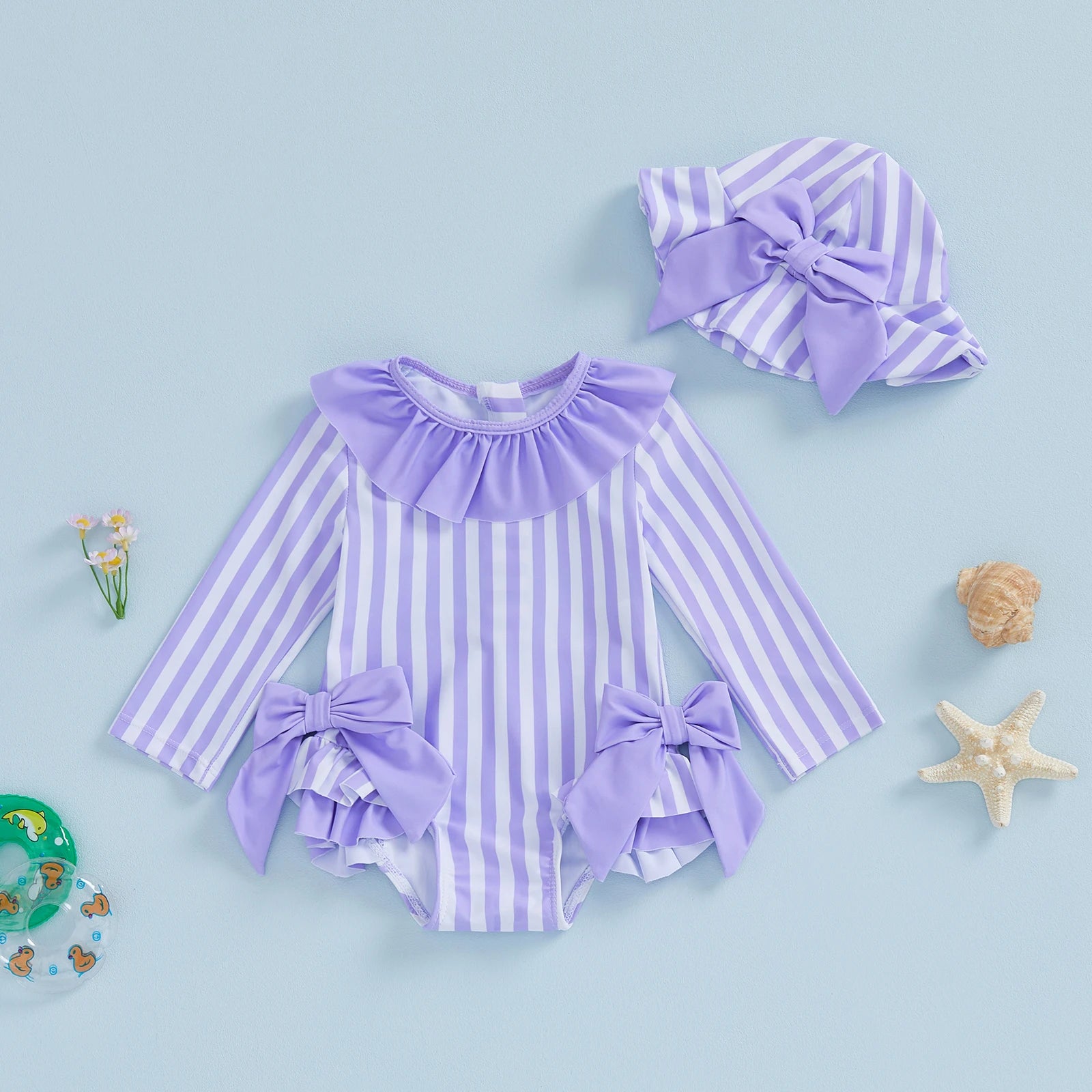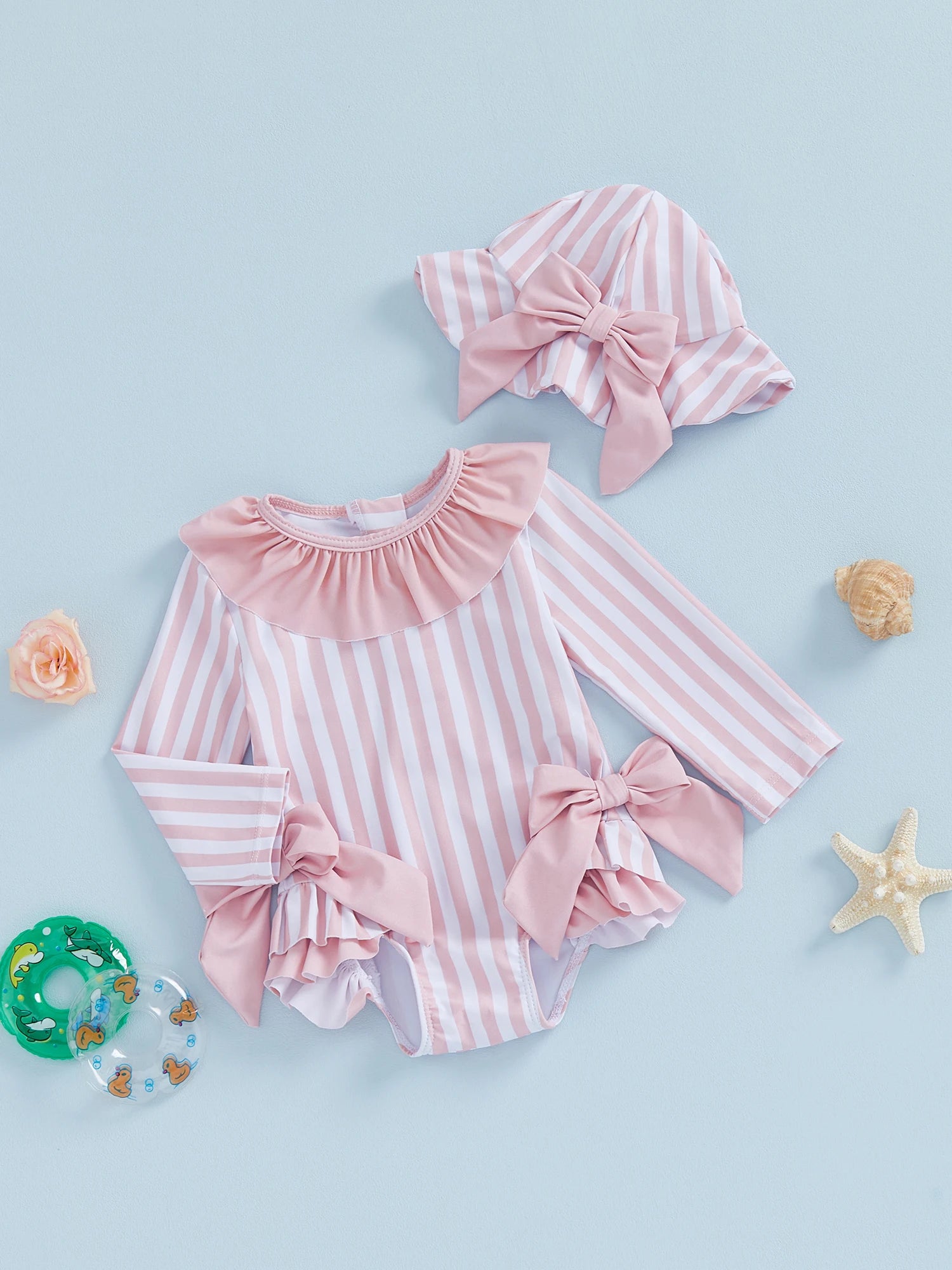 Baby Toddler Girls 3Pcs Swimsuit Ruffles Collar Long Sleeve Striped Print Bow Swimwear with Hat Set