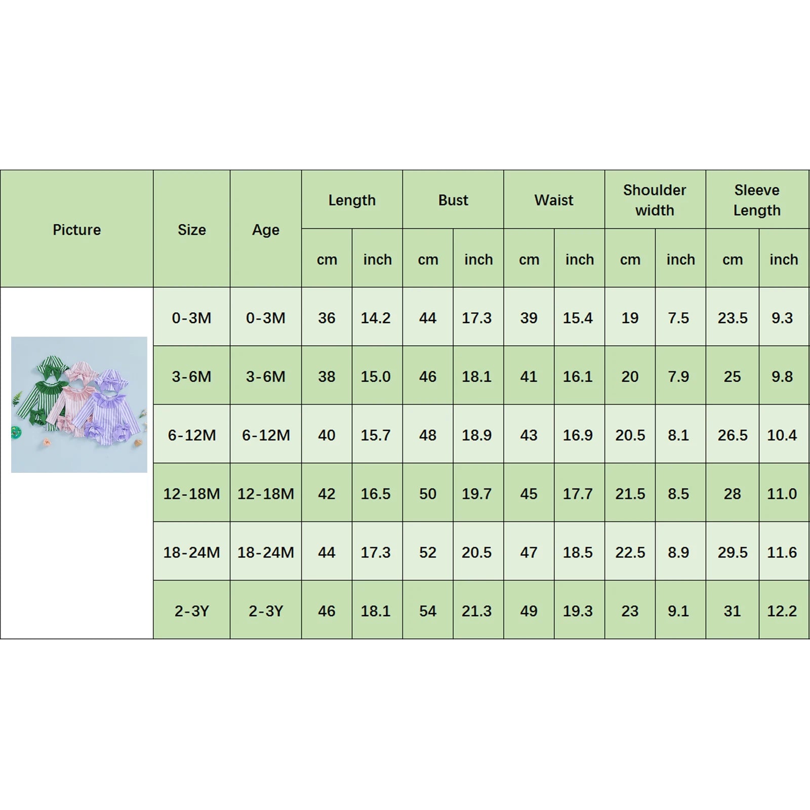 0-3M Length: 14.17 Bust: 17.32 Sleeve: 9.25 Shoulder: 7.48 Waist: 15.35 Suggest Age: 0-3 Months