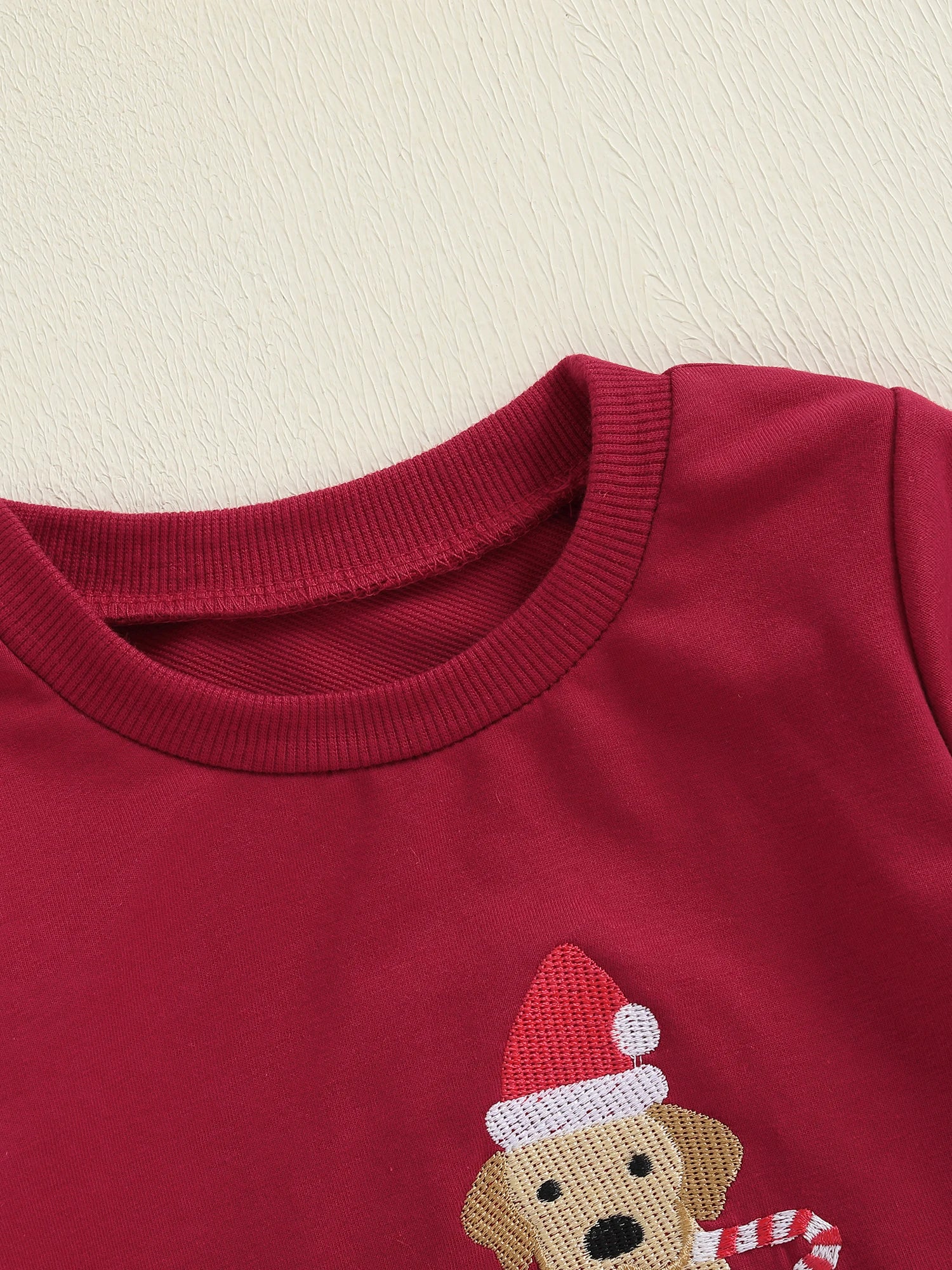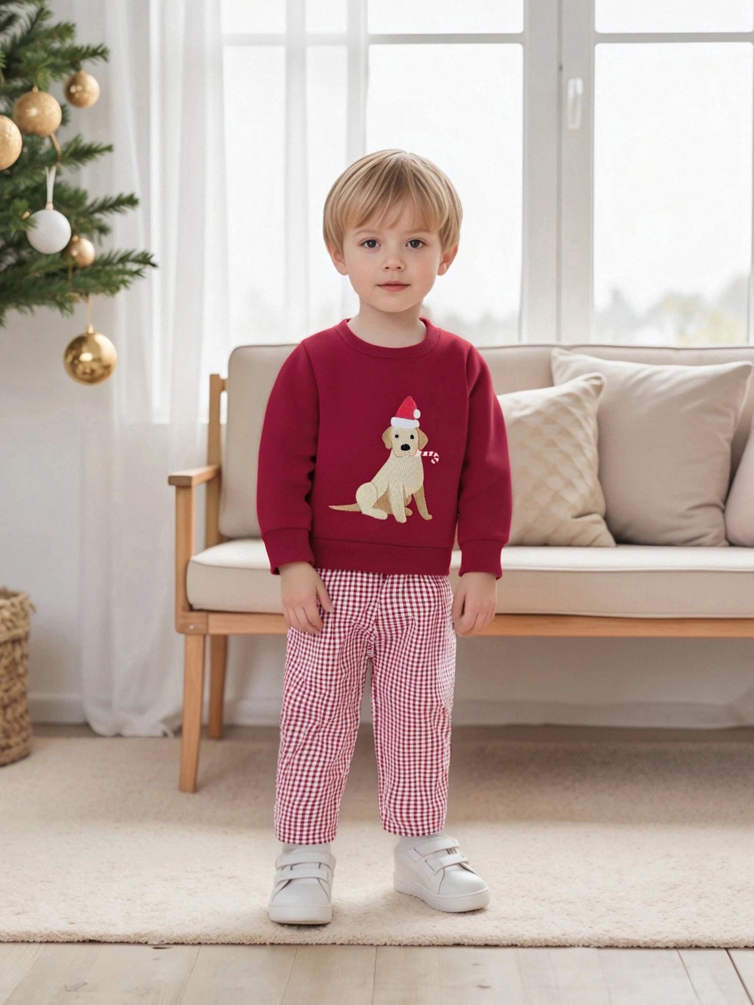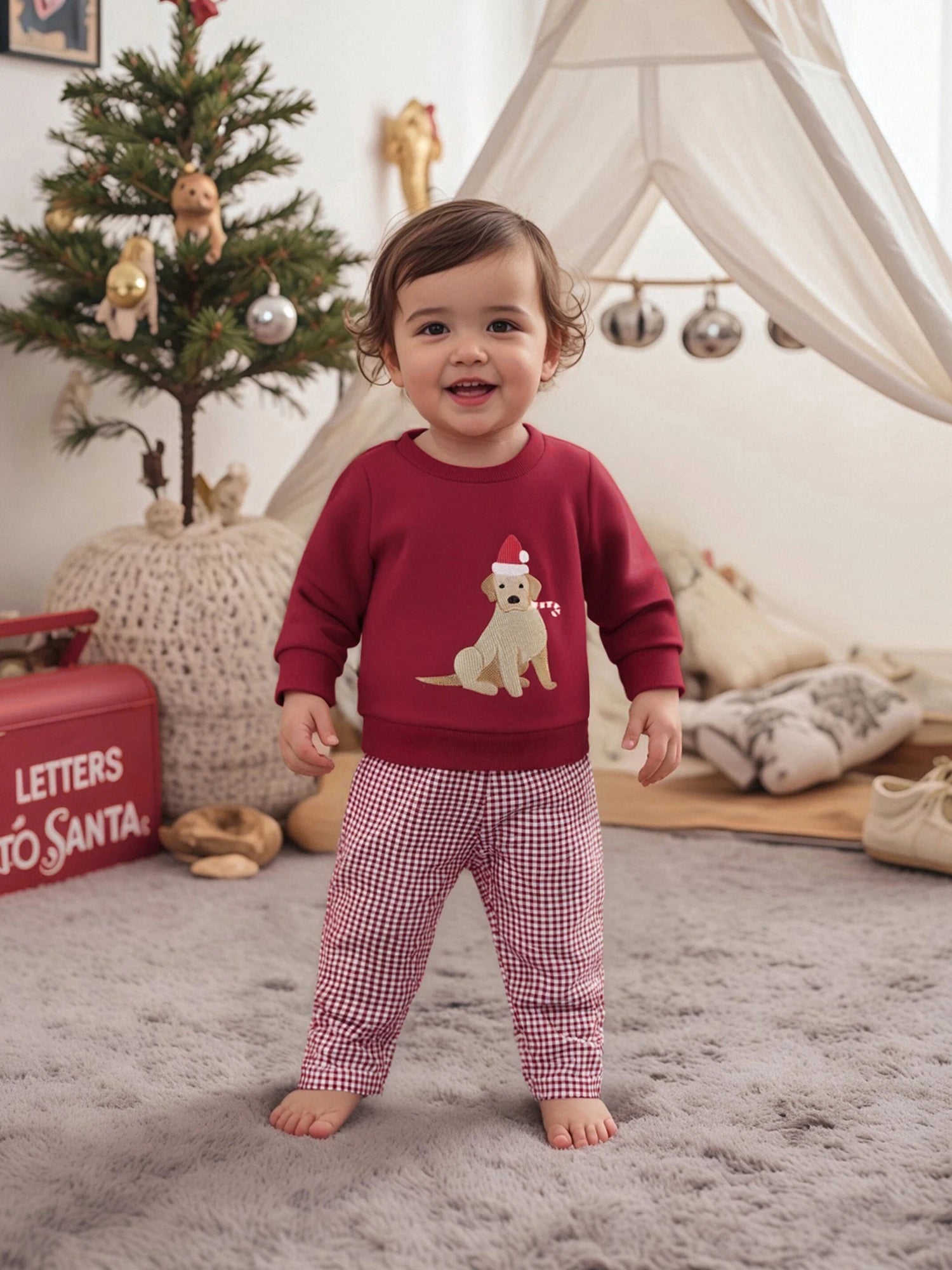 Baby Toddler Girls Boys 2Pcs Christmas Outfit Dog Embroidered Crew Neck Long Sleeve Top and Plaid Pants Set
