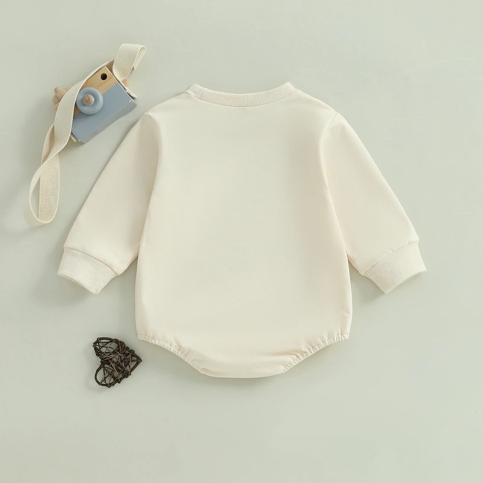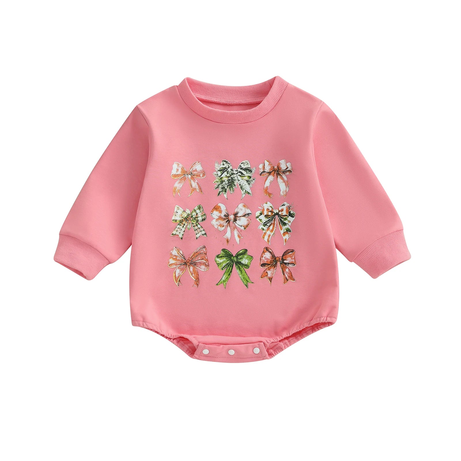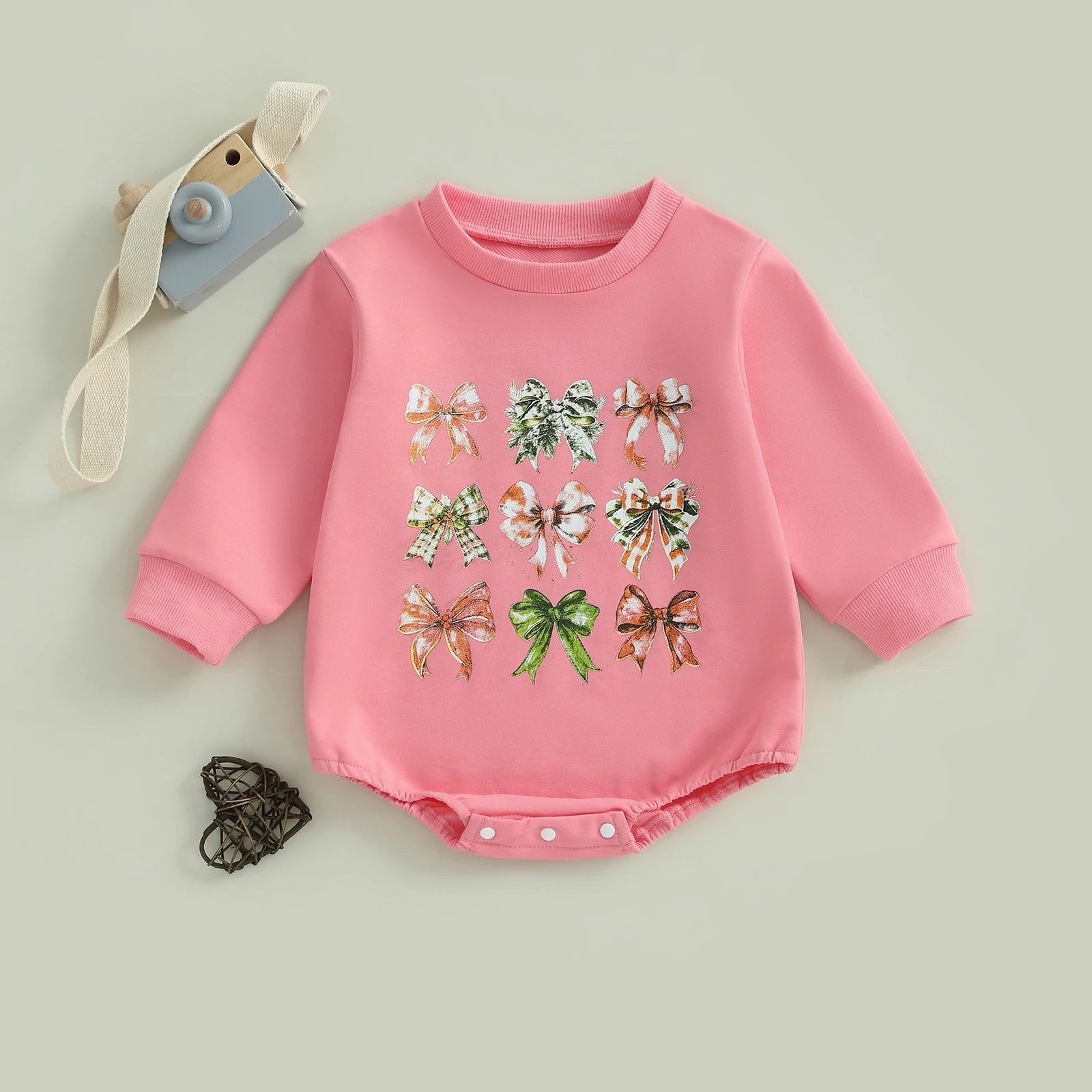 Baby Toddler Girls Christmas Bubble Romper Bow Print Long Sleeve Round Neck Jumpsuit