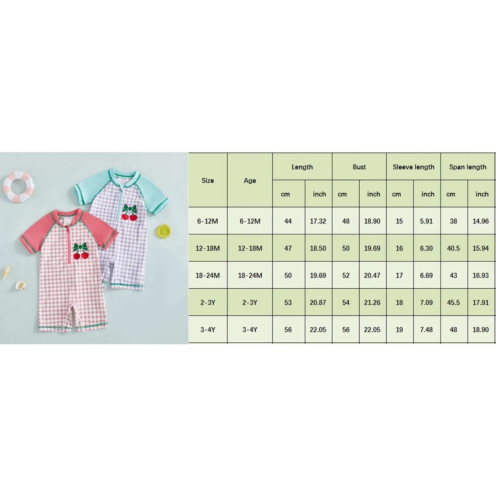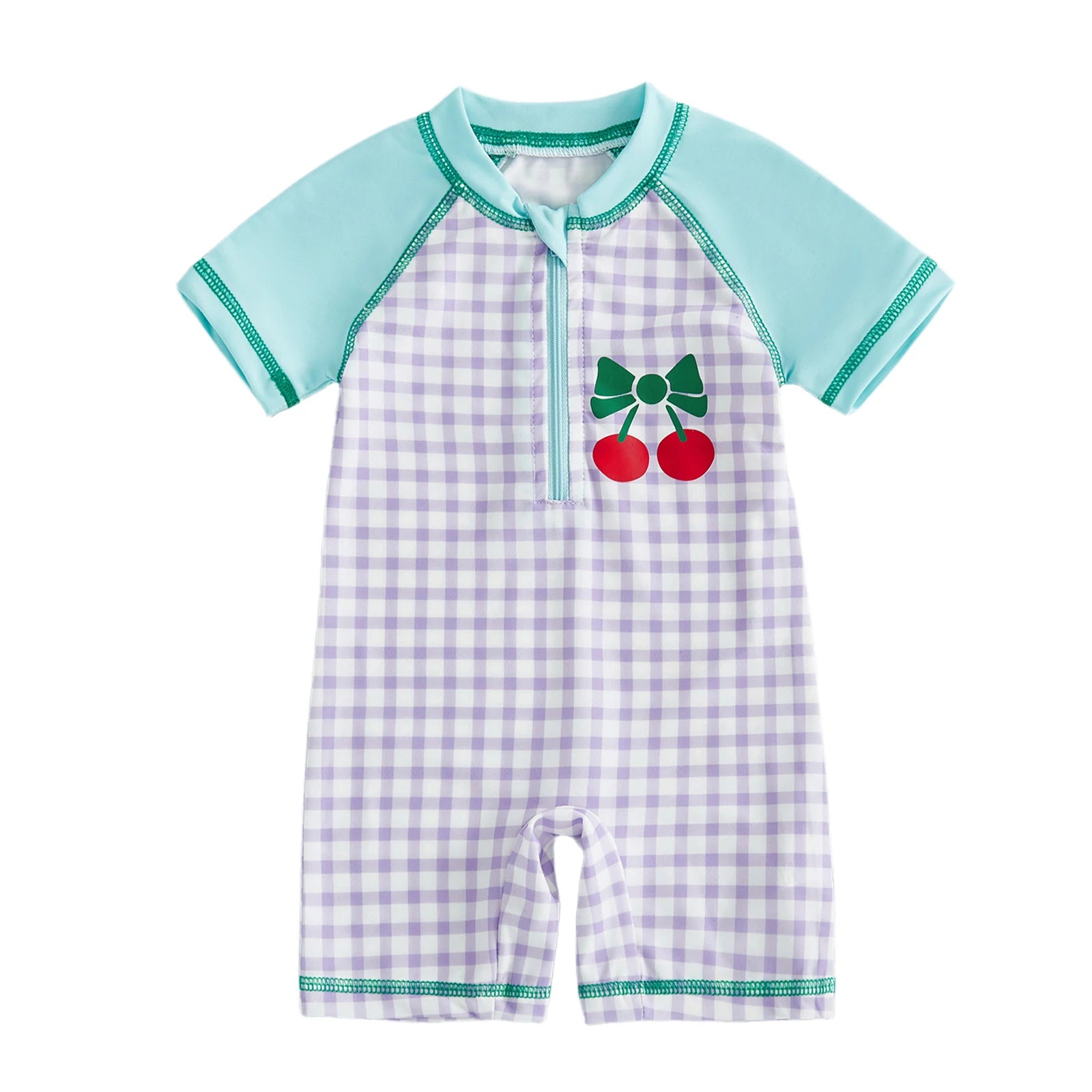 Baby Toddler Girls Rash Guard Swimsuit Plaid Contrast Color Cherry Zip Up Short Sleeve Baby Girls Swimwear Bathing Suit