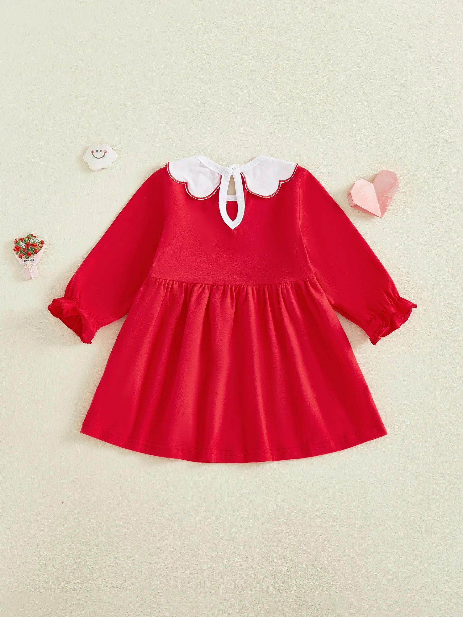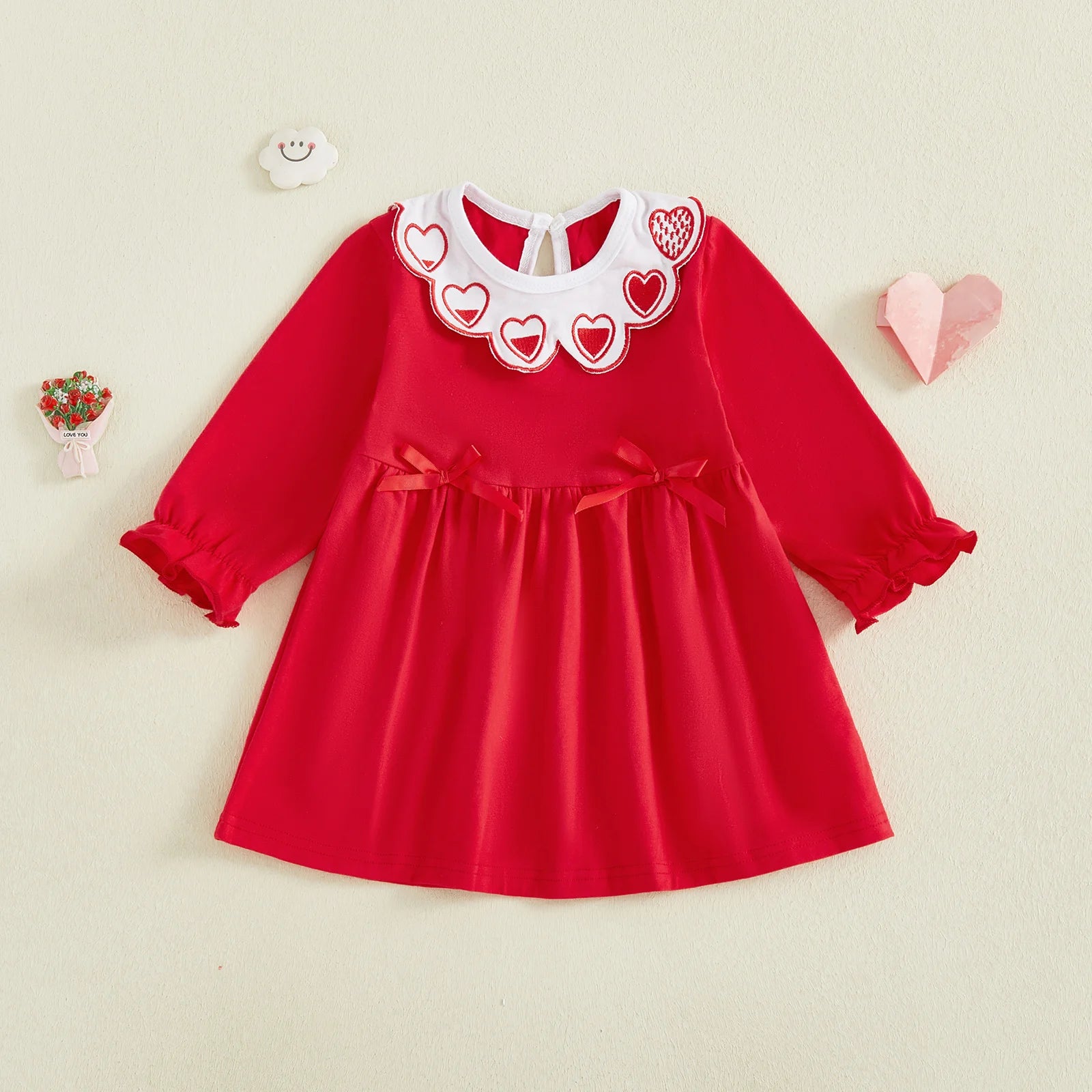 Baby Toddler Girls Valentine's Day Dress Heart Embroidery Collar Bow Decorated Long Sleeve Round Neck Dress