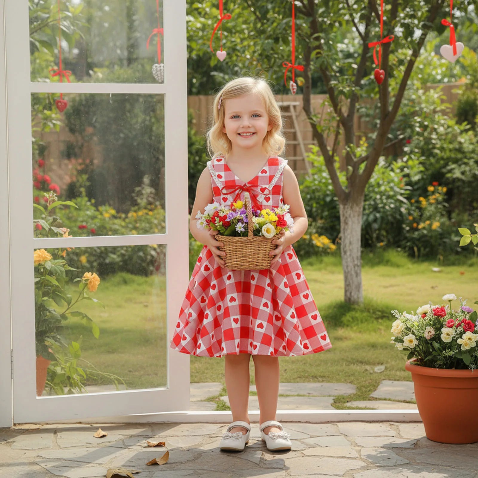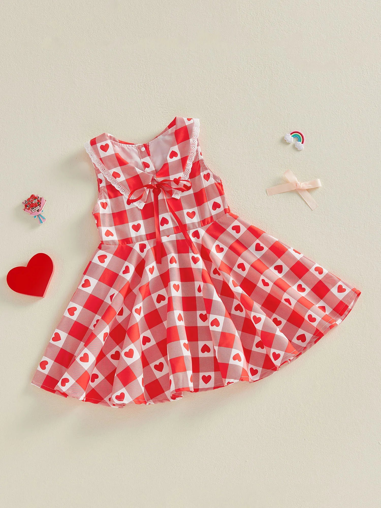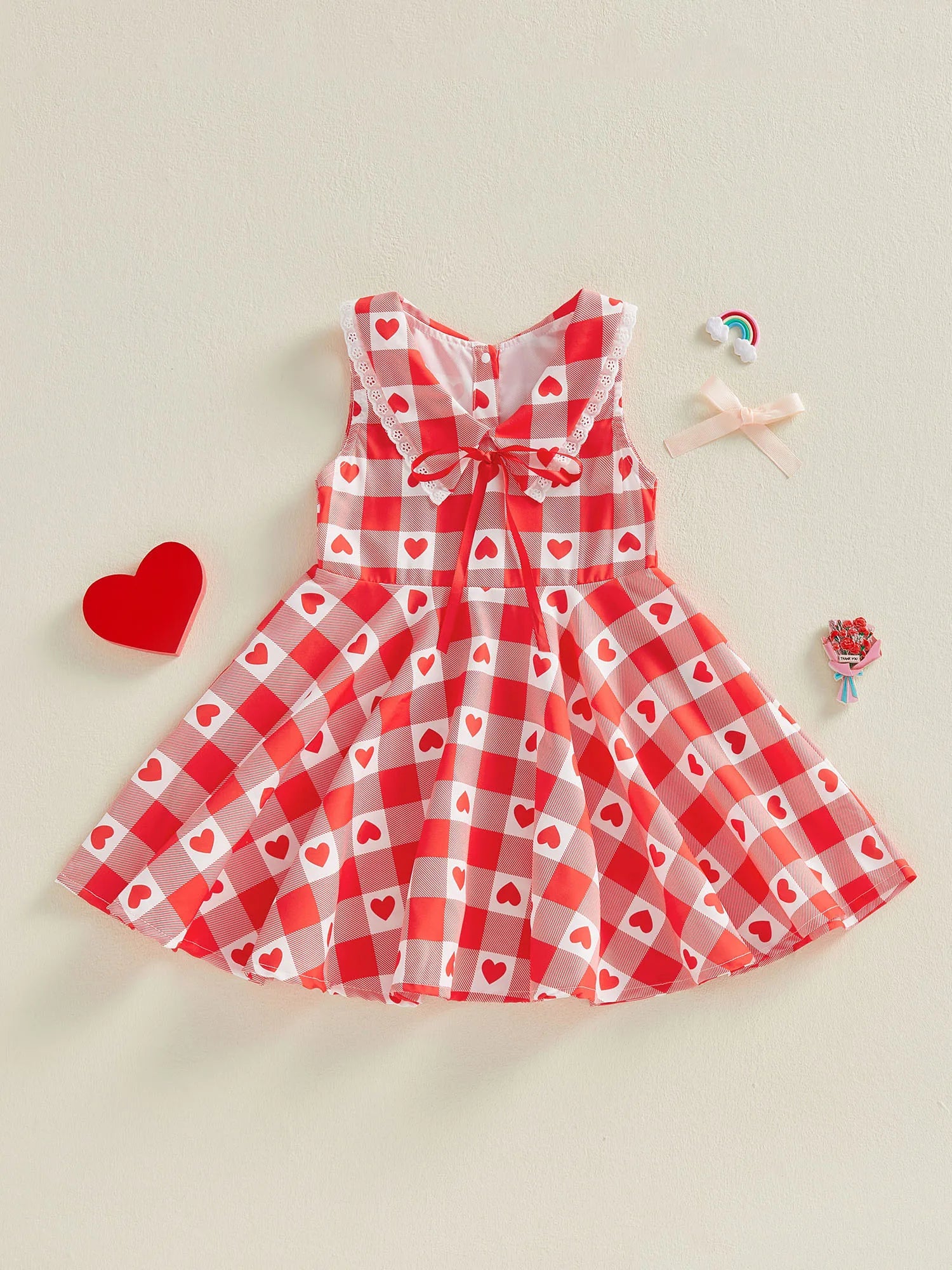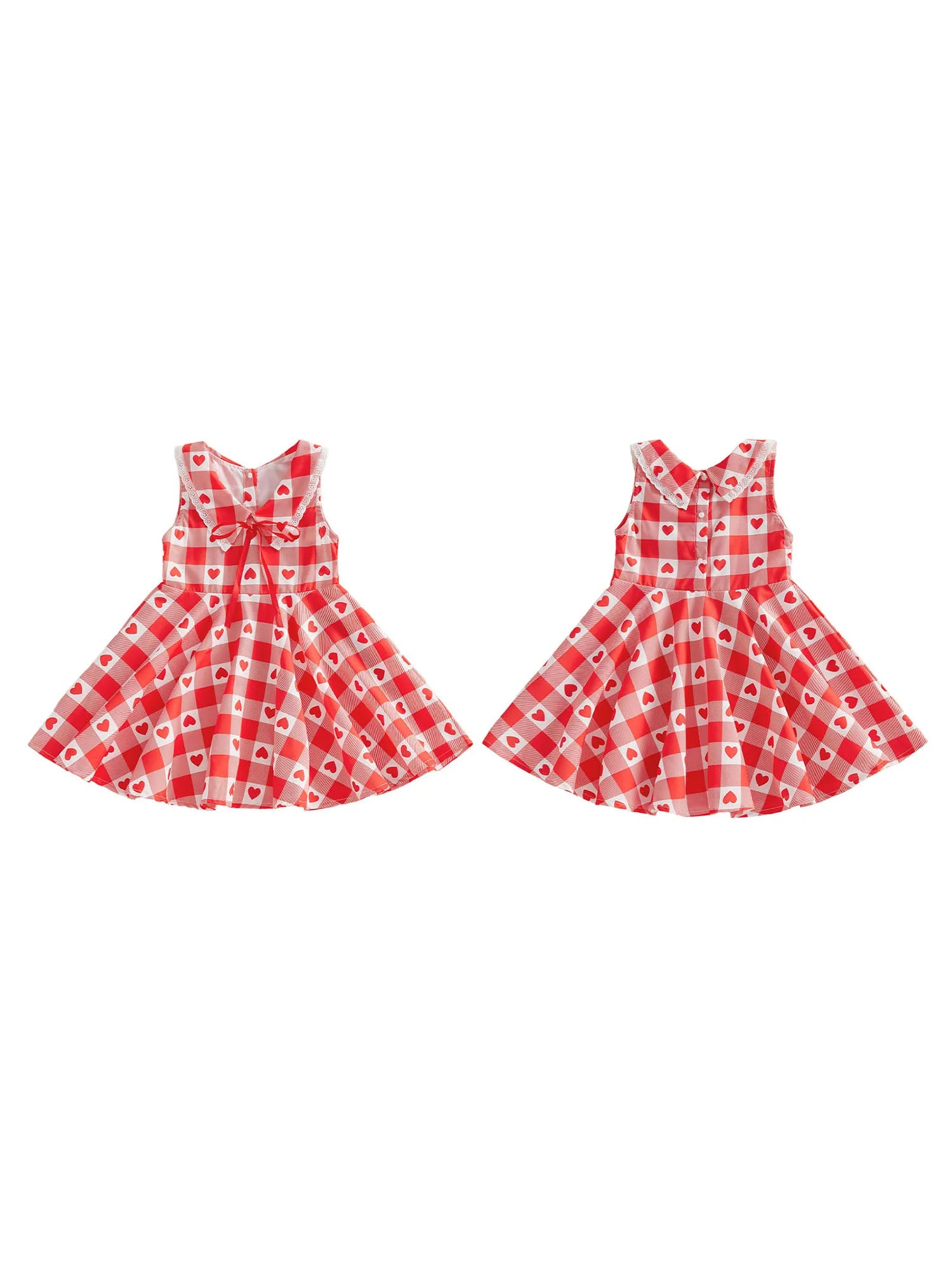 Baby Toddler Kids Girls Valentine's Day Dress Summer Sleeveless Lapel Plaid Heart Print Sweet A-Line Sundress