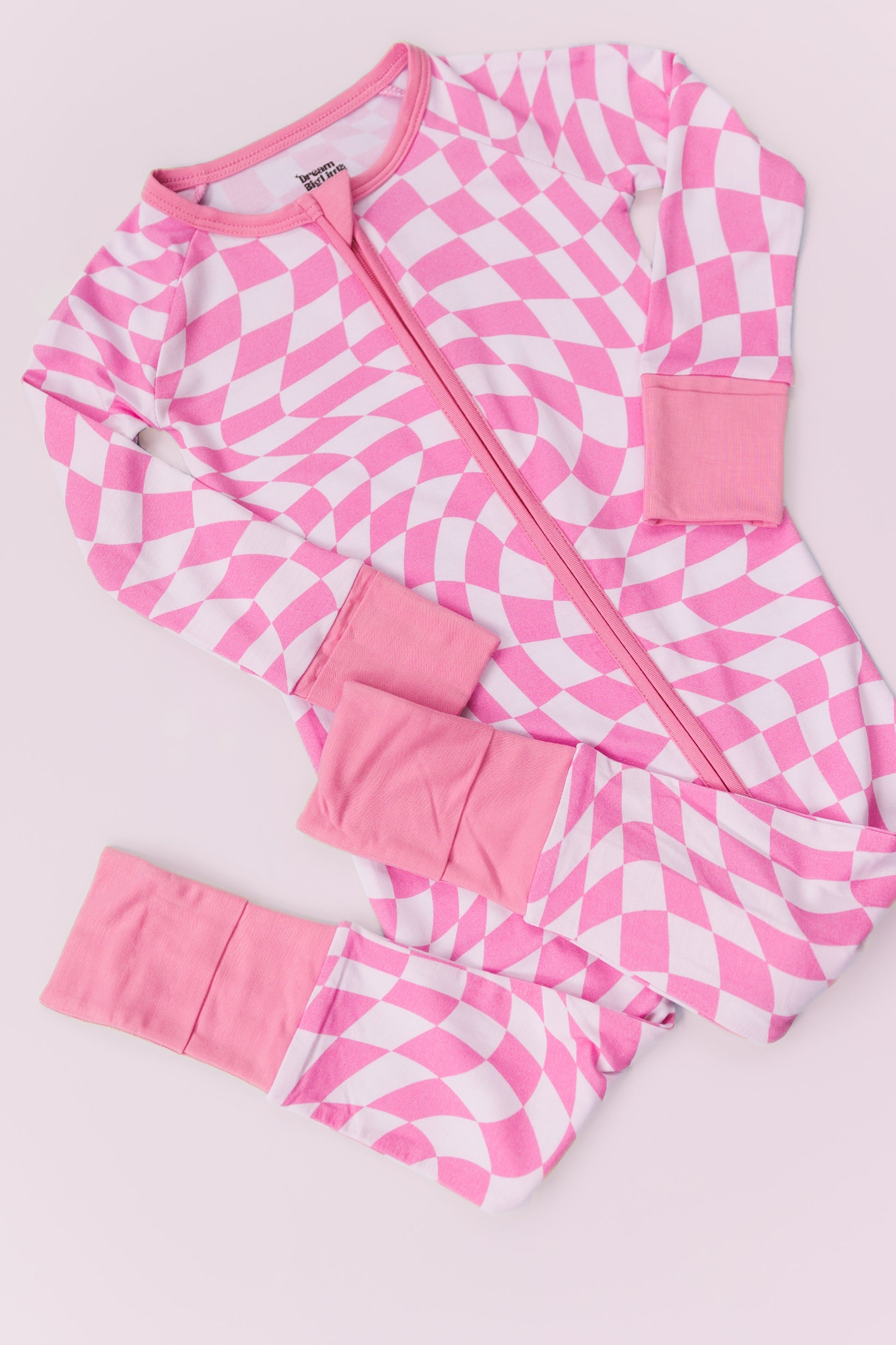 Get ready to rock this Bubblegum Wavy Checkers Dream Romper! Made with bamboo material, this long sleeve bodysuit is not only soft and comfortable, but also features a playful bubblegum wavy checkers print. Perfect for both sleeping and playing, this romper will add a pop of fun to your wardrobe!