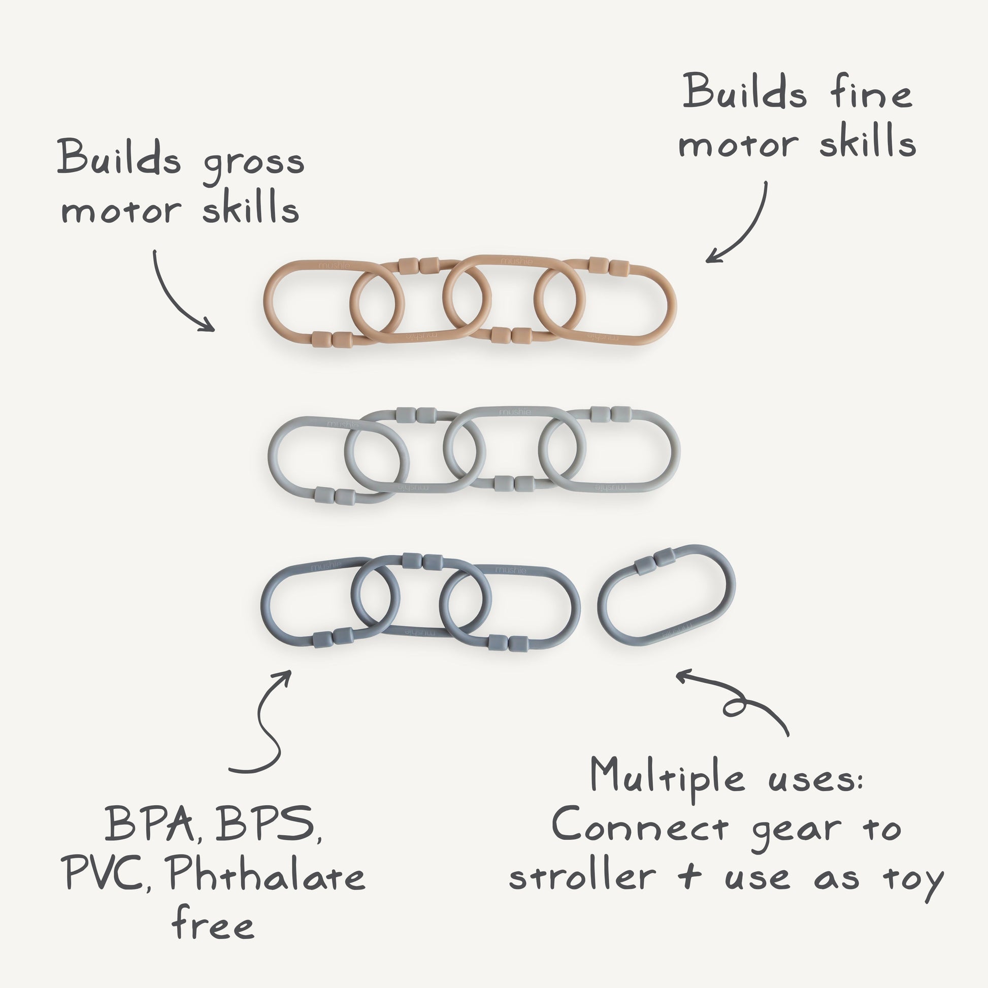 Keep toys within reach while engaging littles in a playful learning experience with our chain link rings. These durable, yet flexible plastic links can quickly attach toys to strollers and car seats, ensuring that favorite companions are always close by. Each set features three soft colors to help engage little ones and improve sorting skills. The minimal design and smooth, lightweight non-toxic material makes it easy for small hands to grasp and manipulate, enhancing fine motor skills.