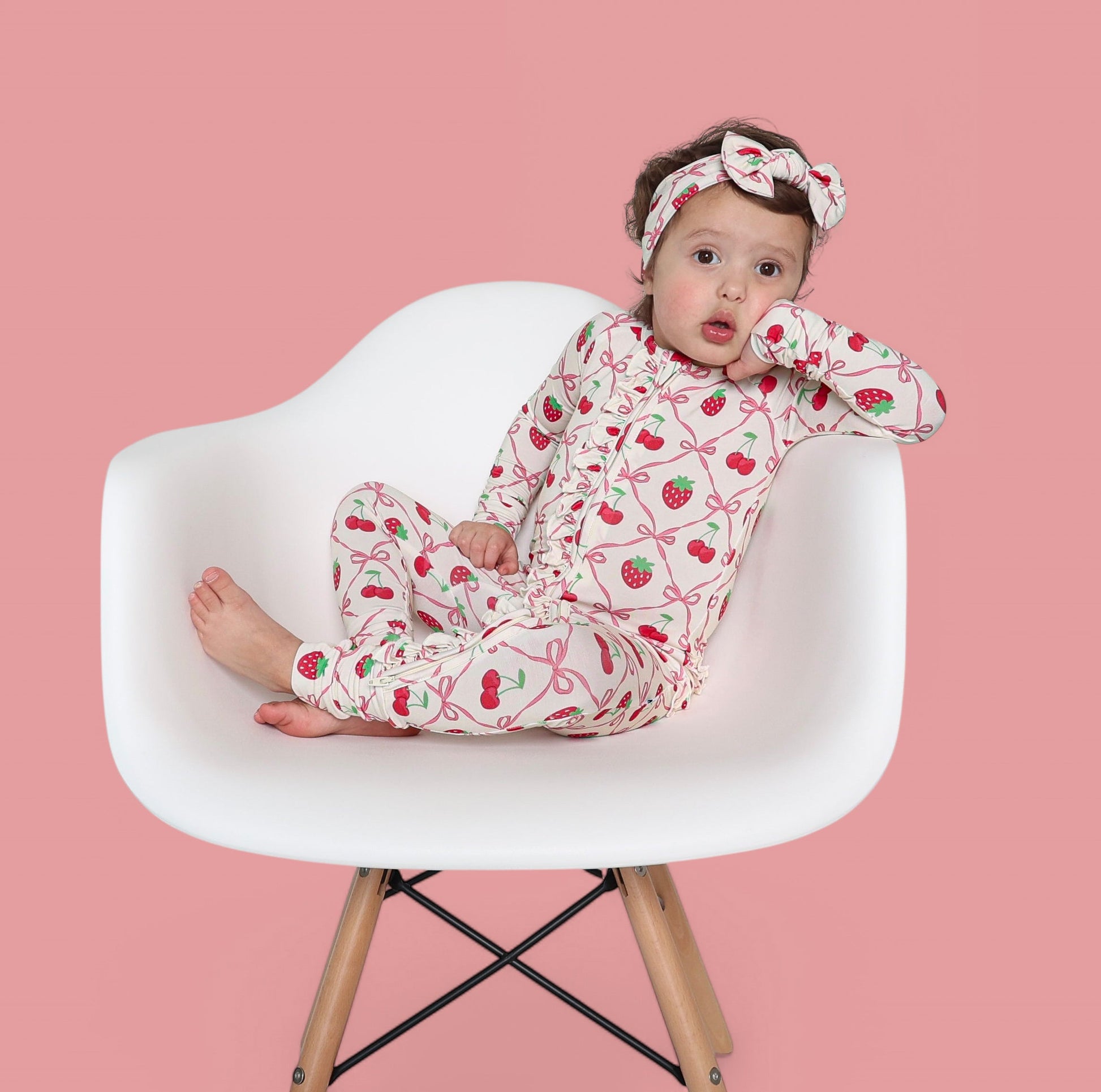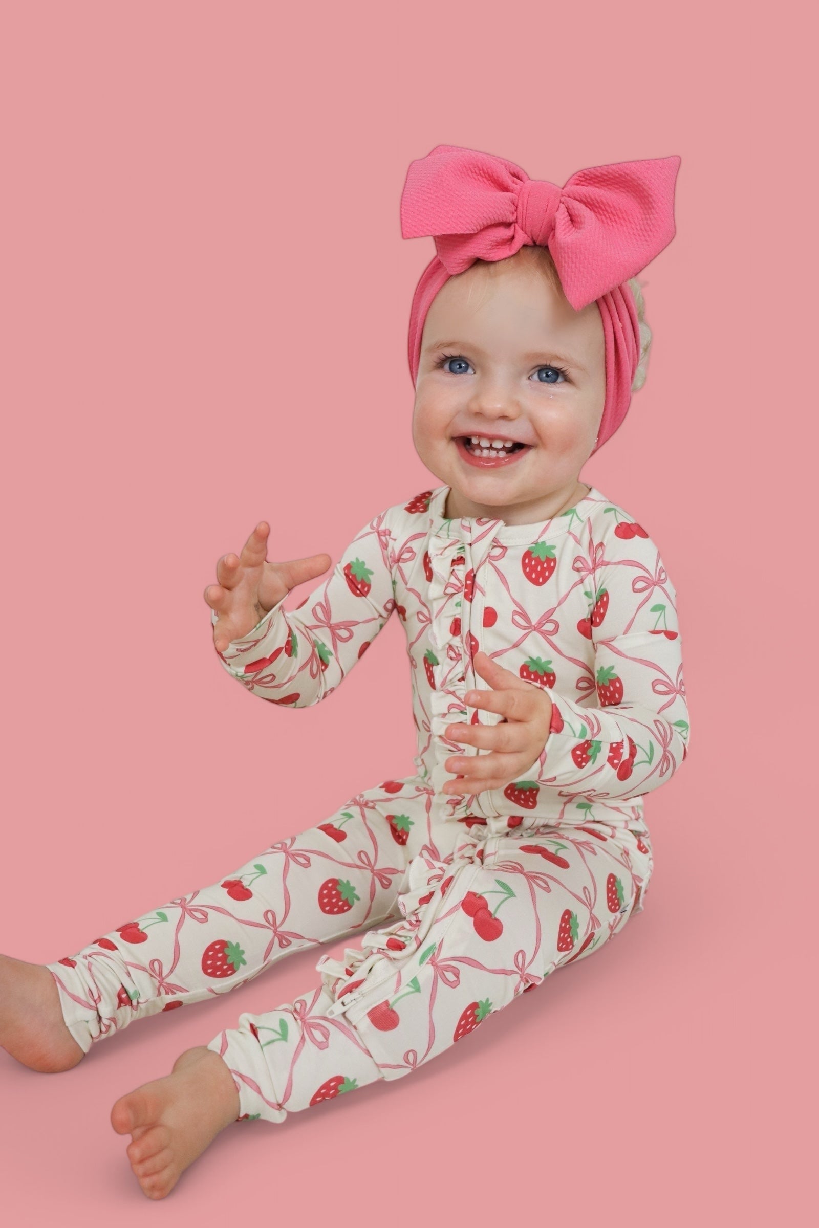 The cherry and strawberry print, paired with sweet pink bows on a soft creamy background, captures the essence of summer in every stitch. It's a timeless design that blends nostalgia with freshness, making it a wardrobe must-have. Whether for playdates or nap time, your baby will feel as beautiful as they look in this adorable romper. Thoughtfully designed for comfort and style, it’s the perfect addition to your baby’s spring wardrobe!