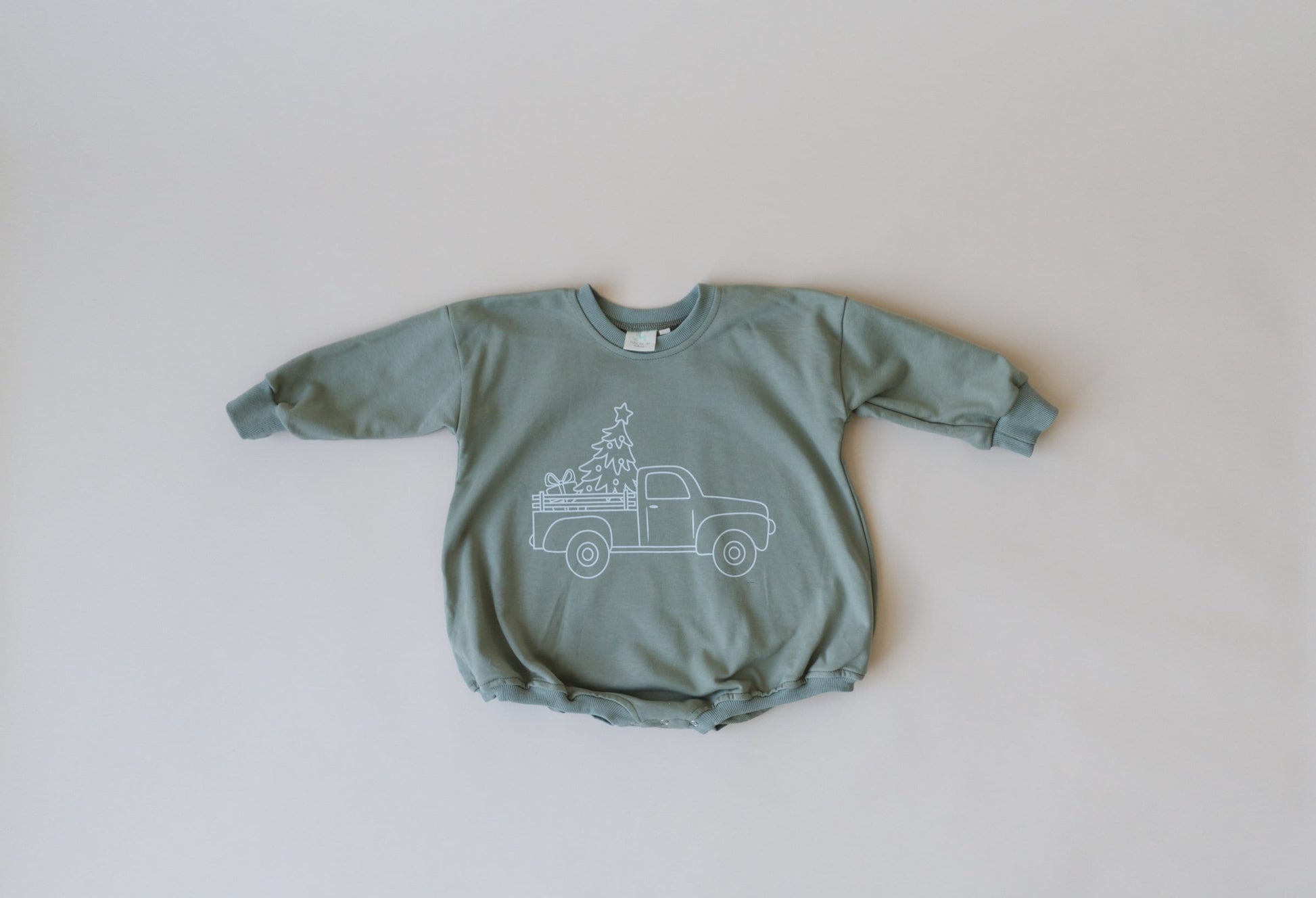 Christmas tree truck graphic oversized sweatshirt romper with snaps at crotch. Lightweight terry material.