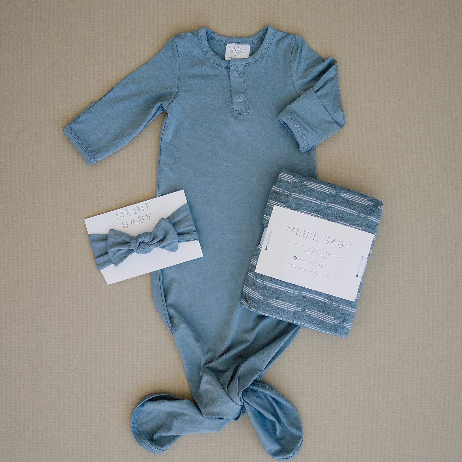 This is a one size head wrap that will fit size newborn and up. It is made out of a soft Bamboo Rayon. They are tied in a simple square knot making it easy to resize on your little ones head. We love how soft they are and the neutral designs they come in. They each have matching stretch knot gowns and swaddles in our shop.