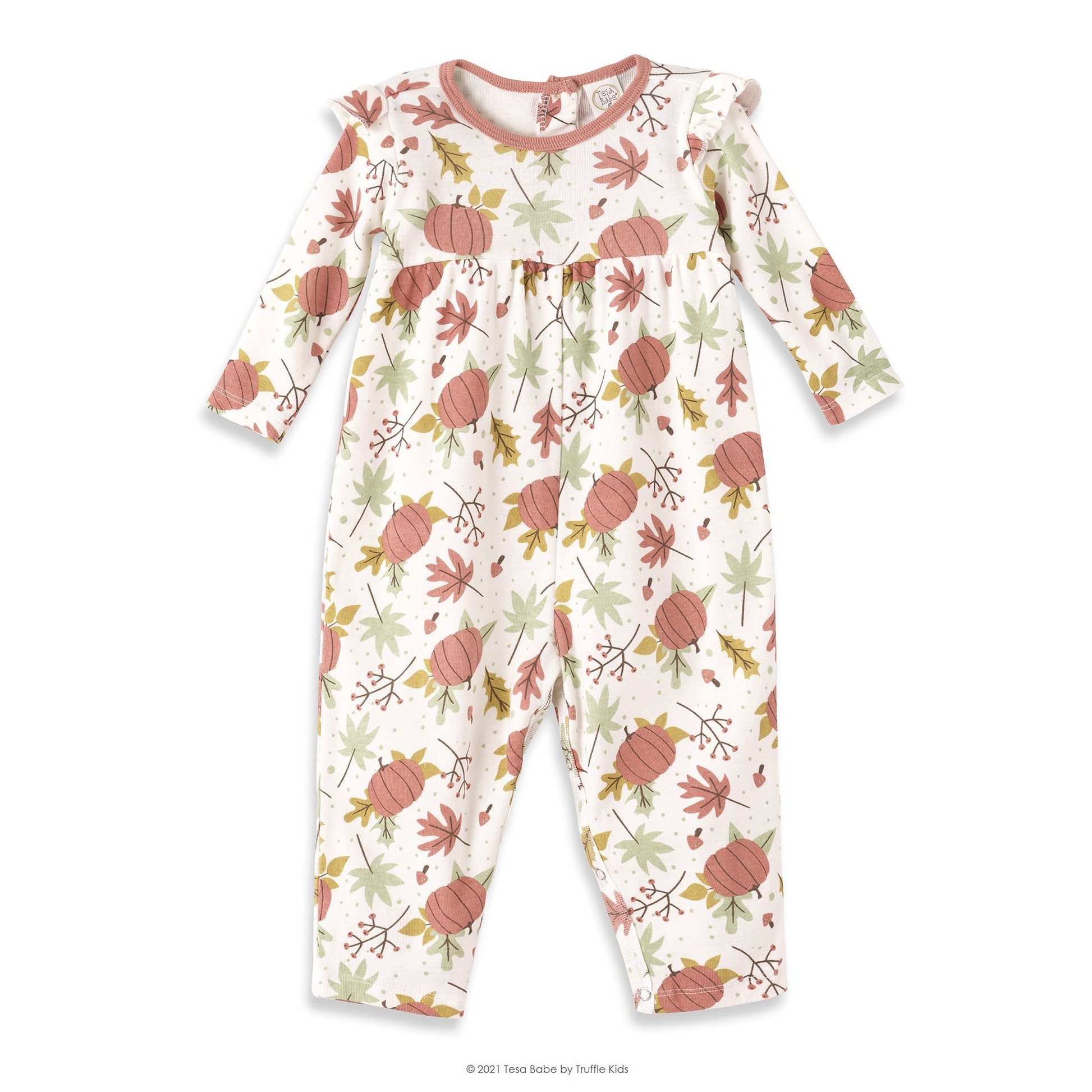 Fall Harvest Empire Waist Bubble Romper. Made of ultra-soft and stretchy bamboo/cotton. Bamboo is hypoallergenic, offers excellent ventilation and heat regulation, is sweat resistant and eco-friendly. Machine Wash Warm, Tumble Dry Low. 67% Bamboo, 28% Cotton, 5% Spandex. Optional headwear completes the outfit. Snaps at bottom and neck for easy on and off.