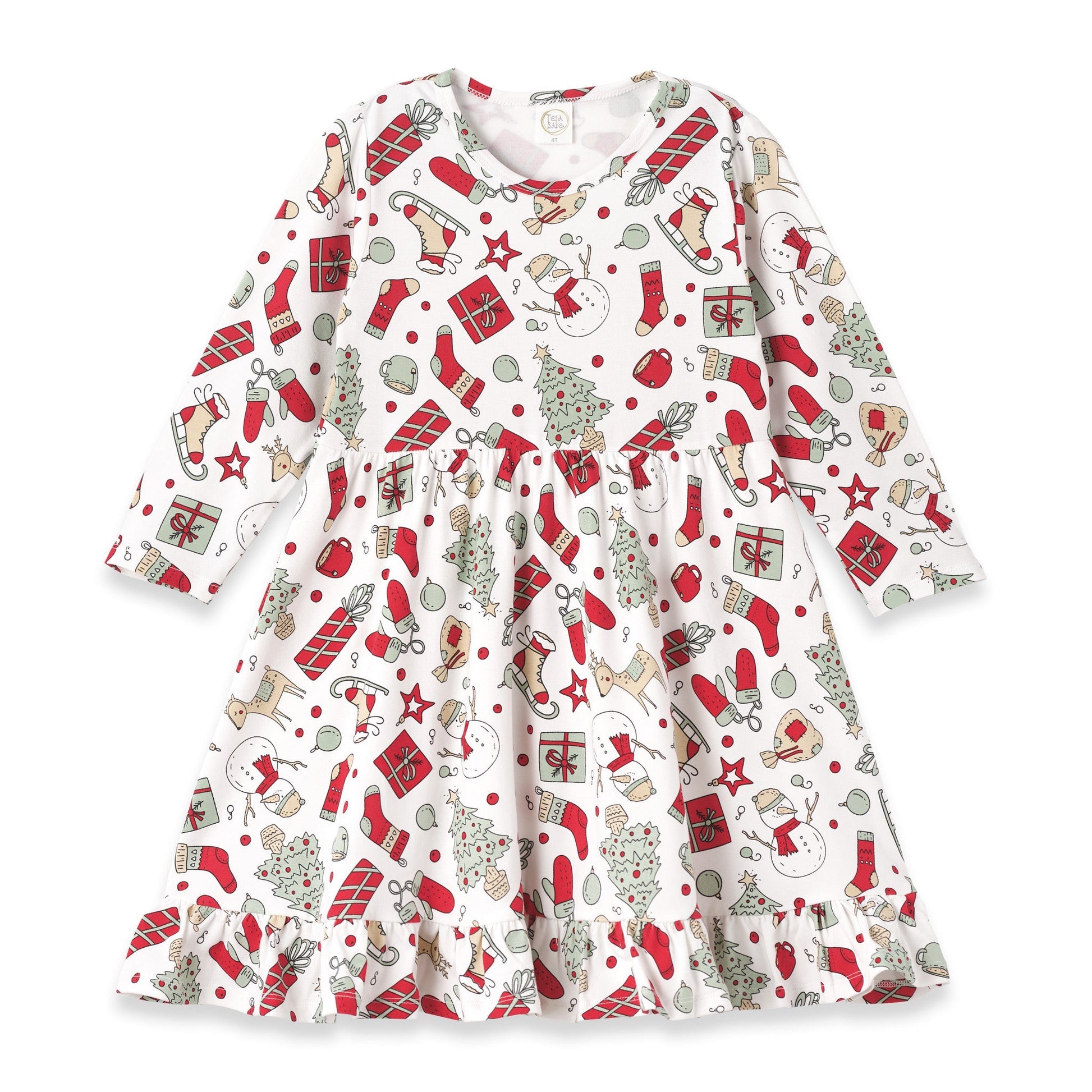 Holiday Twirl Dress: Celebrate the season with this festive Christmas dress adorned with cheerful holiday motifs. This ultra-soft twirl dress is crafted from a bamboo, cotton, and spandex blend jersey, featuring a playful bottom ruffle for extra flair. It's absorbent, hypoallergenic, eco-friendly, and sweat-resistant, ensuring she looks adorable and stays comfortable. Care is simple—machine wash warm and tumble dry low. Perfect for holiday festivities!