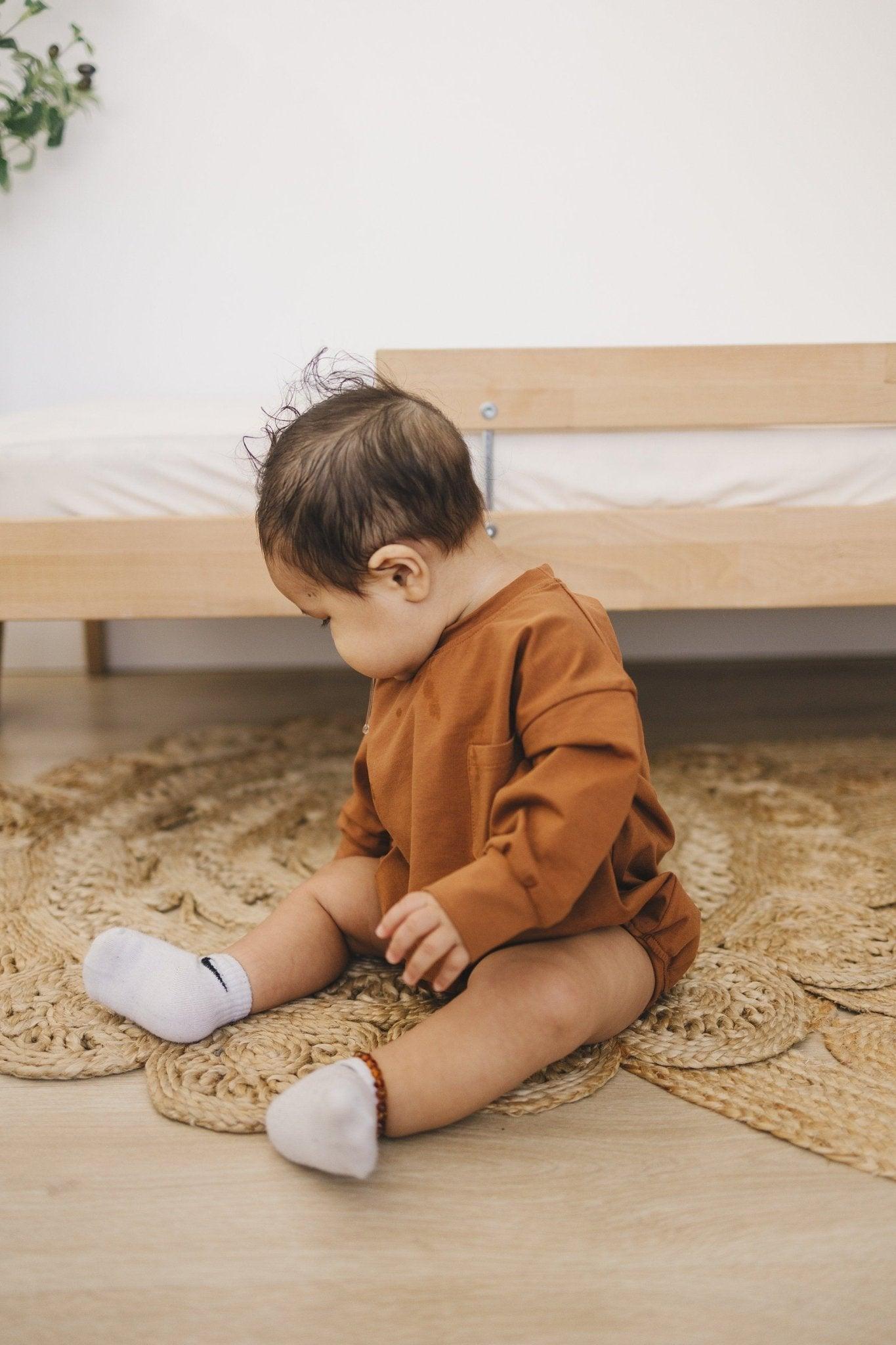 Introducing our Long-Sleeved Pocket Tee Romper, a must-have for your little one's wardrobe! This romper is crafted with care from 100% cotton, ensuring a soft and comfortable feel against your baby's delicate skin.