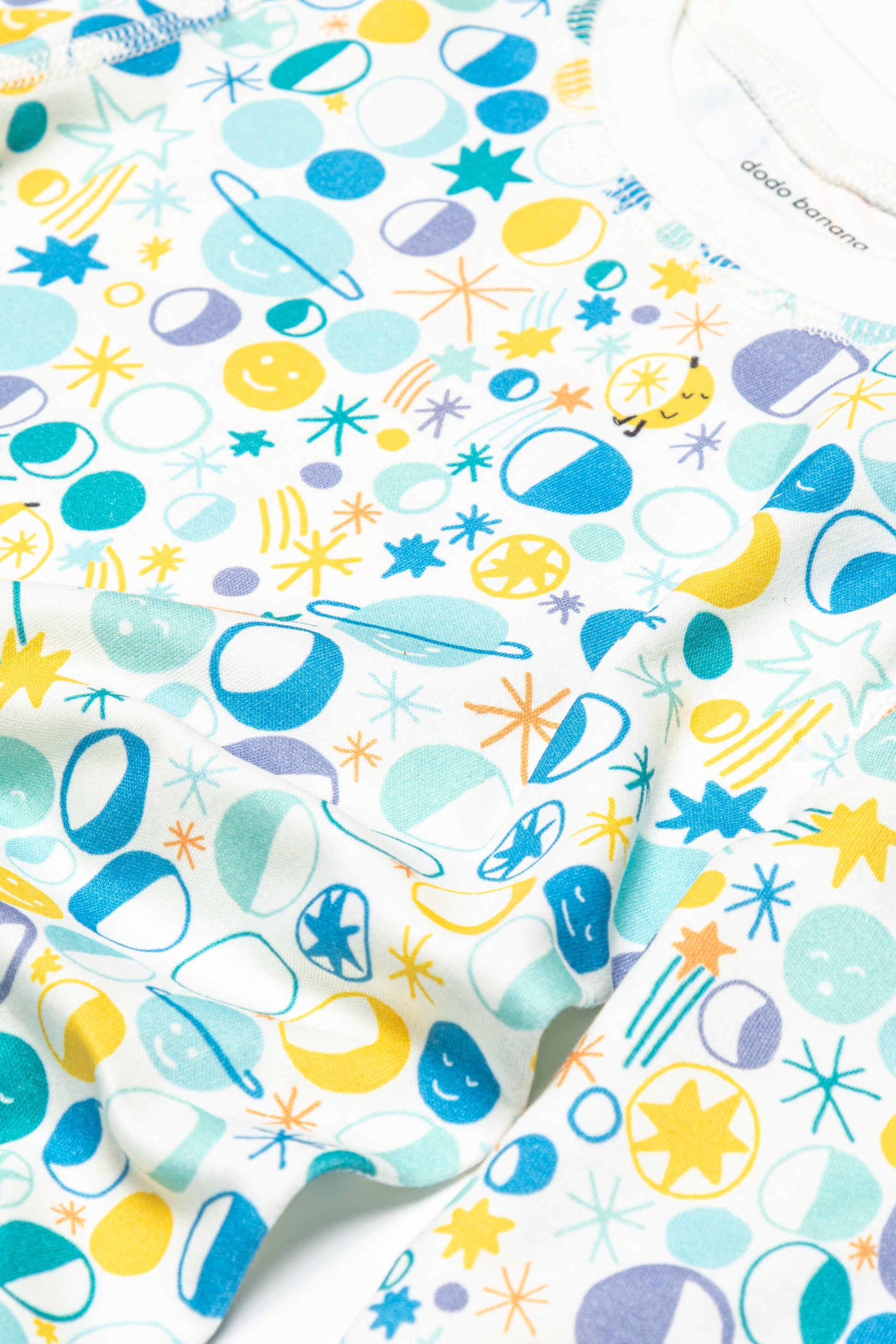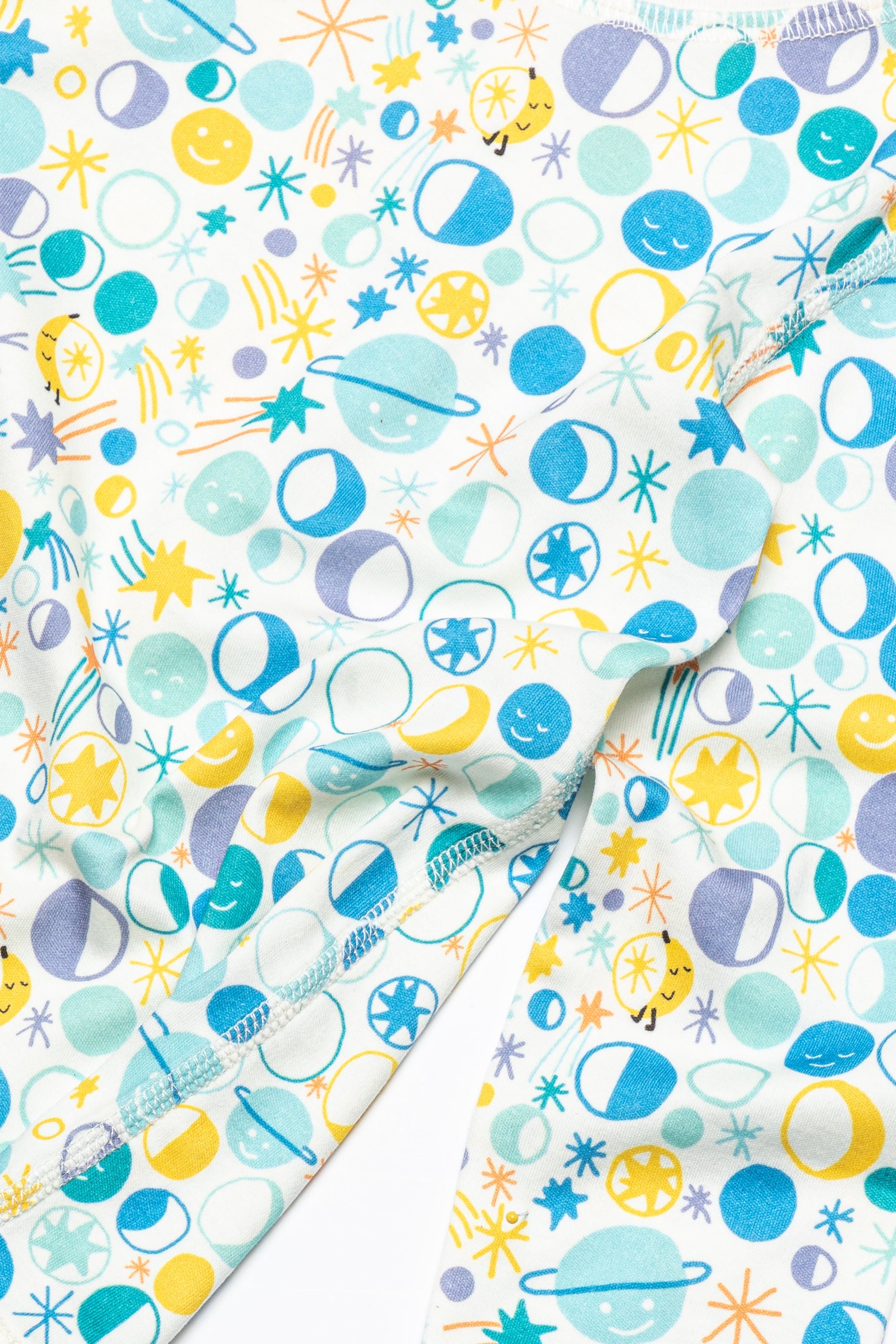 Our classic long-sleeve organic pima cotton pajama set in a new Many Moons print illustrated by Brooklyn artist and Dodo friend Rose Lazar of Cosmic Peace Studio.