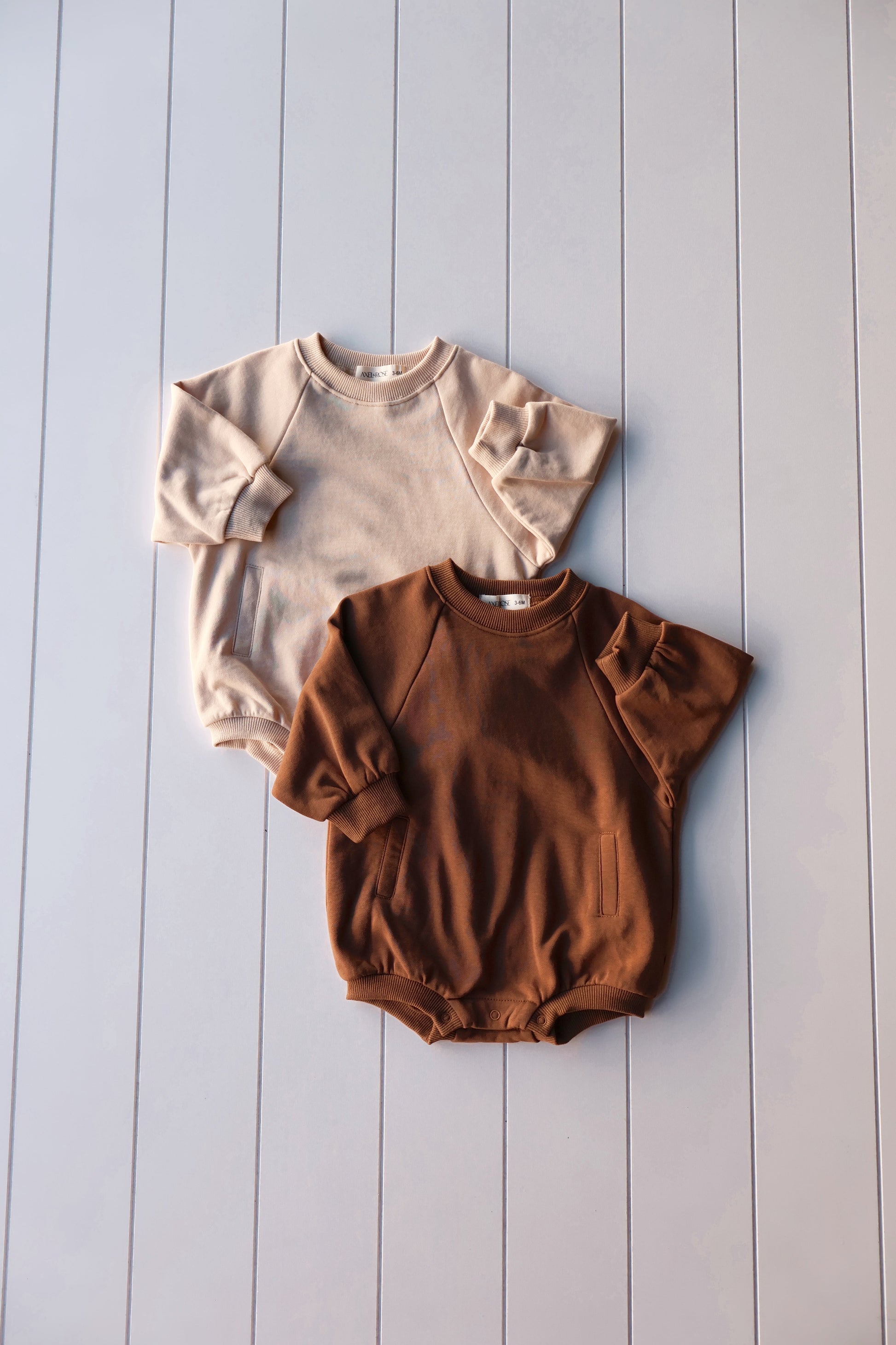 This neutral sweatshirt onesie comes in a versatile combination of beige and chocolate brown. The snap closure makes it easy to dress and the natural oversized fit provides maximum comfort. A must-have addition to your wardrobe.