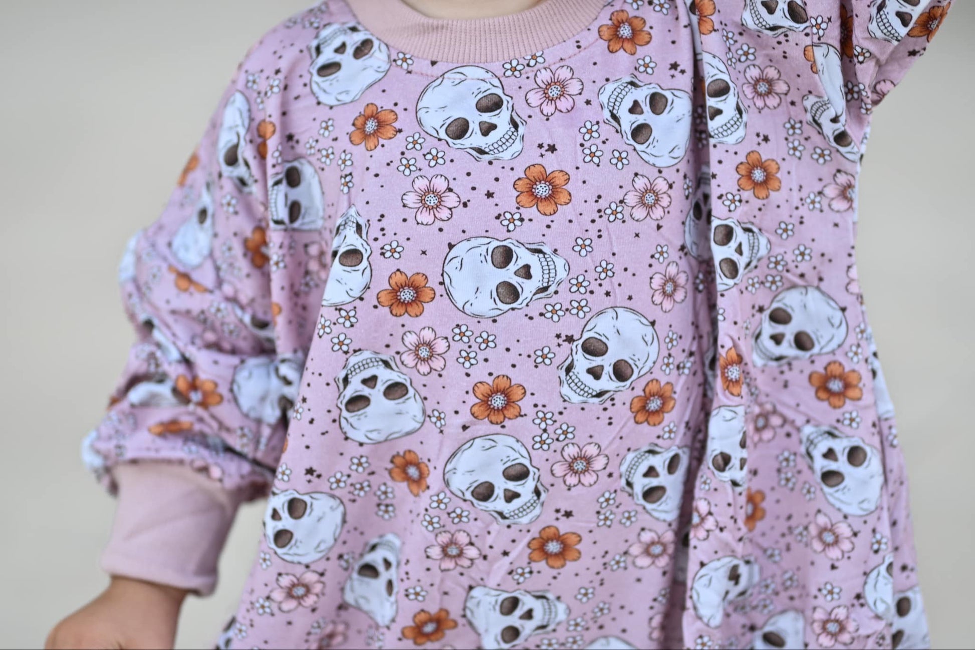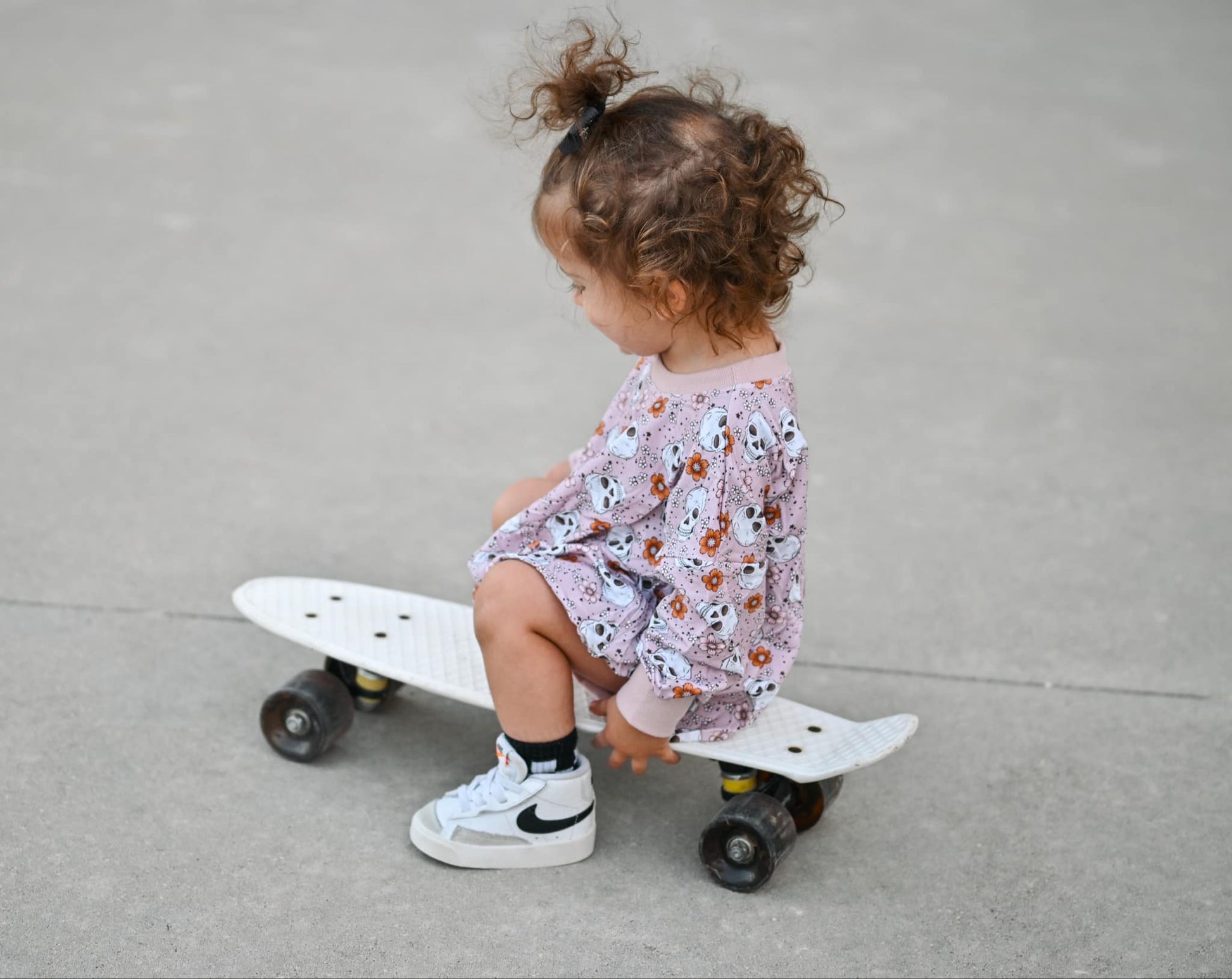 Available in sizes newborn to 2T, this romper is designed to grow with your child. The captivating purple floral skull print adds a distinctive flair, combining sweetness with a touch of rebelliousness.