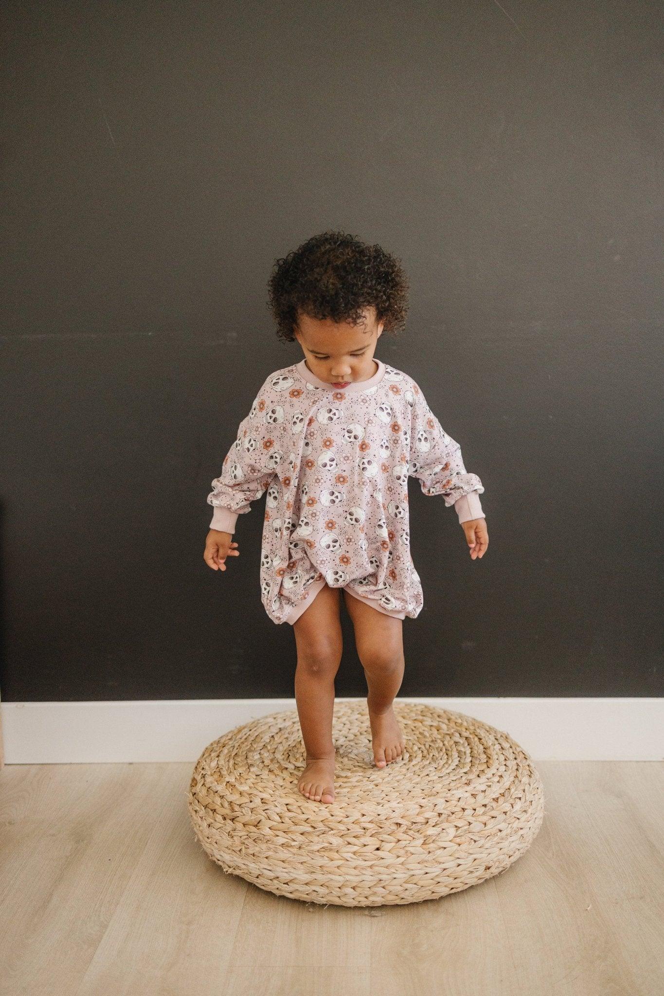 Elevate your child's comfort and style with the Purple Floral Skull Print Bamboo Bubble Romper. It's a versatile piece that merges quality, individuality, and comfort, ensuring your little one is both cozy and uniquely fashionable.