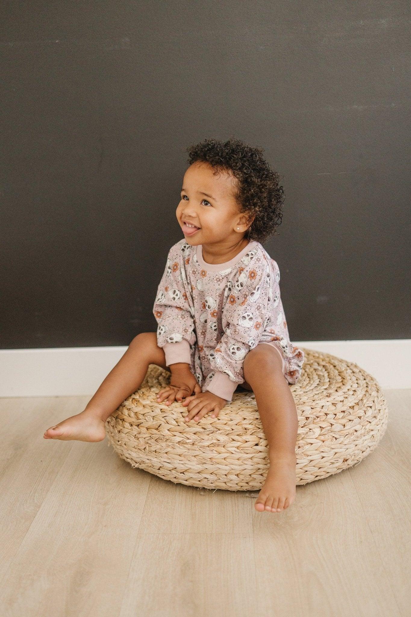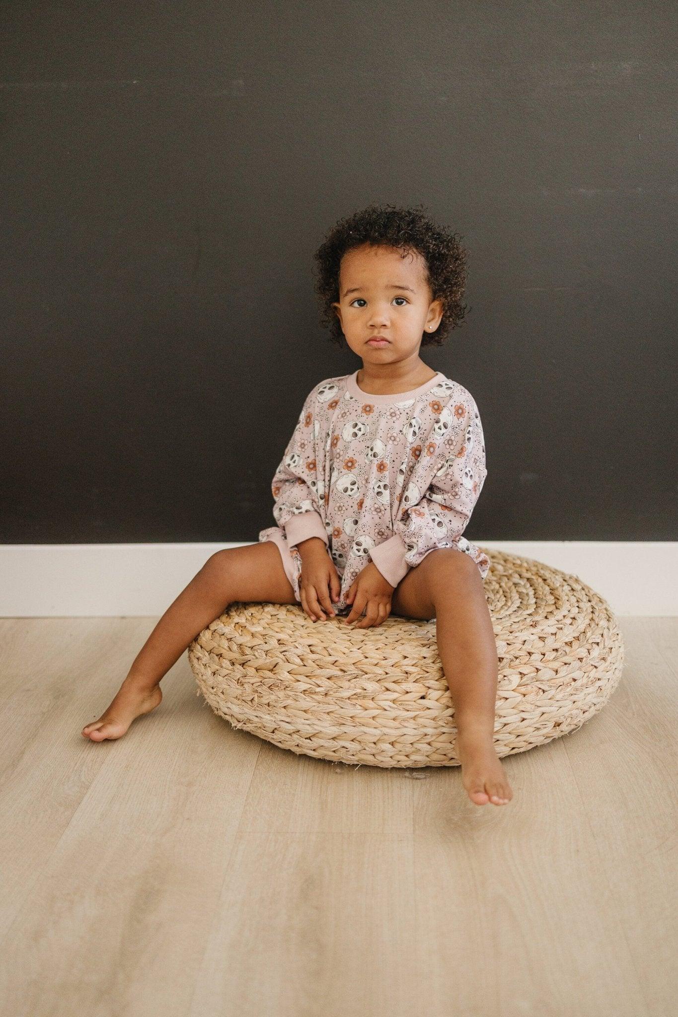 Introducing our Purple Floral Skull Print Bamboo Bubble Romper – a unique blend of style and comfort that's as edgy as it is adorable. Crafted from a premium blend of 92% bamboo viscose and 8% spandex French terry fabric, this romper offers a luxurious touch with the perfect amount of stretch.