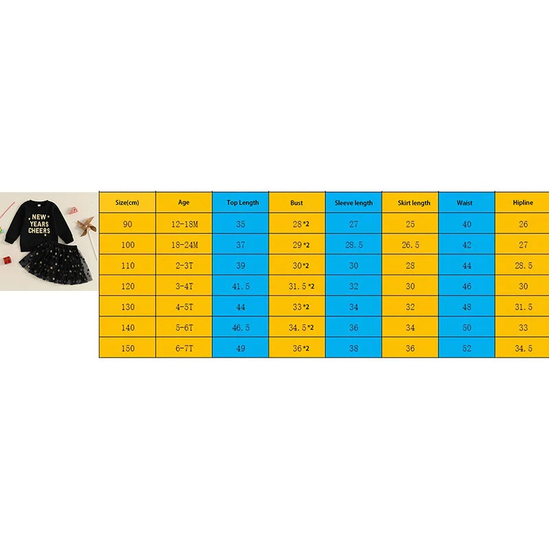 110 Tops Length: 15.35 Bust: 23.62 Sleeve: 11.81 Shoulder: 11.22 Skirt Length: 11.02 Waist: 17.32 Advised Age: 2-3 Years