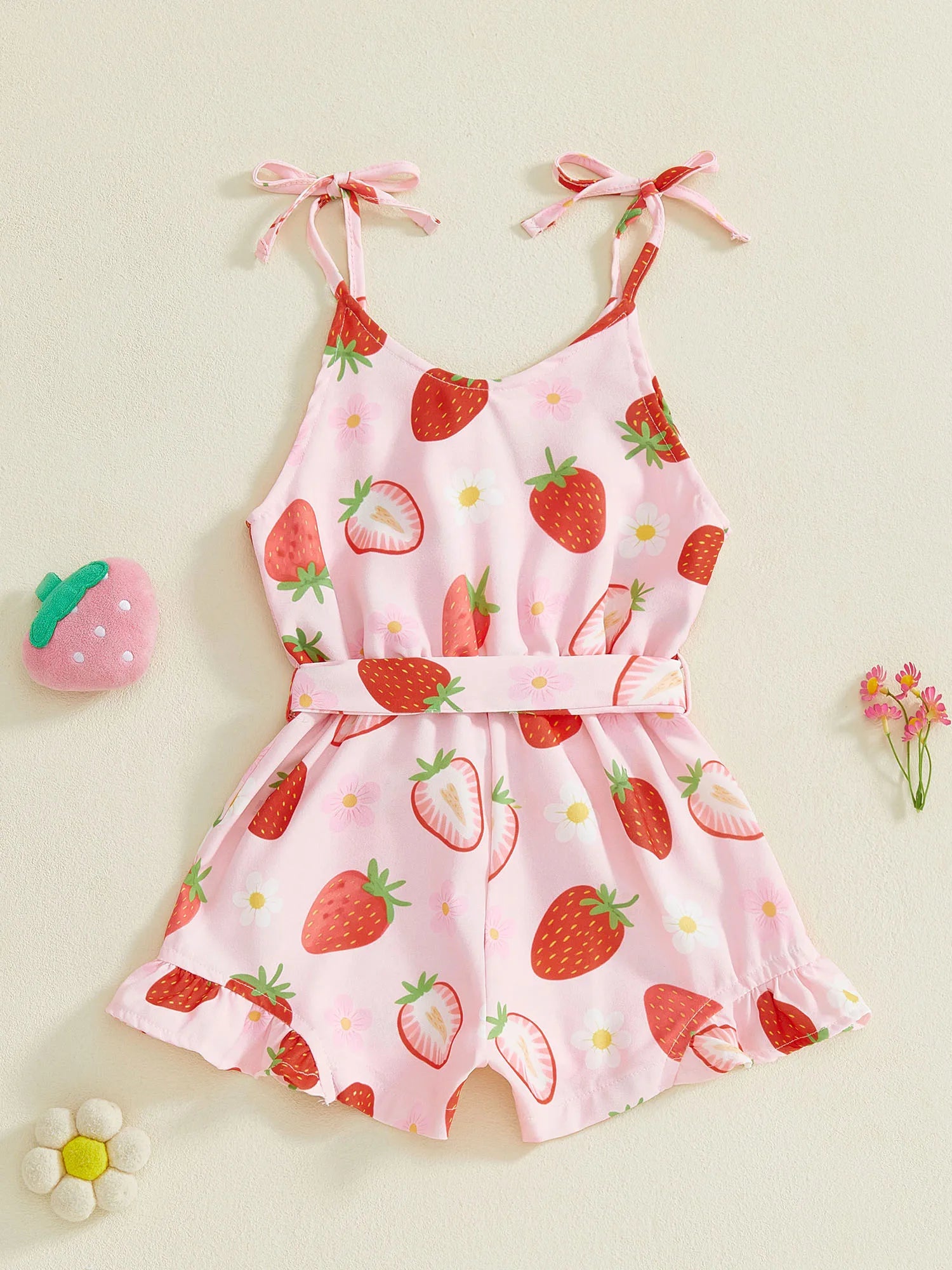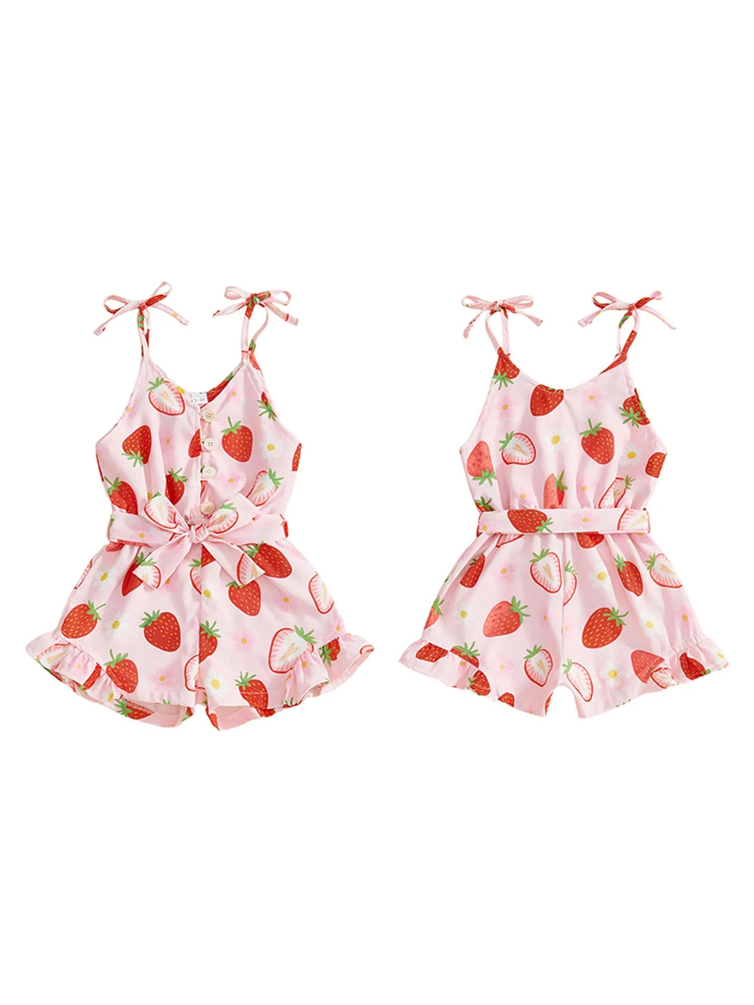 Toddler Kids Girl Summer Sleeveless Button up Strawberry Print Tie Shoulder Shorts Jumpsuit Romper