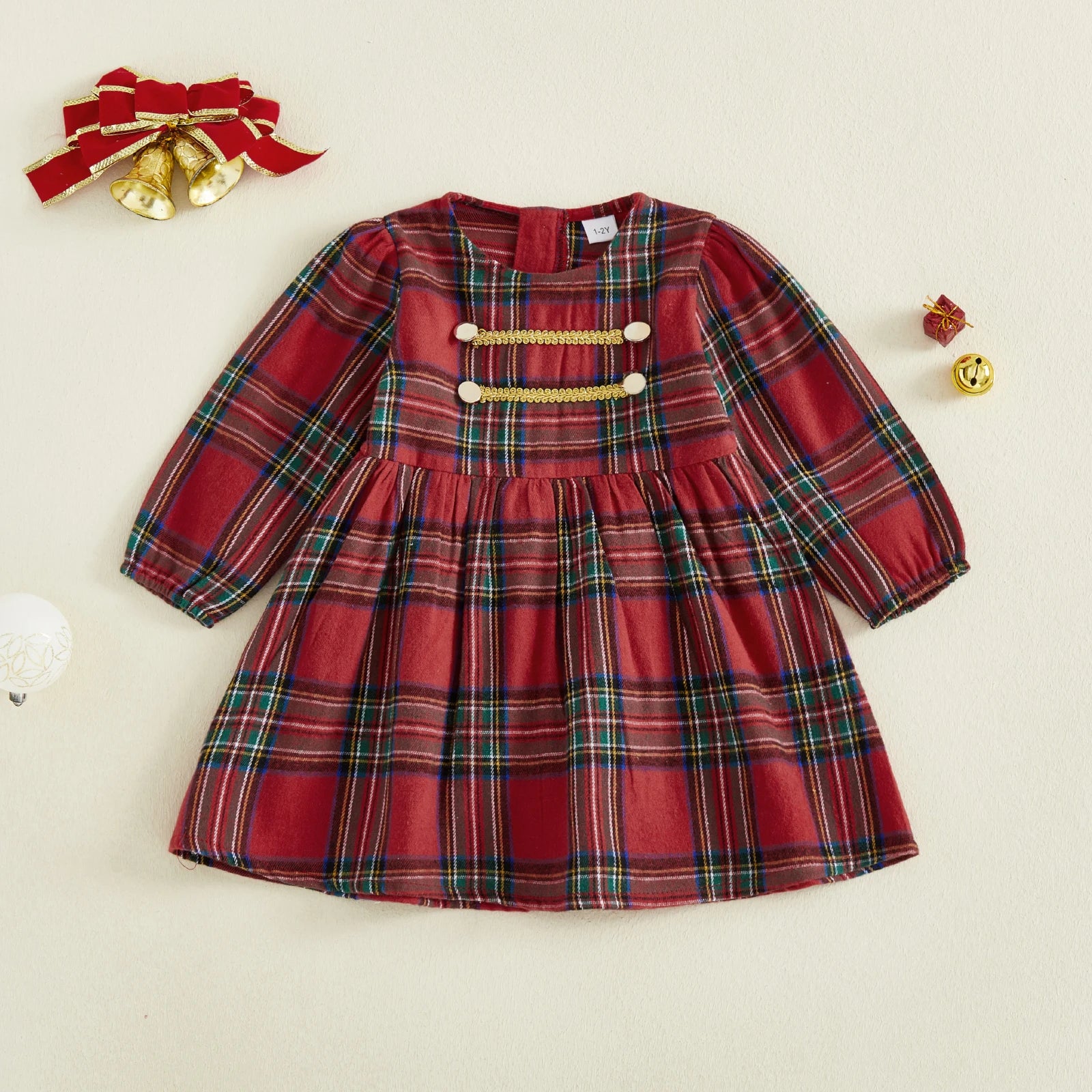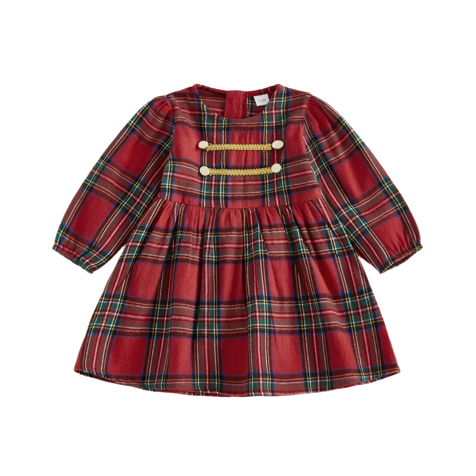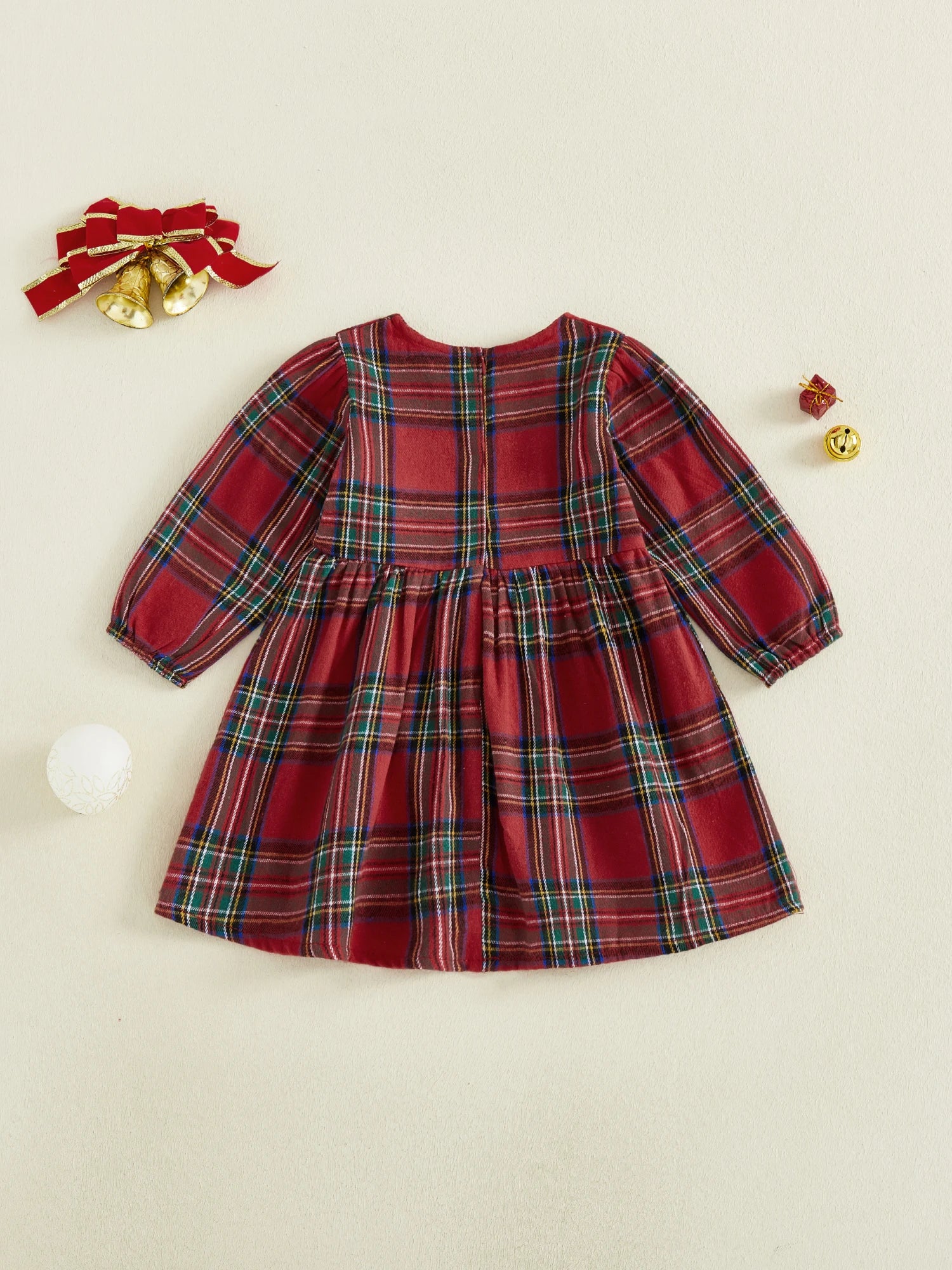 Toddler Kids Girls Sweet Plaid Dress Christmas Long Puff Sleeve Round Neck A-line Dress