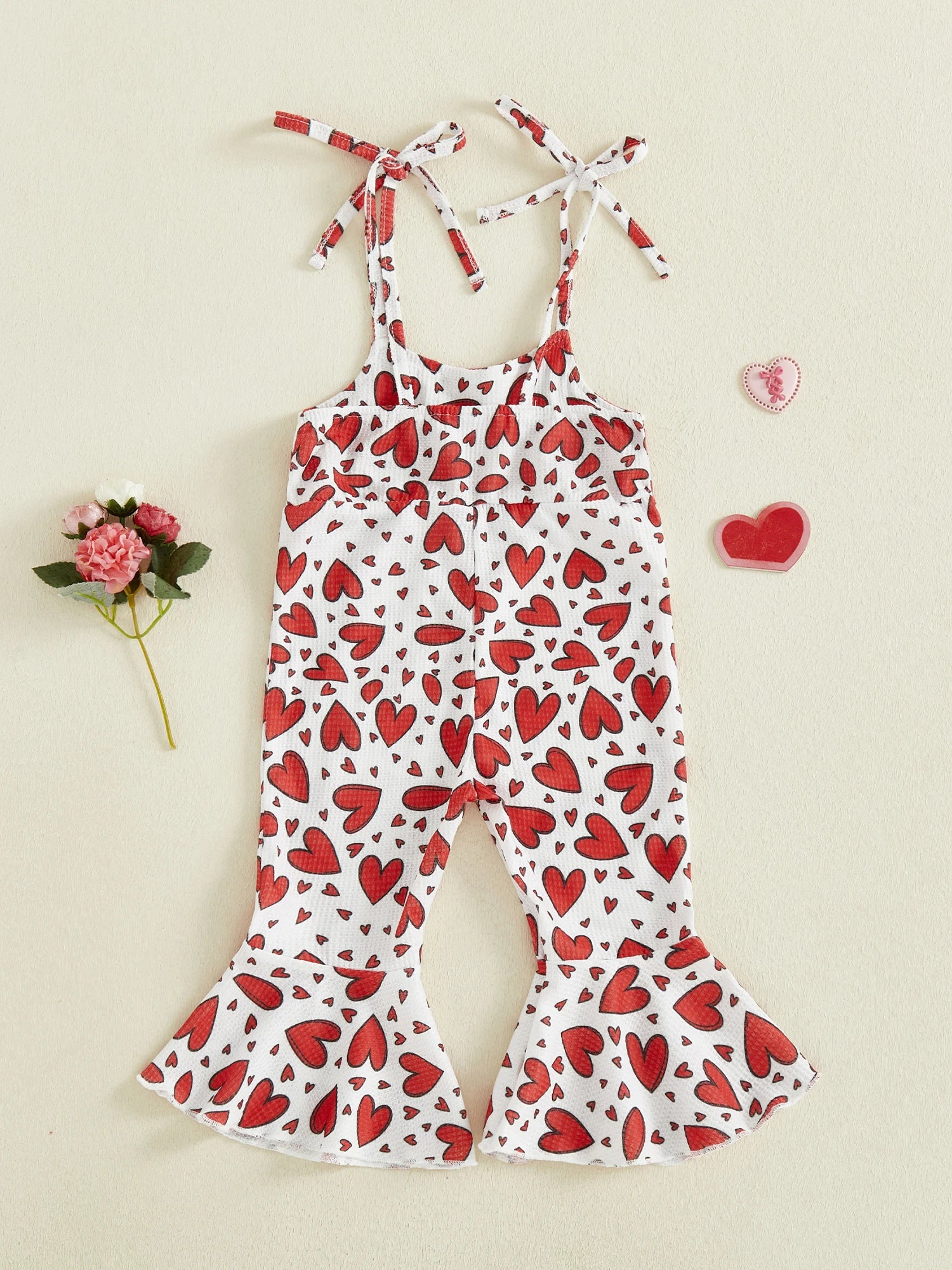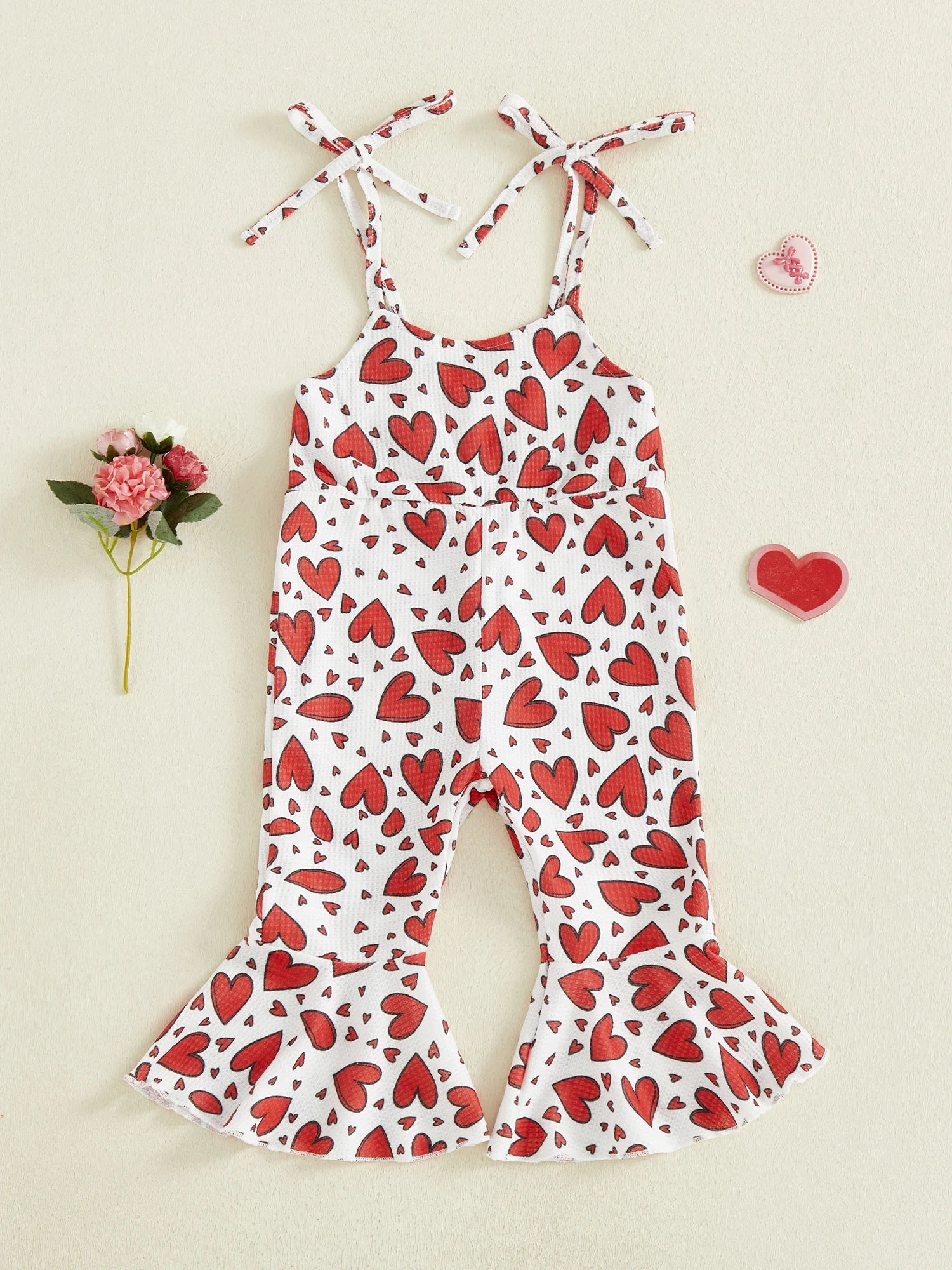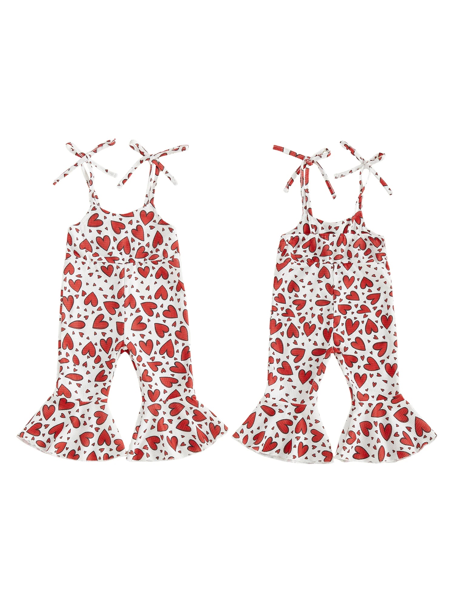 Toddler Kids Girls Valentine's Day Jumpsuit Sleeveless Tie Shoulder Straps Heart Print Romper Bell Bottoms
