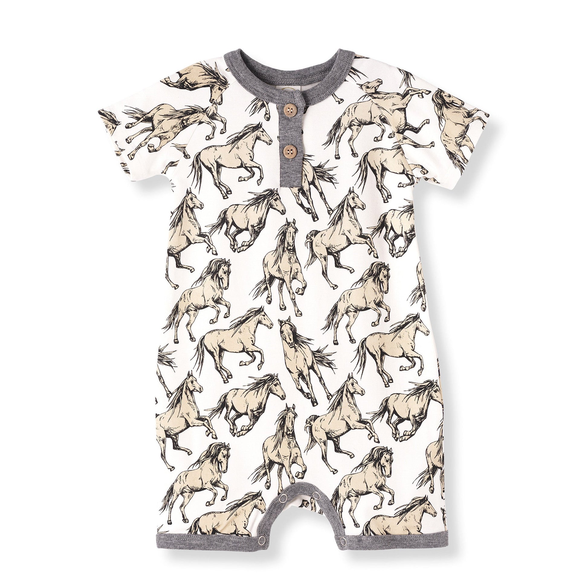 Our soft and cozy short Henley romper features a lively print of wild horses, perfect for little adventurers! Crafted from a breathable bamboo-cotton-spandex blend, it’s absorbent, hypoallergenic, and eco-friendly. With front buttons and snap closures underneath, dressing is a breeze. Just wash warm, tumble dry low, and let the fun begin! 🐎