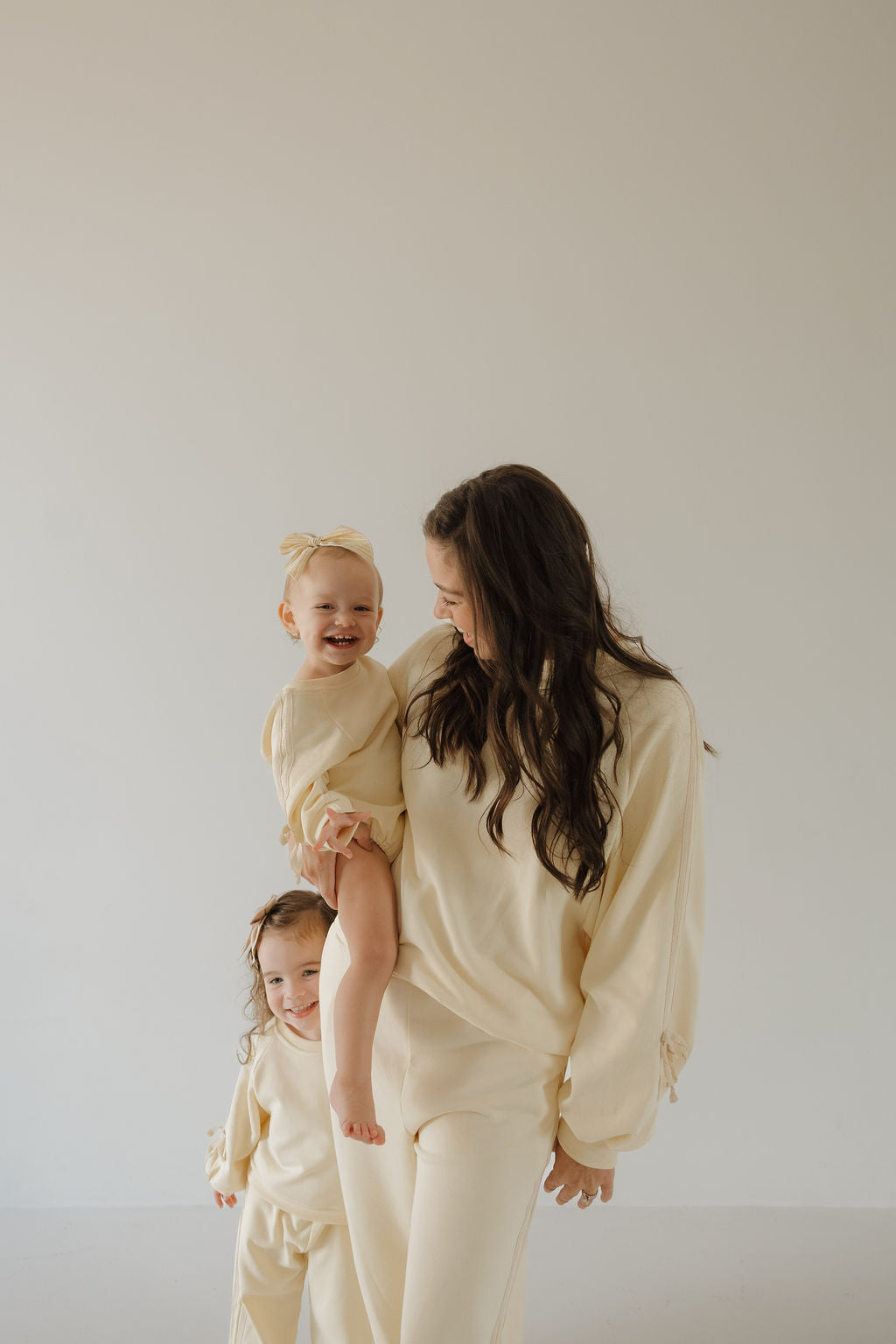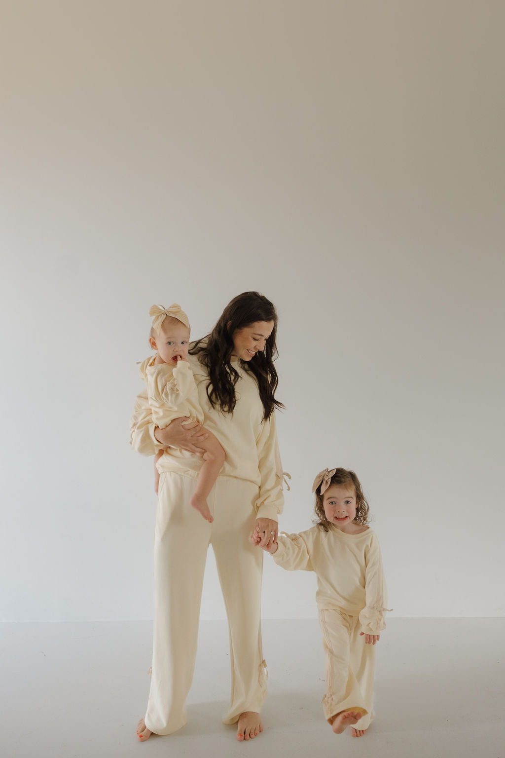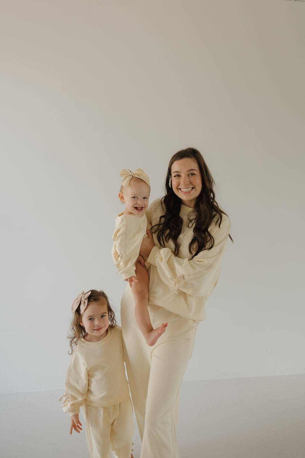 Your everyday go-to, this women’s sweat set is designed for comfort, style, and versatility. Finished with subtle bow details, it’s perfect for running errands, lounging at home, or casual outings—a staple you’ll reach for again and again. Don’t forget to check out the matching children’s set and coordinating baby rompers to complete the look.