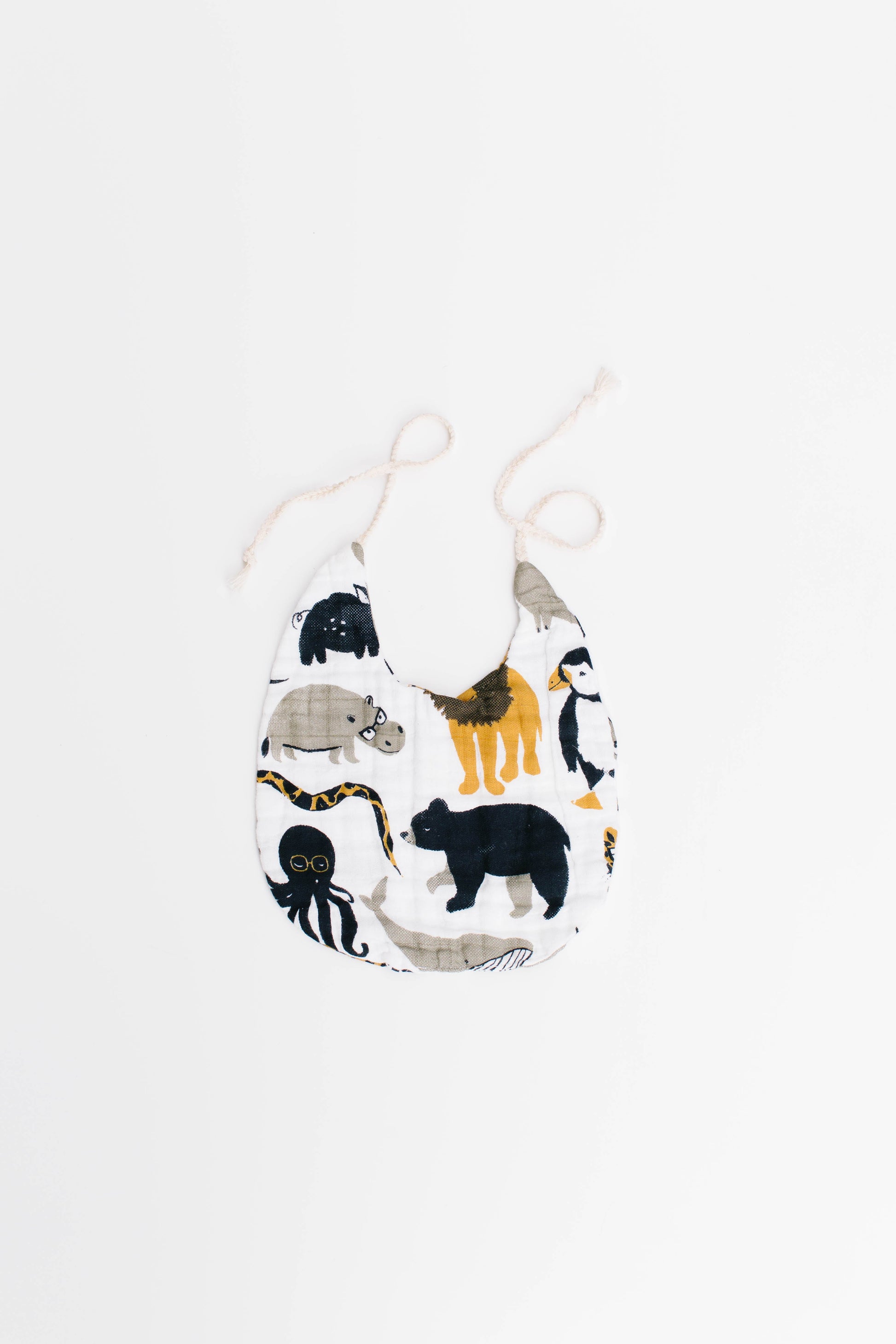 Pack includes two bibs. One Zoology print and one Specs print.